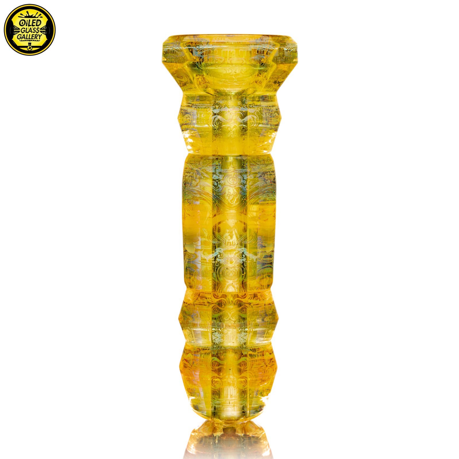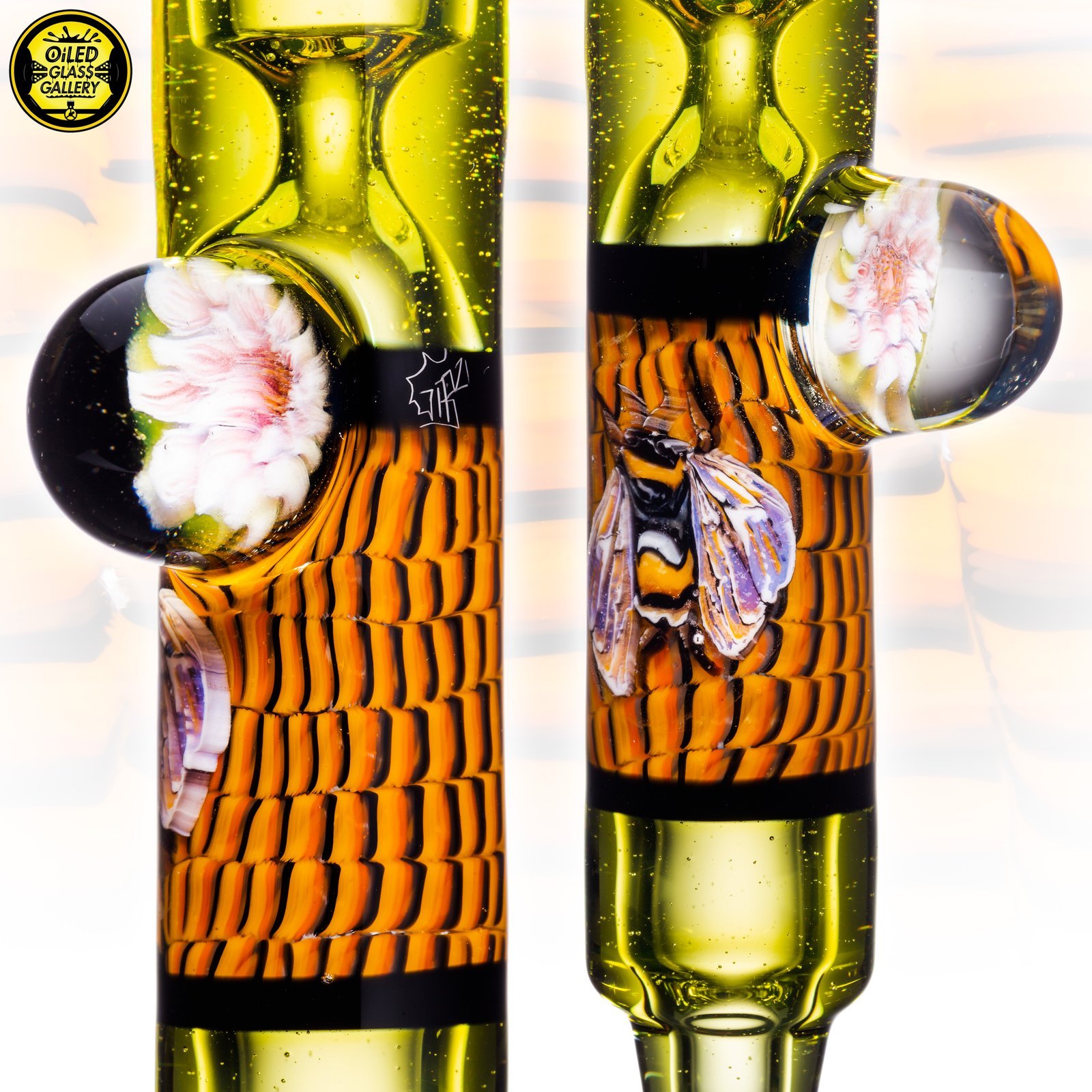 2021 4in Onnie/Chillum made of Molten Aura Moonstone with zanfrico twist cane center section featuring Zen Sun and Owl millefiori and an encased opal mib.
