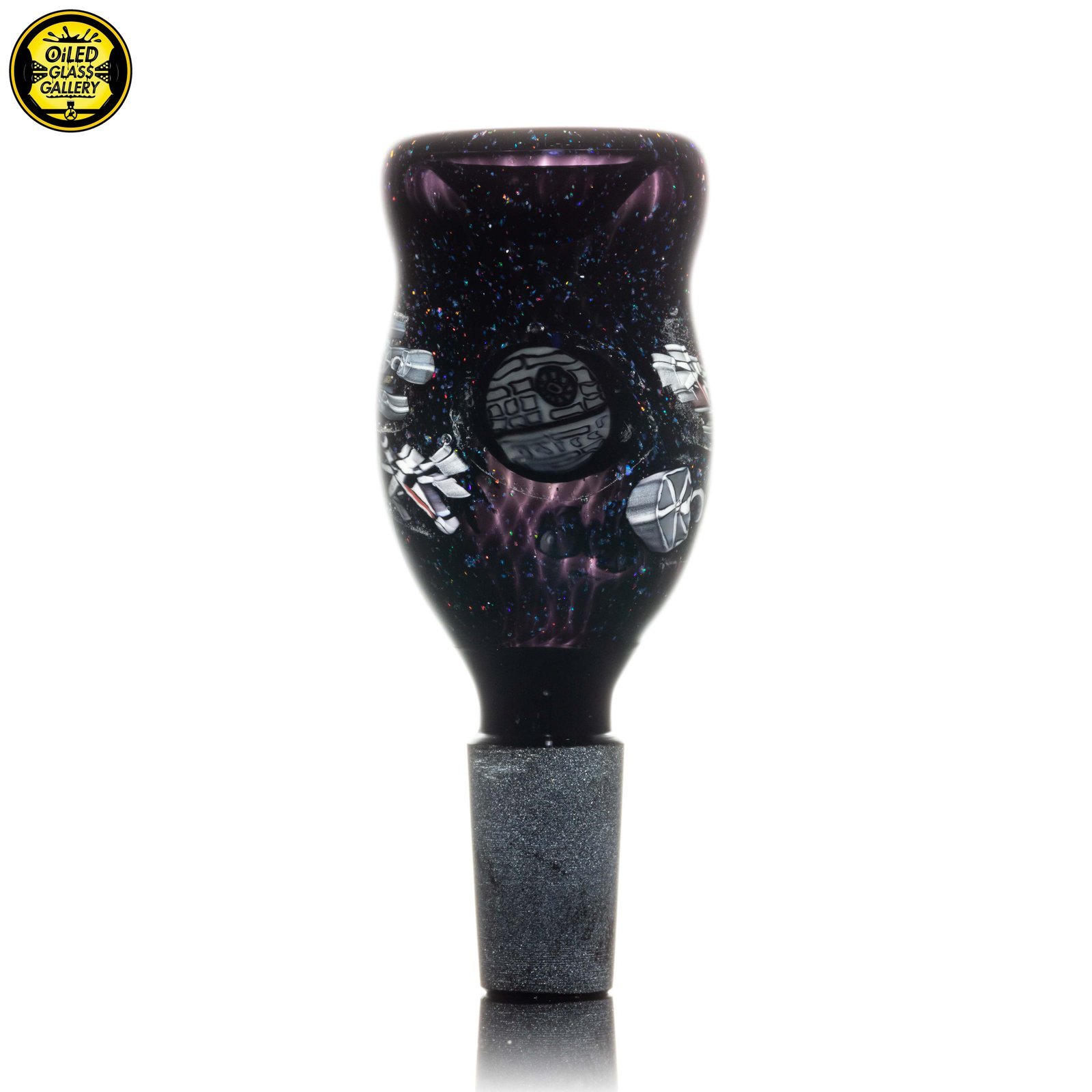 2023 14mm Star Wars Millefiori 1-hole Slide made of all Northstar Glass Jet Black with crushed opal featuring 14 encased X-Wing, Tie-Bomber, Deathstar and Moon millefiori.