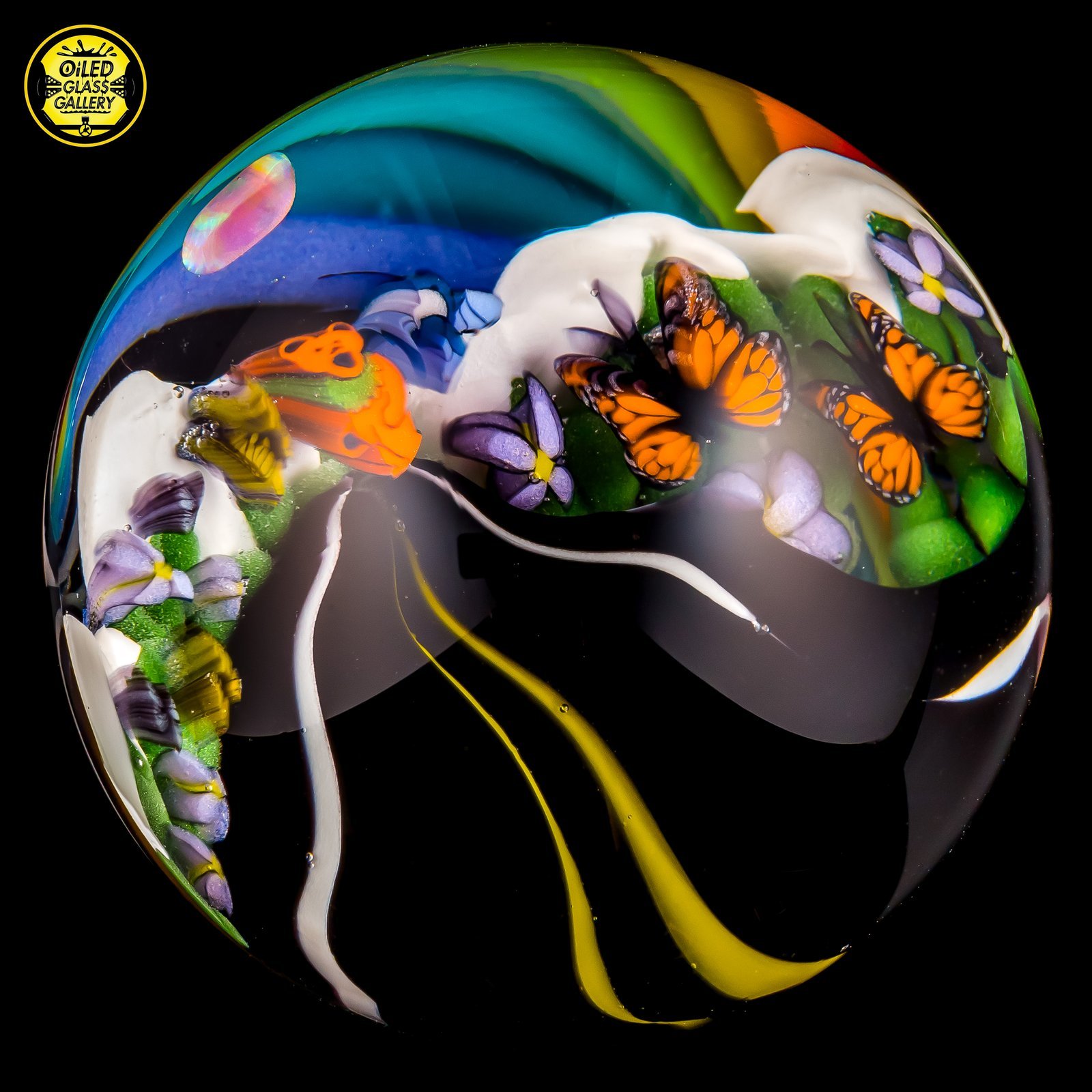 2020 39mm/1.53in UV BFF Hand and Eye Millefiori Implosion Marble made of custom UV mix and beautiful Trautman Art Glass Heavy Blue Leprechaun dotstack on the backside.