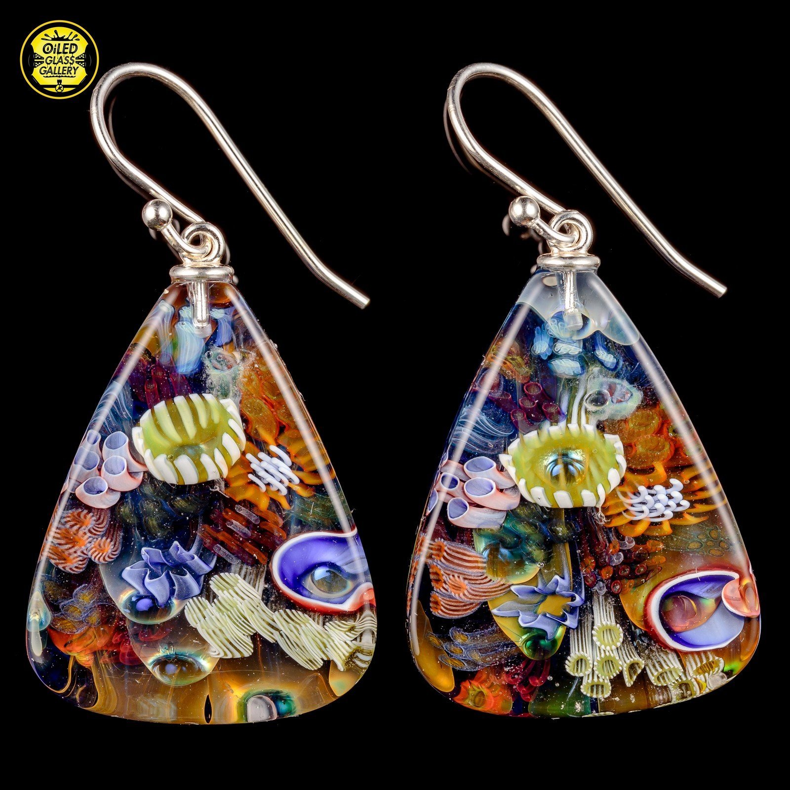 2020 1.25in x 1in Tide Pool Millefiori earrings. He first makes each component on the torch as an individual cane, known as a murrini, which are “pictures in glass.” He then slices and polishes each murrini cane to meld the slices of design into the molten glass Millefiori pattern. He then fumes 24k gold and .999 silver onto the back of the glass to add color, reflectivity and dimension. Dark cobalt blue glass is the final step in assembling the “bar” of design. Gold and Silver are finally fumed onto the back of the glass. After annealing, he hand cuts and polishes each pair of earrings which are then mounted on sterling silver findings. There is no mechanization involved so each pair is truly one of a kind and hand made.