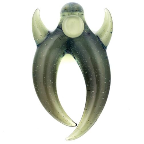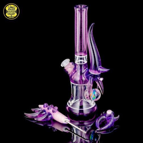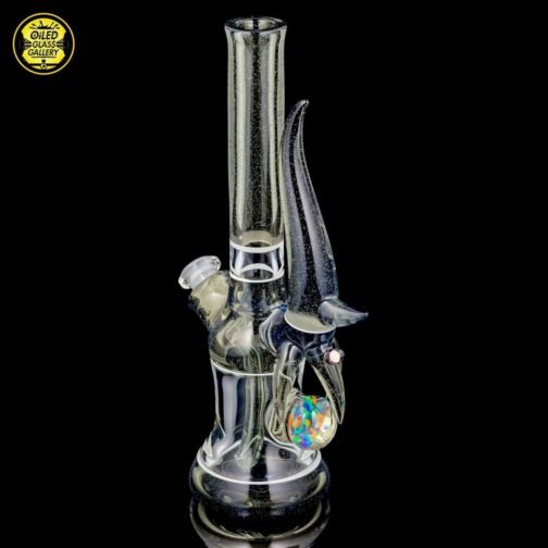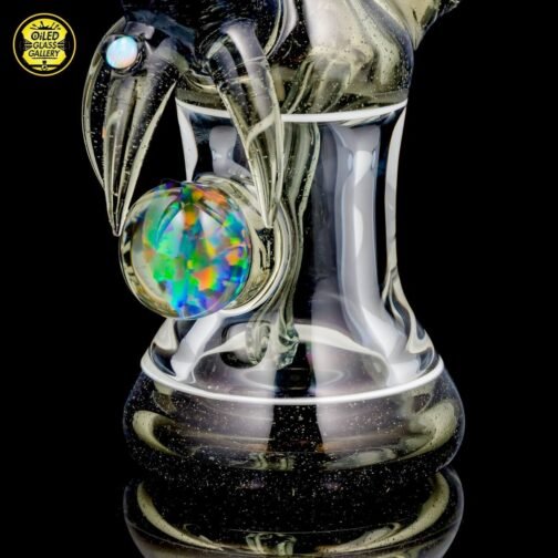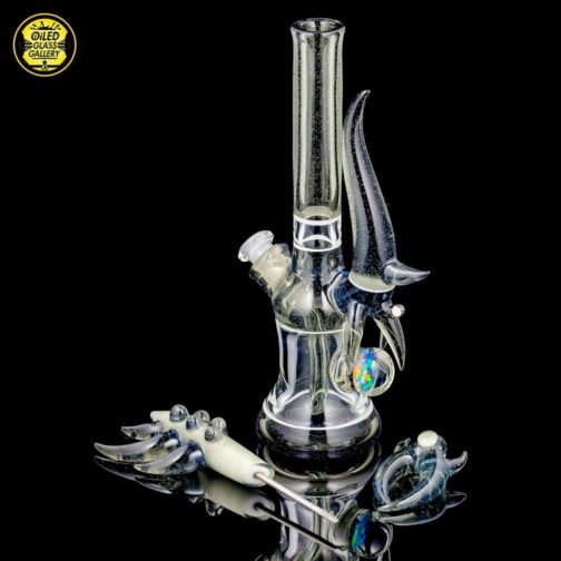 2016 10mm 8.25in CFL Horned Clear Window Tube made of Gannett Glass Color Blue Medusa with white lip wraps featuring a 10mm round opal encased mib and a 2.5mm sphere opal attached to the back, a matching removable 10mm 2-hole downstem, a matching pendant, and a matching titanium tipped dabber, all shipped in a Pelican.
