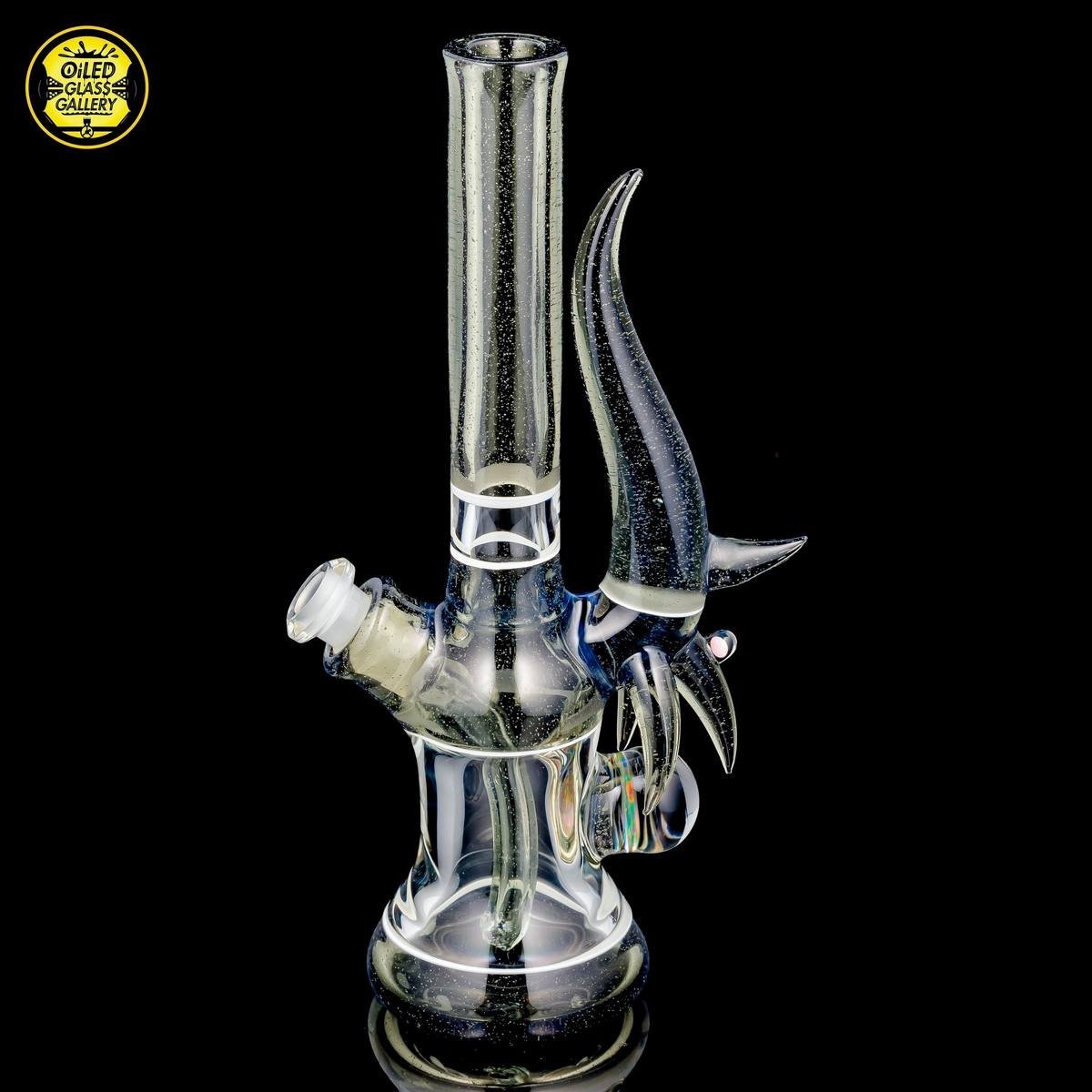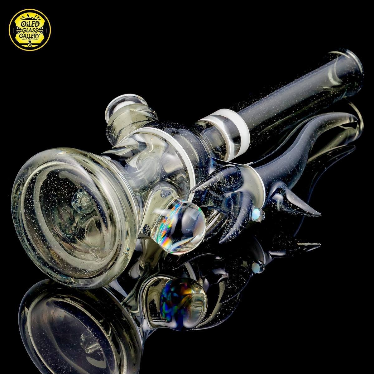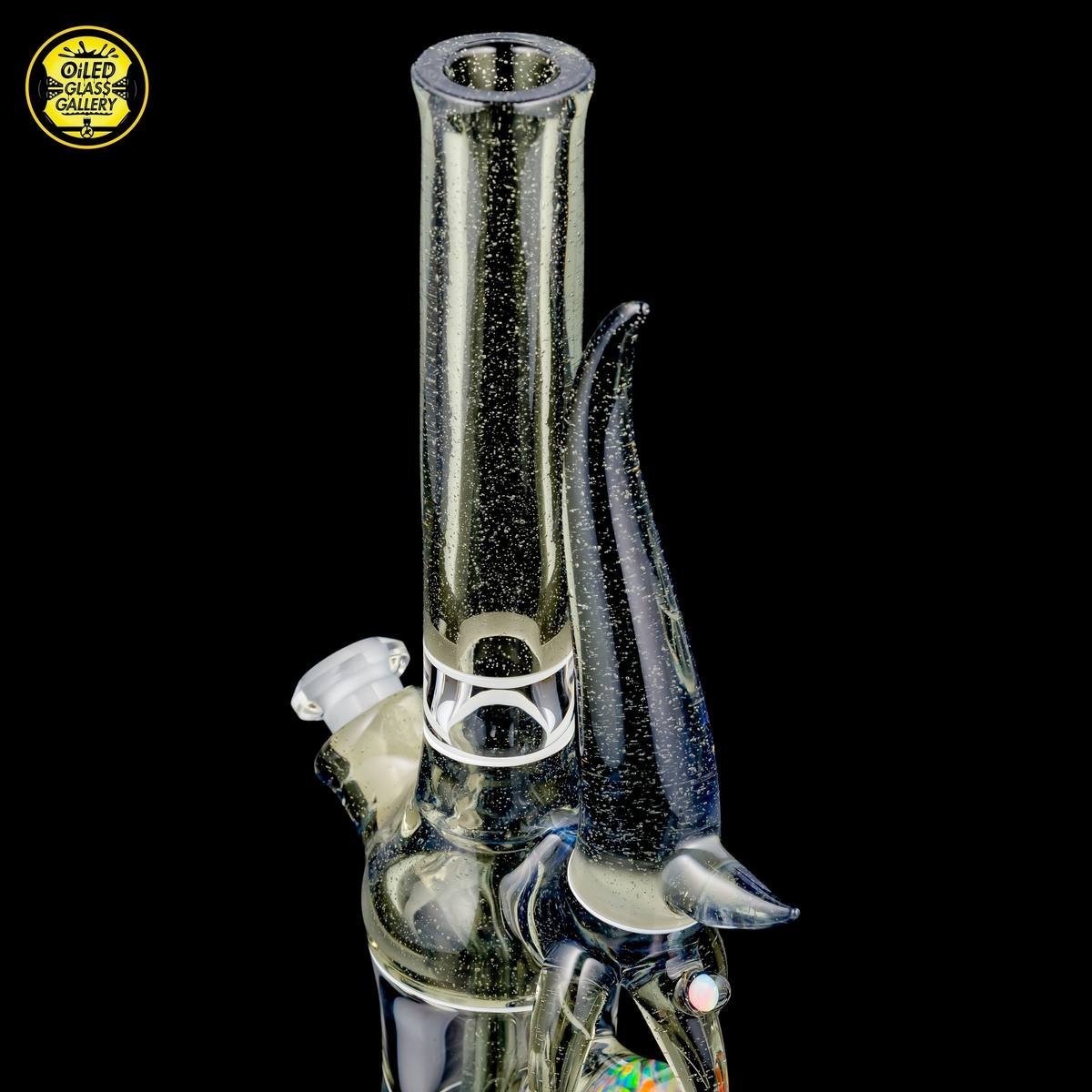2016 10mm 8.25in CFL Horned Clear Window Tube made of Gannett Glass Color Blue Medusa with white lip wraps featuring a 10mm round opal encased mib and a 2.5mm sphere opal attached to the back, a matching removable 10mm 2-hole downstem, a matching pendant, and a matching titanium tipped dabber, all shipped in a Pelican.