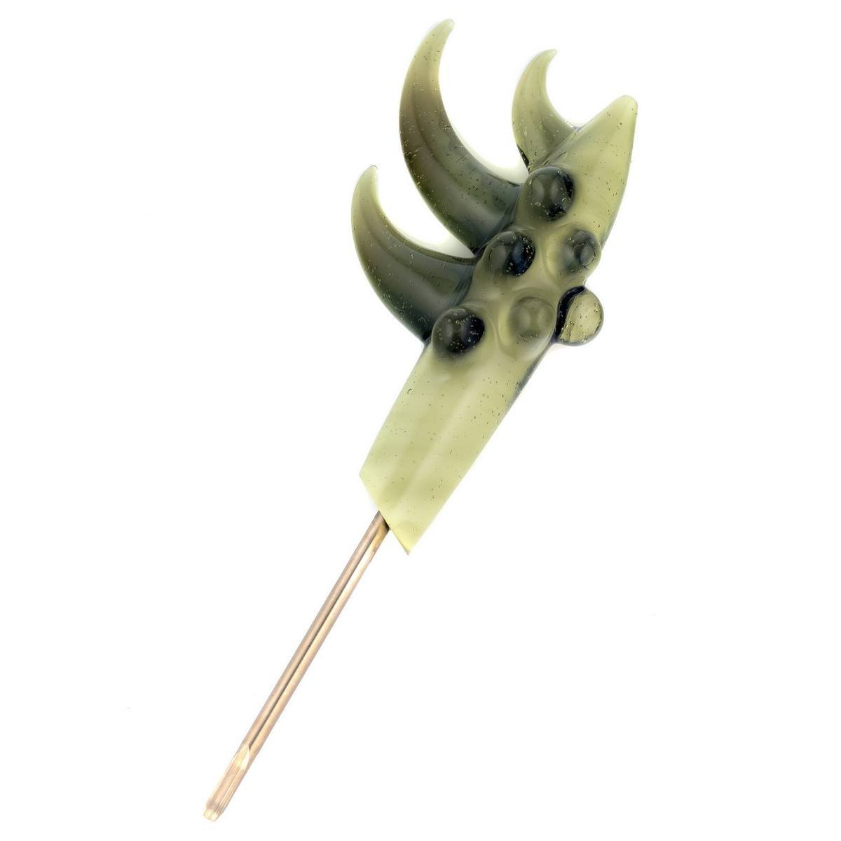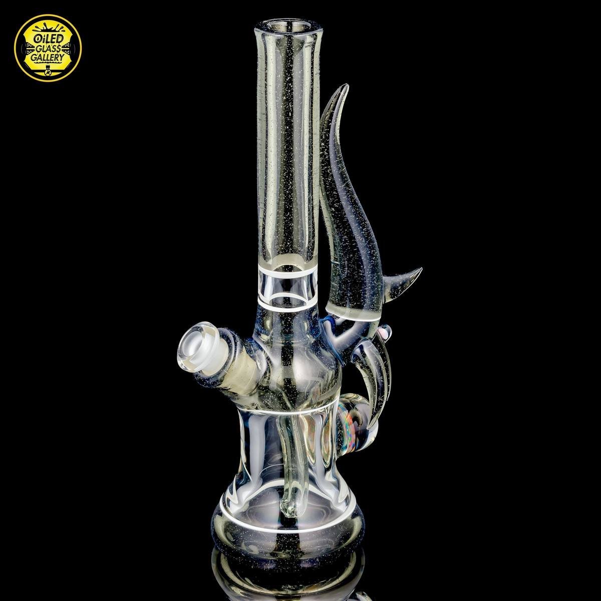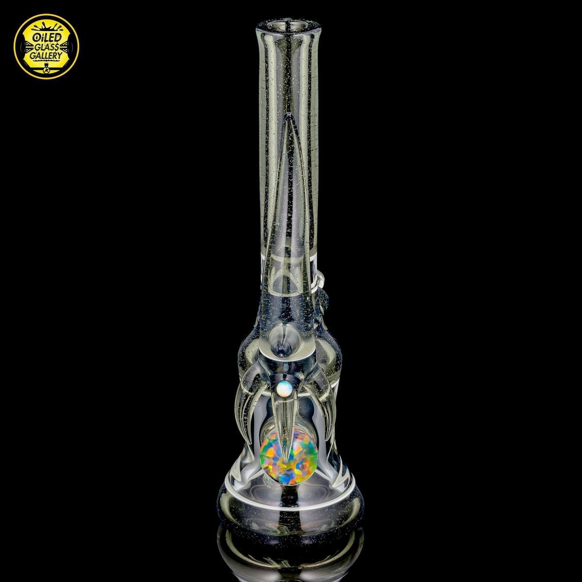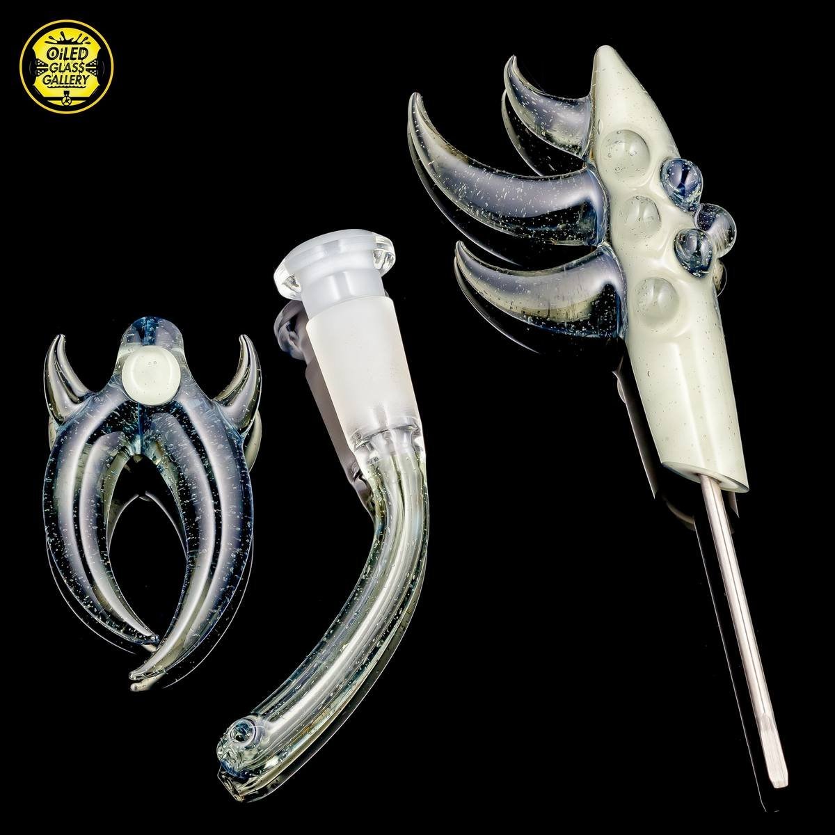 2016 10mm 8.25in CFL Horned Clear Window Tube made of Gannett Glass Color Blue Medusa with white lip wraps featuring a 10mm round opal encased mib and a 2.5mm sphere opal attached to the back, a matching removable 10mm 2-hole downstem, a matching pendant, and a matching titanium tipped dabber, all shipped in a Pelican.