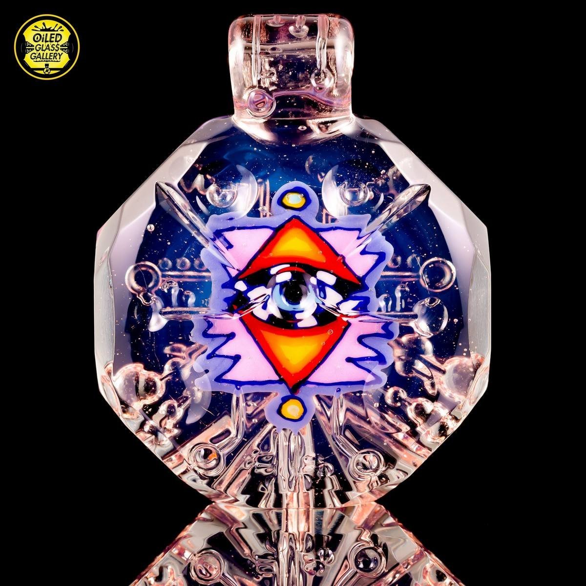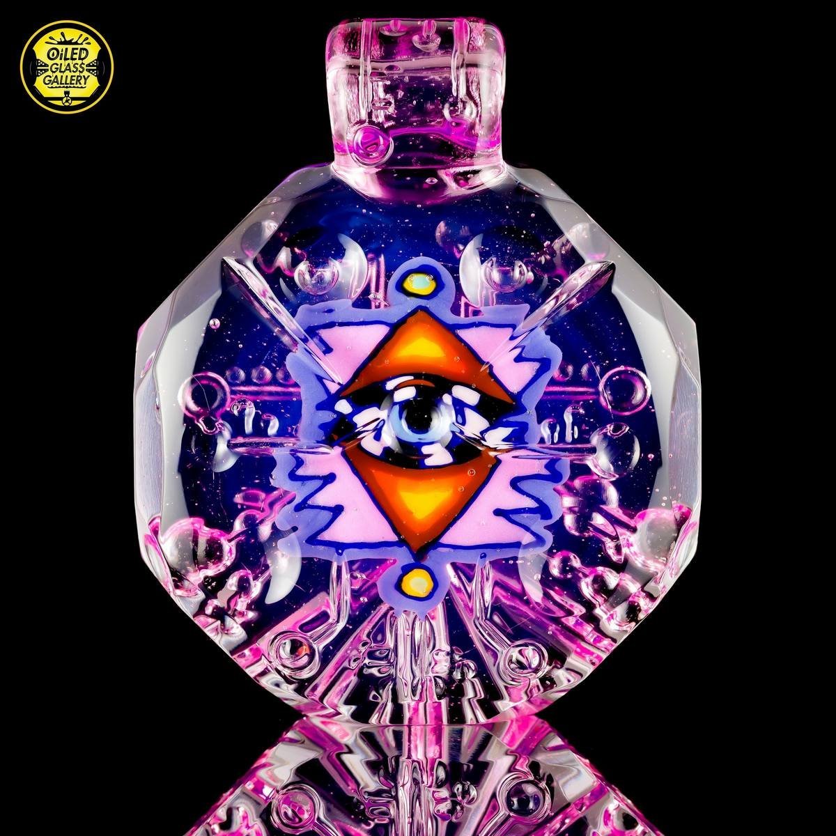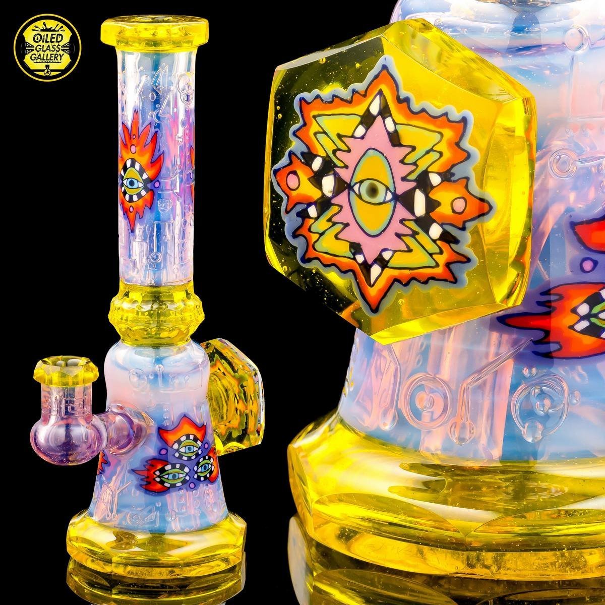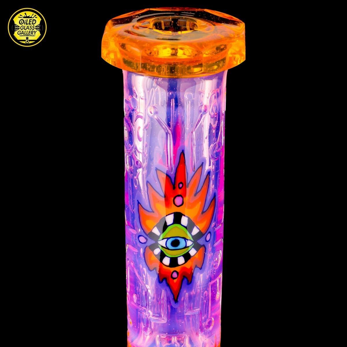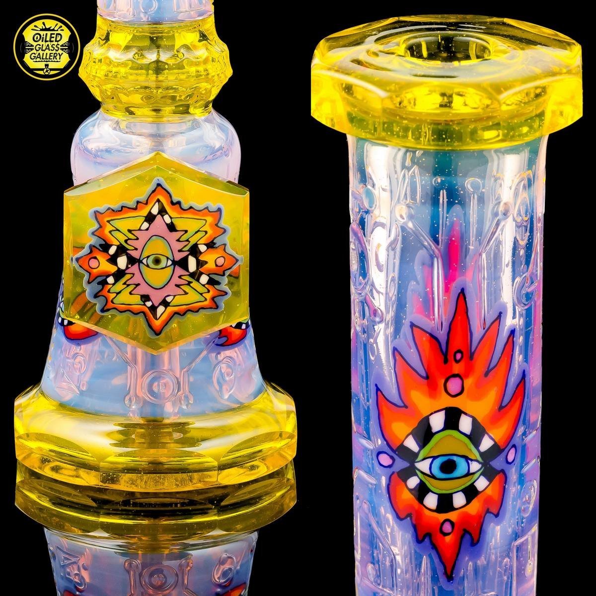 2018 10mm 8.5in CFL Terps x Voodoo “3rd Eye” Tube set from the facet king Murdoc Glass and flip god BMFT. This piece represents visions they both had and were able to pull out of their hearts and minds put into this piece. Made over multiple hot and cold working sessions out of Glass Alchemy Voodoo and Terps. They both shared assembly and cold working duties and came out with this awesome result. This piece will come with a matching CFL Voodoo faceted pendant and comes shipped in an Orange Pelican 1400 case.