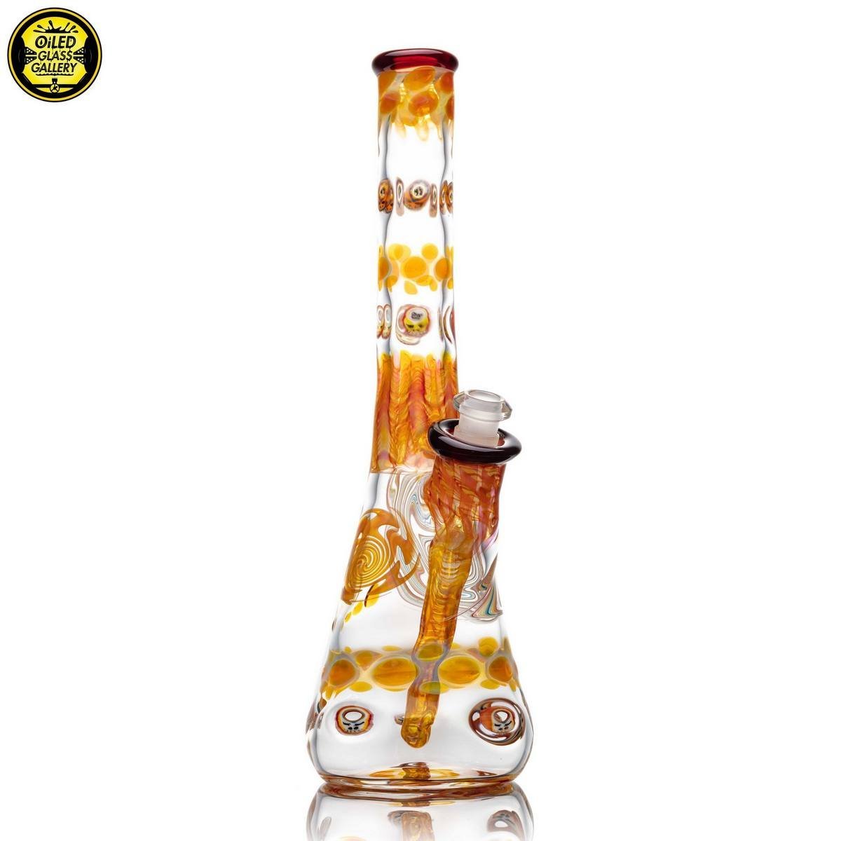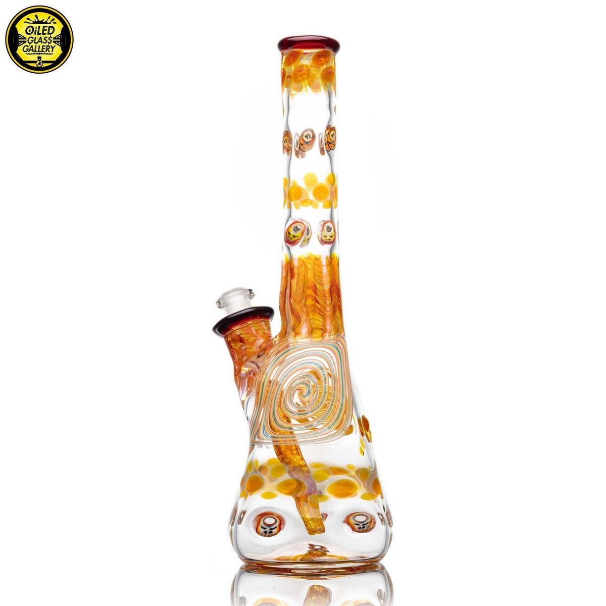 2021 10mm 9.5in Clear Fumed Rainbow linework Skull Millefiori Beaker Tube with Red Elvis lipwraps. Features a matching fumed 3-hole removable downstem and 14 embedded skull millefiori.
