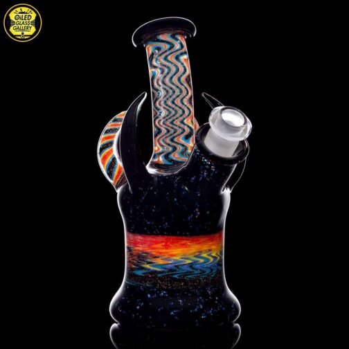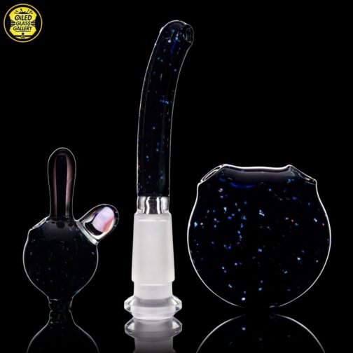 2020 10mm 5.5in Crushed Opal Dichroic Rainbow Linework Tube set featuring an encased opal mounted on the back. This set comes with a matching downstem, bubble cap with encased opal, and a pendant.