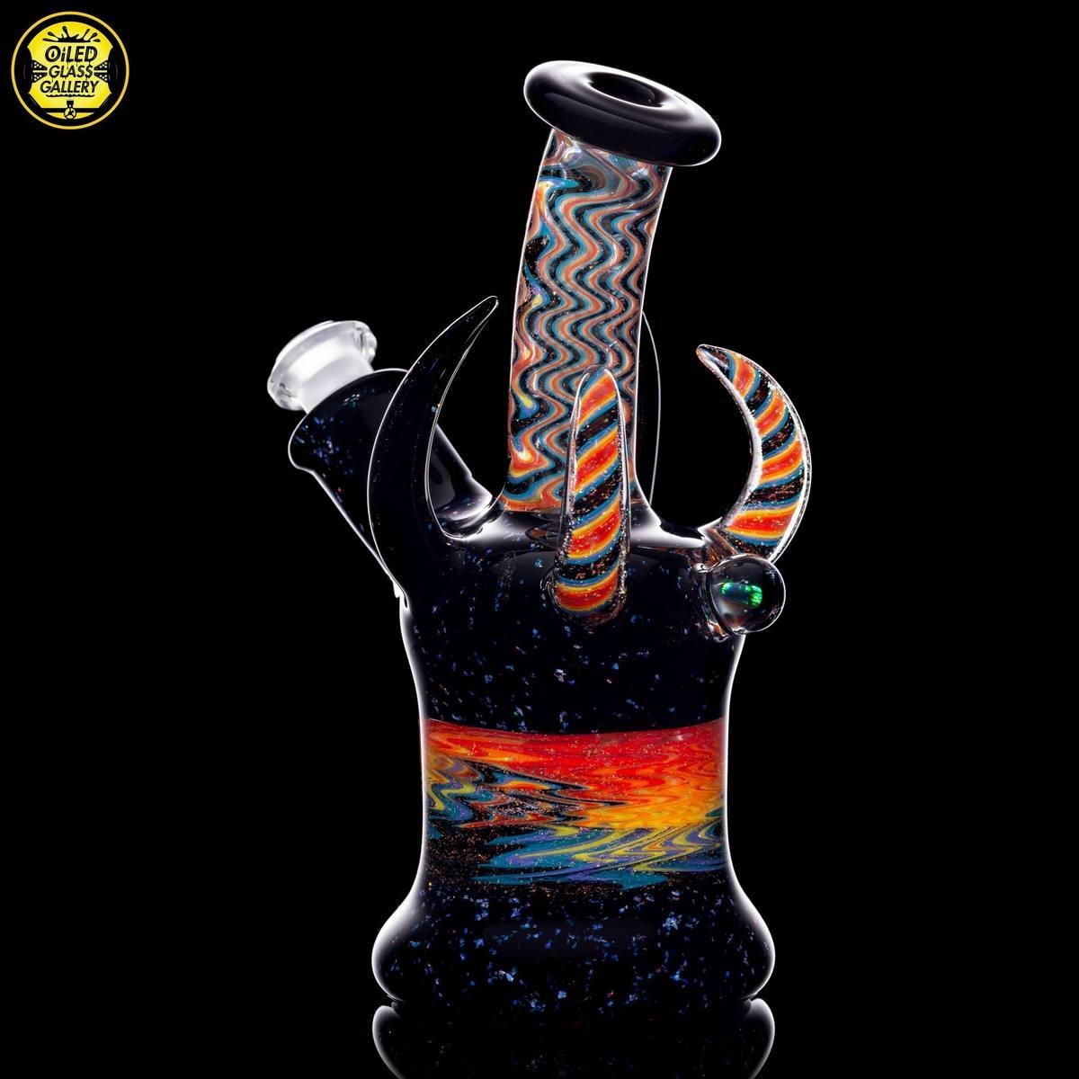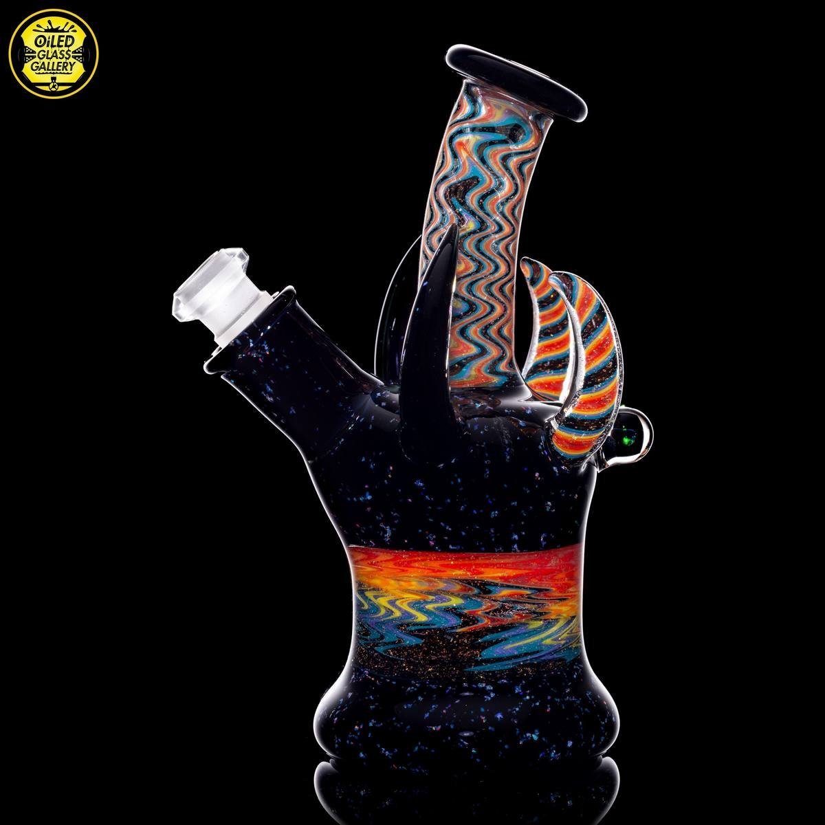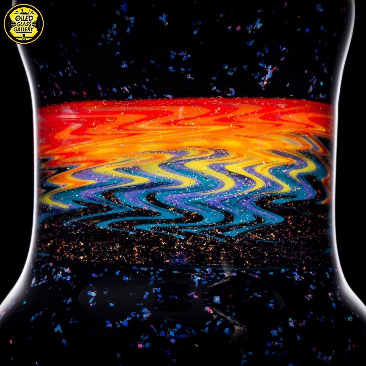 2020 10mm 5.5in Crushed Opal Dichroic Rainbow Linework Tube set featuring an encased opal mounted on the back. This set comes with a matching downstem, bubble cap with encased opal, and a pendant.