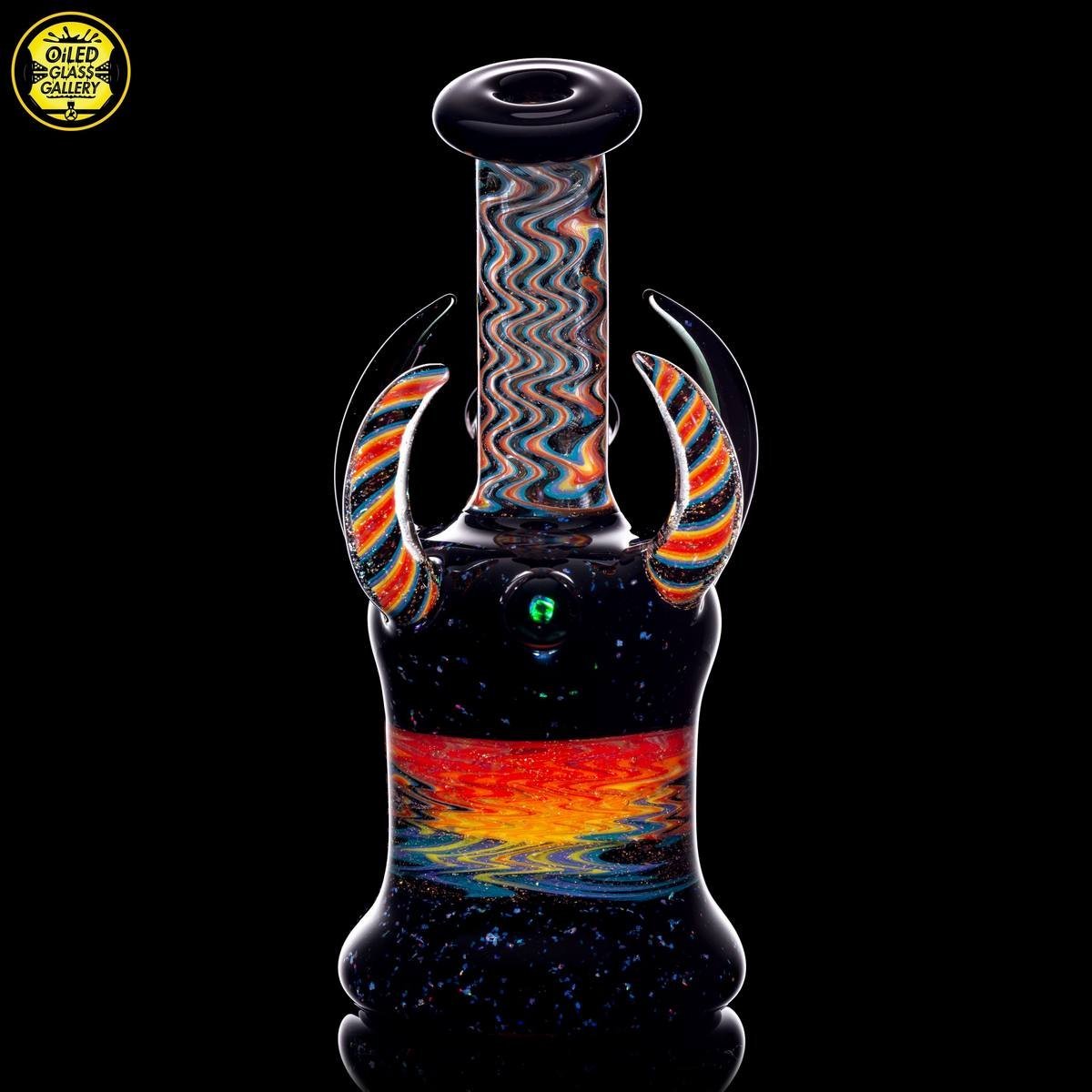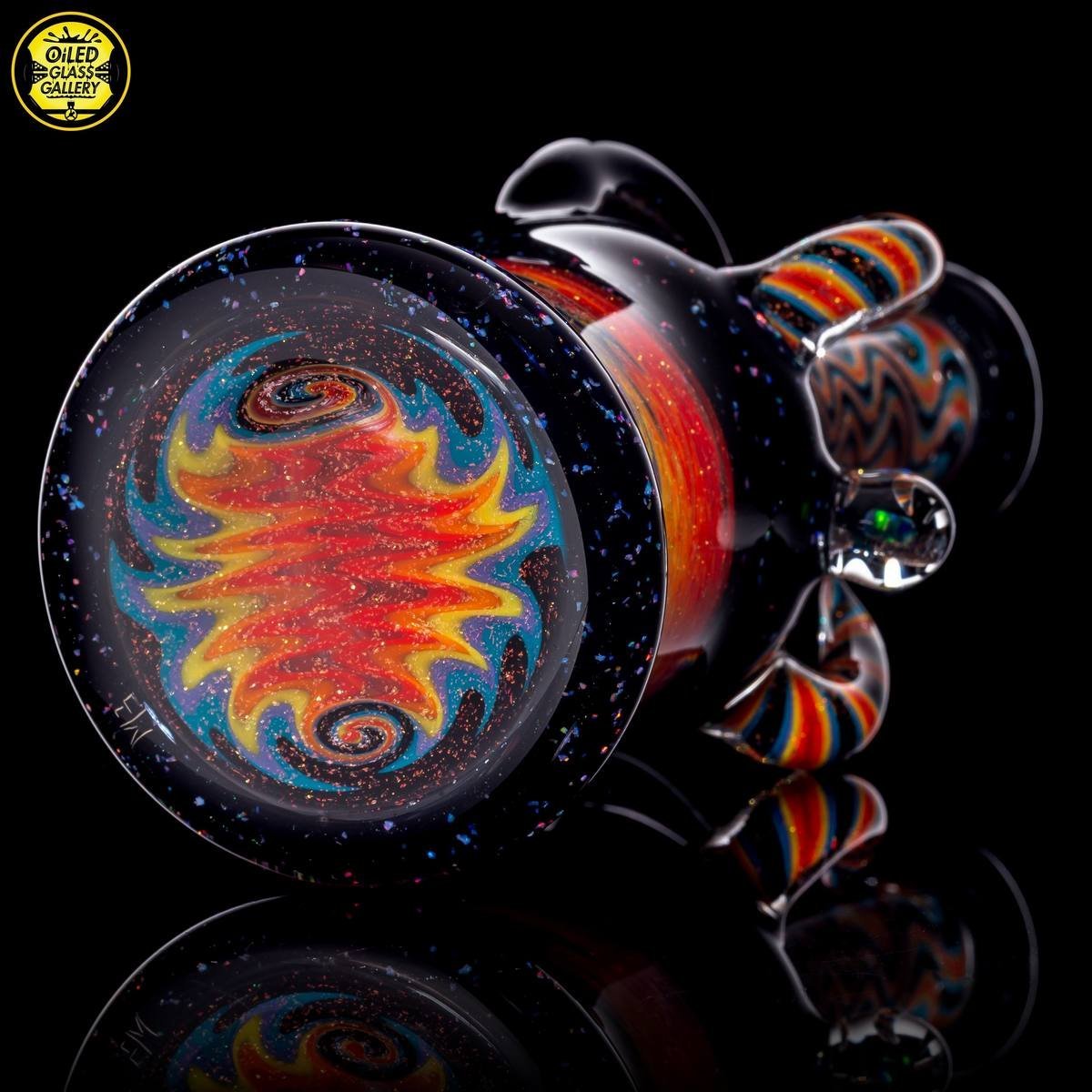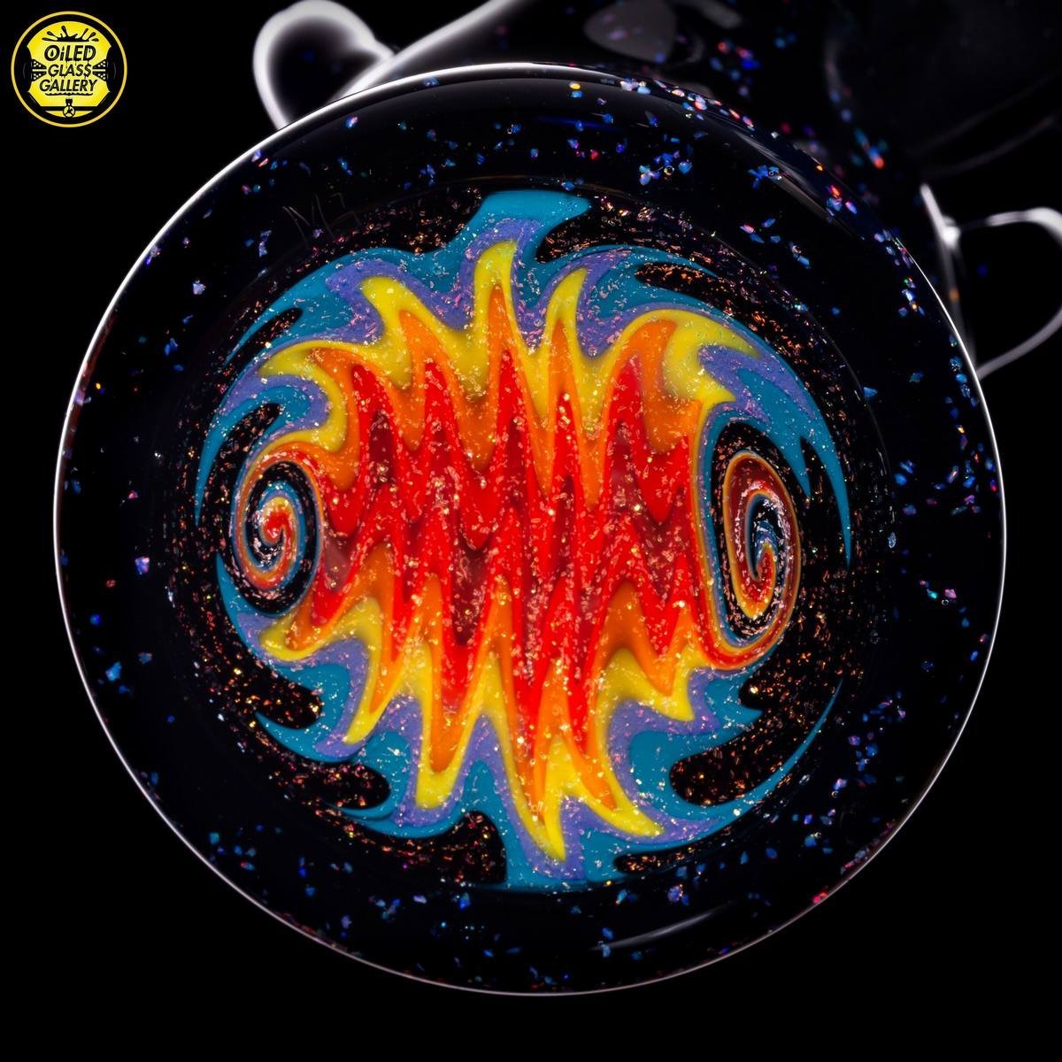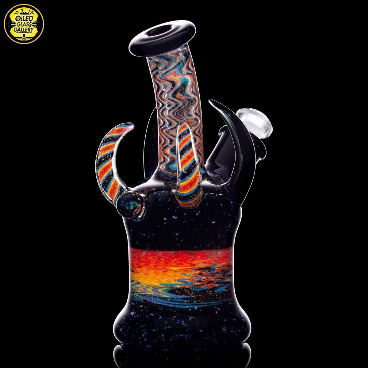 2020 10mm 5.5in Crushed Opal Dichroic Rainbow Linework Tube set featuring an encased opal mounted on the back. This set comes with a matching downstem, bubble cap with encased opal, and a pendant.