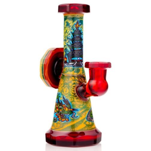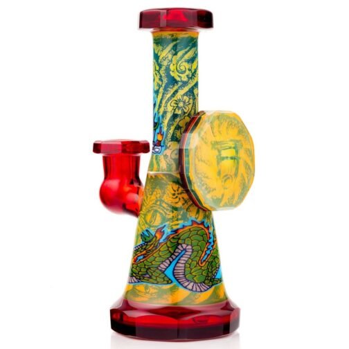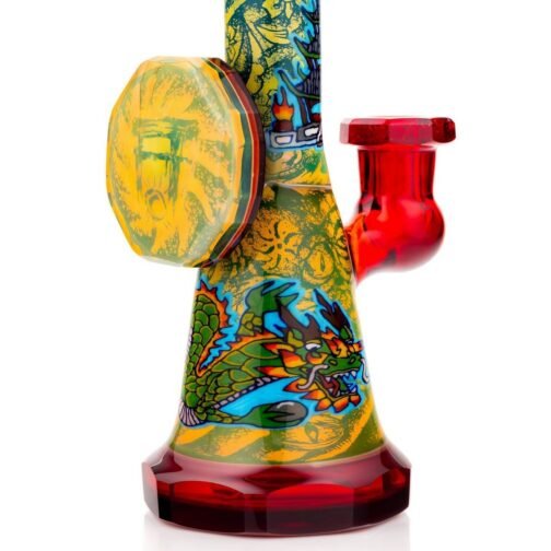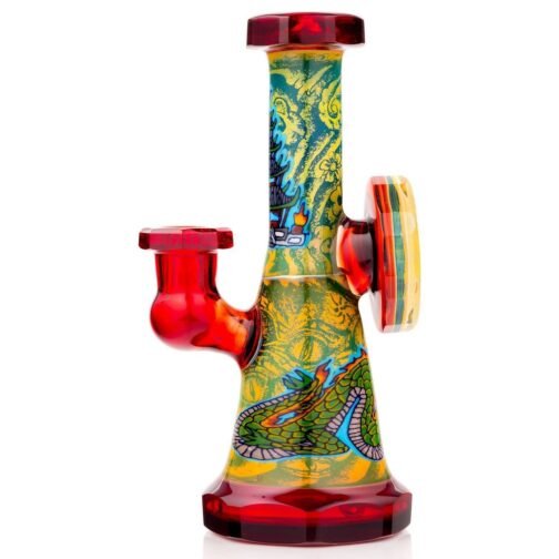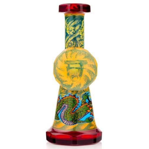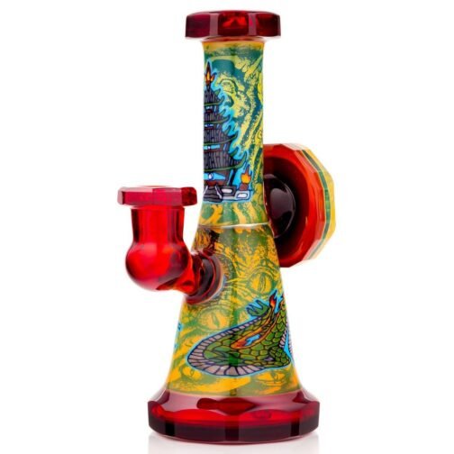 2017 10mm 7.75in ‘Dragon Pagoda’ Flip Carved Tube. Includes some of Brendan’s more detailed flip drawings sleeved over sick carvings by Trevy and made with Pomegranate accents. Has a huge faceted coin of Trevy’s Pagoda carve, faceted joint, faceted mouthpiece, and shipped in a Pelican case.