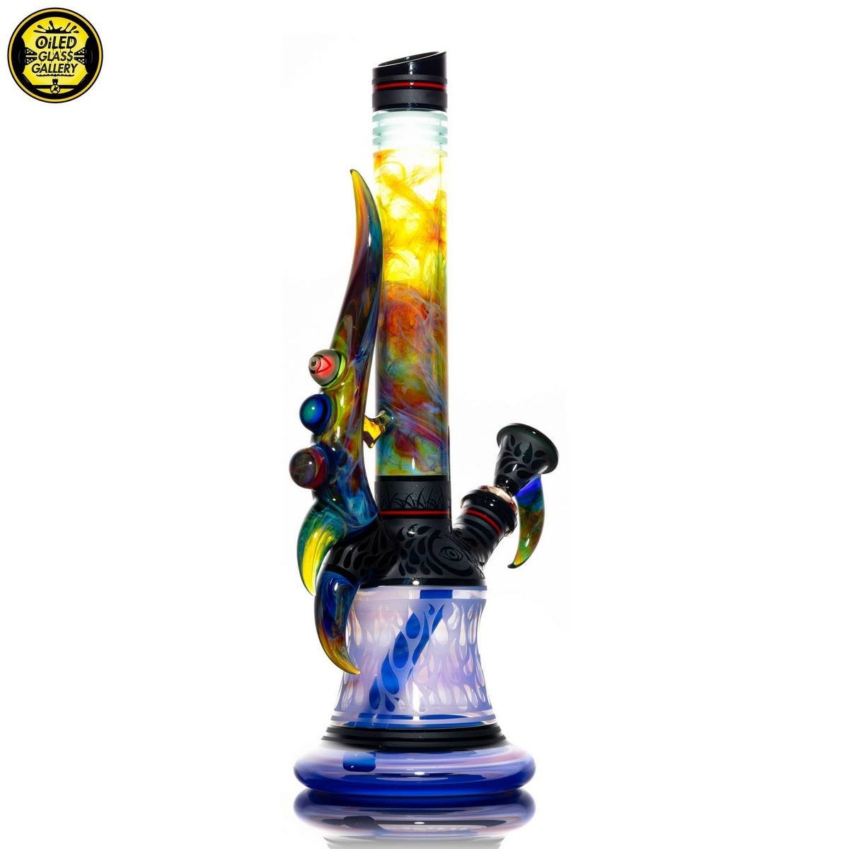 2024 10mm 10.75in “Ethereal One” Color Collider tube set made of custom mixed colors featuring sandblasting on the sides, the base, the slide and the 3-hole downstem. Also has a slanted mouth piece along and a massive horn mounted on the back with 3 mibs and 2 horns mounted on it. This pieces comes shipped in an Orange Apache 2800 case.