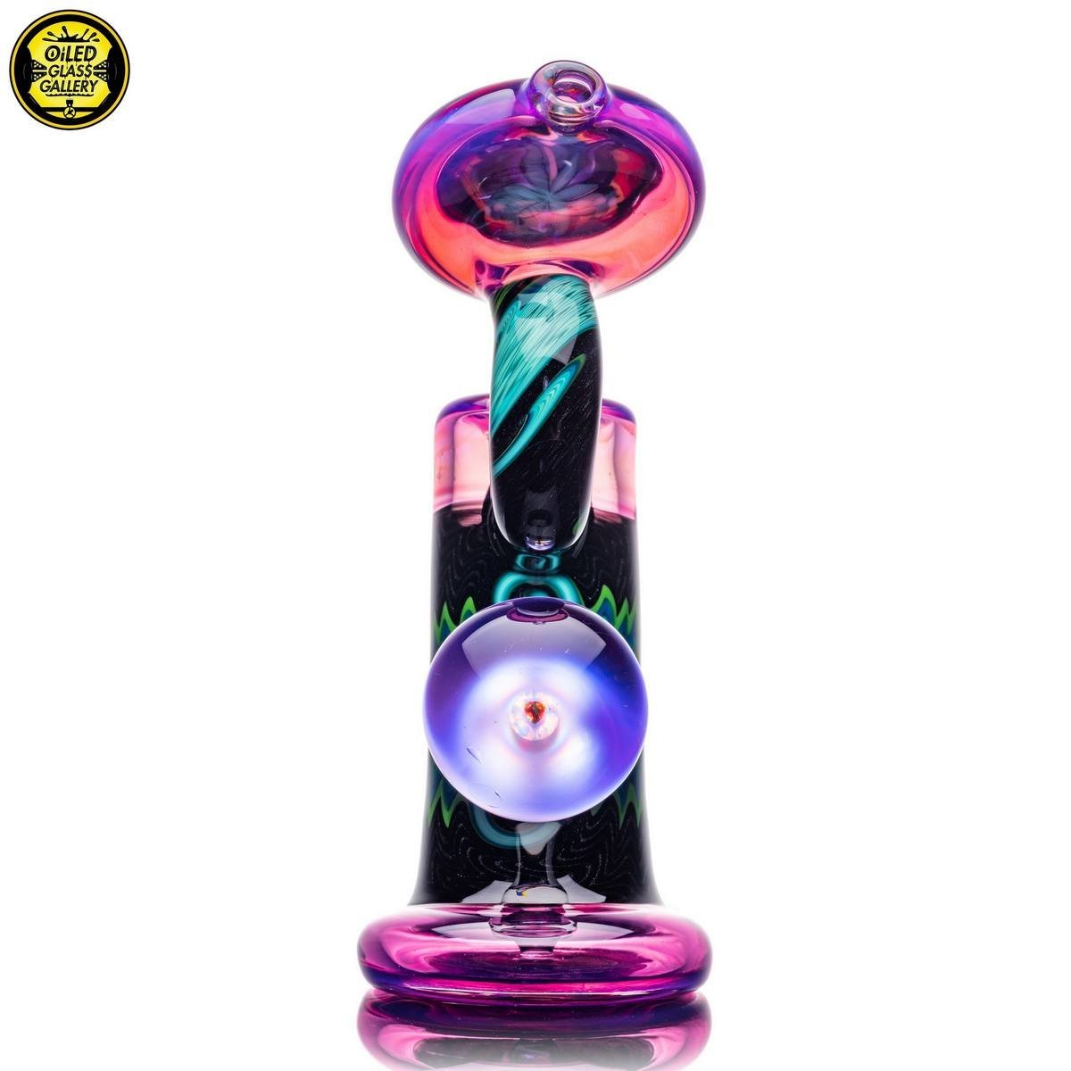 2021 10mm 6.5in Bubbler made of Molten Aura Royal Jelly, fillacello and wig wag sections. Features an encased opal coin with floating trillion opal mib mounted on the back, encased opal in the perk, and an encased opal on the fillacello mouthpiece. Comes shipped in a Black Apache 1800 case.