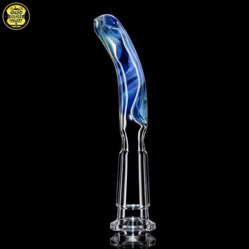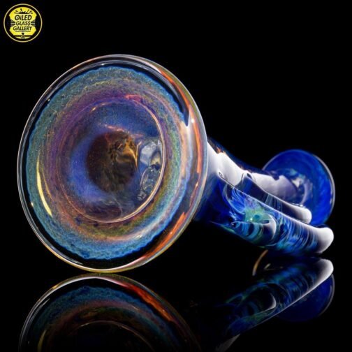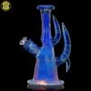 2021 10mm 6.5in Frit Spear Beaker Tube made of Northstar Glass Amber Purple frit mixed with Northstar Glass Alaskan Thunder with Glass Alchemy Blue Dream & Northstar Glass Yellow mix horns featuring a matching 2-hole removable downstem.