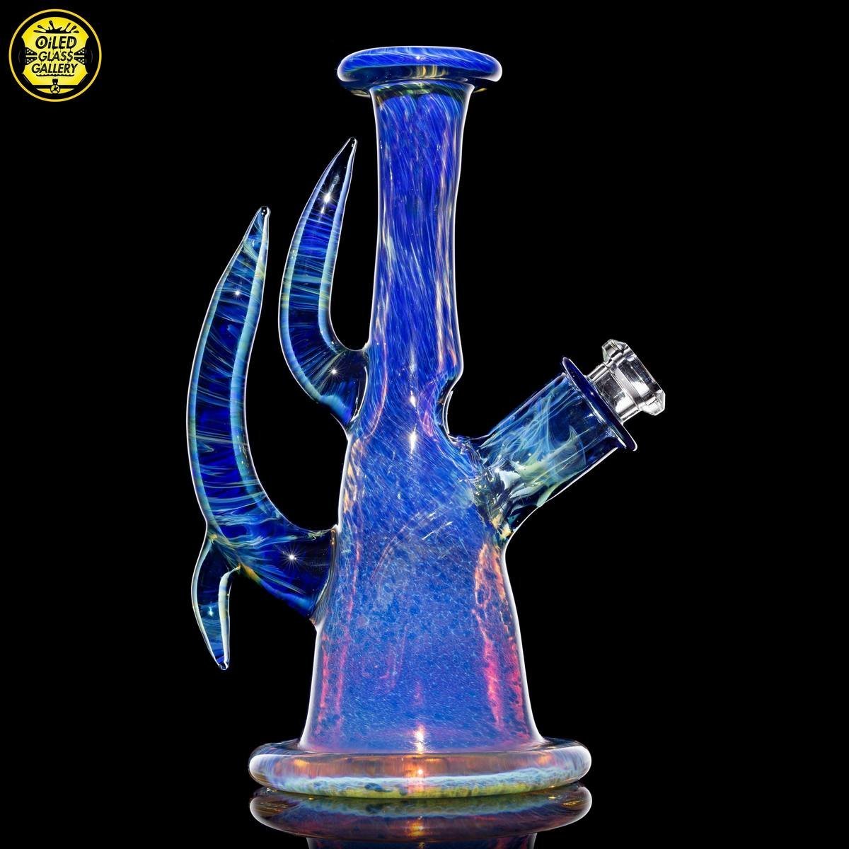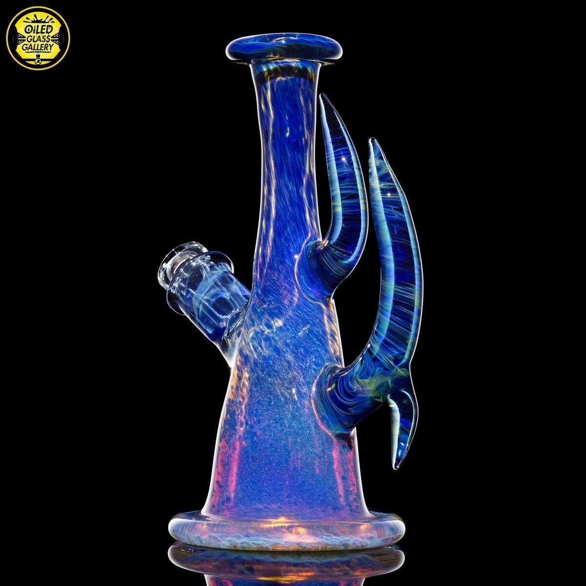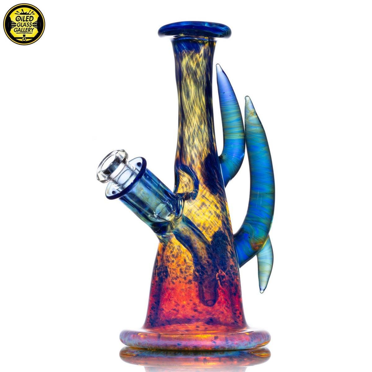 2021 10mm 6.5in Frit Spear Beaker Tube made of Northstar Glass Amber Purple frit mixed with Northstar Glass Alaskan Thunder with Glass Alchemy Blue Dream & Northstar Glass Yellow mix horns featuring a matching 2-hole removable downstem.