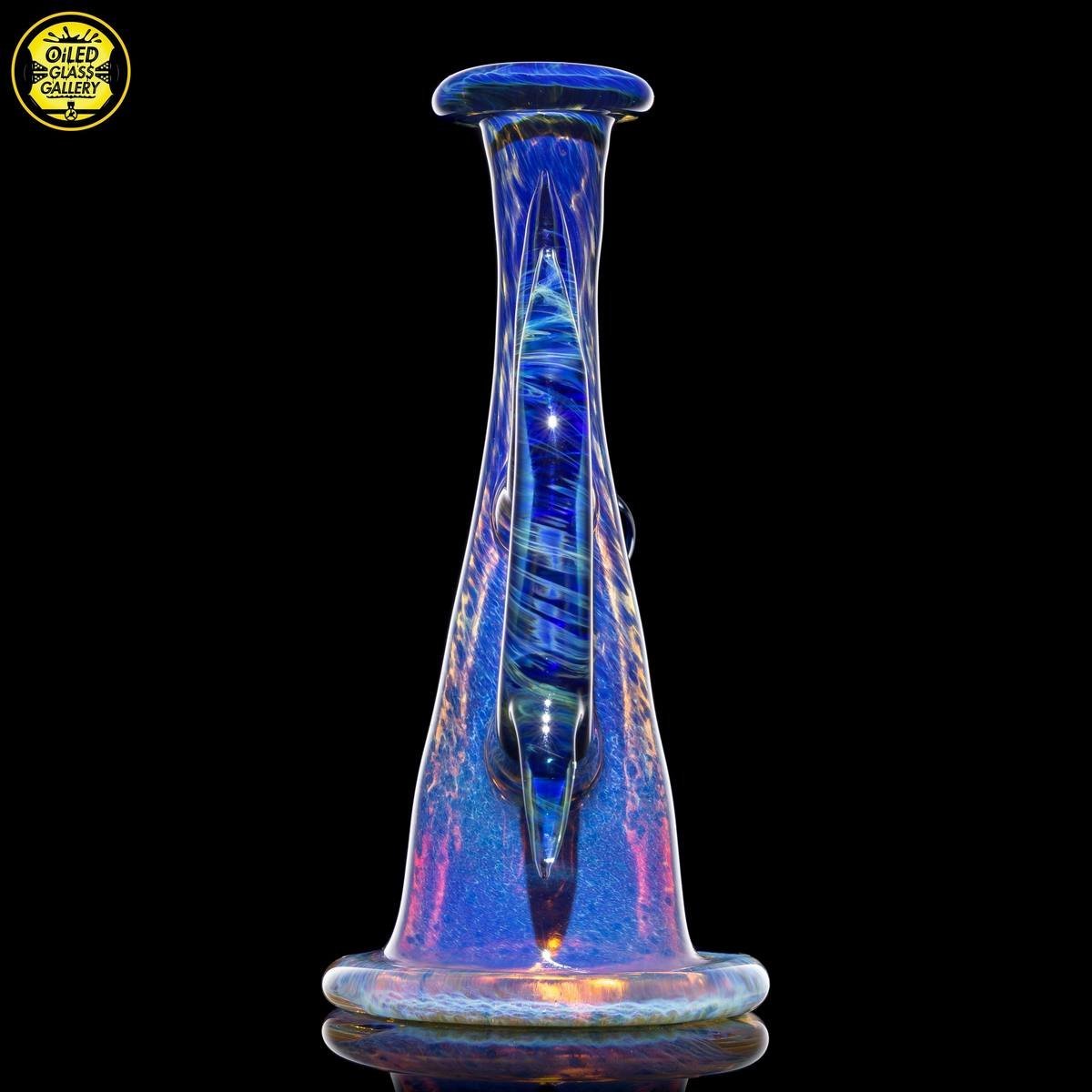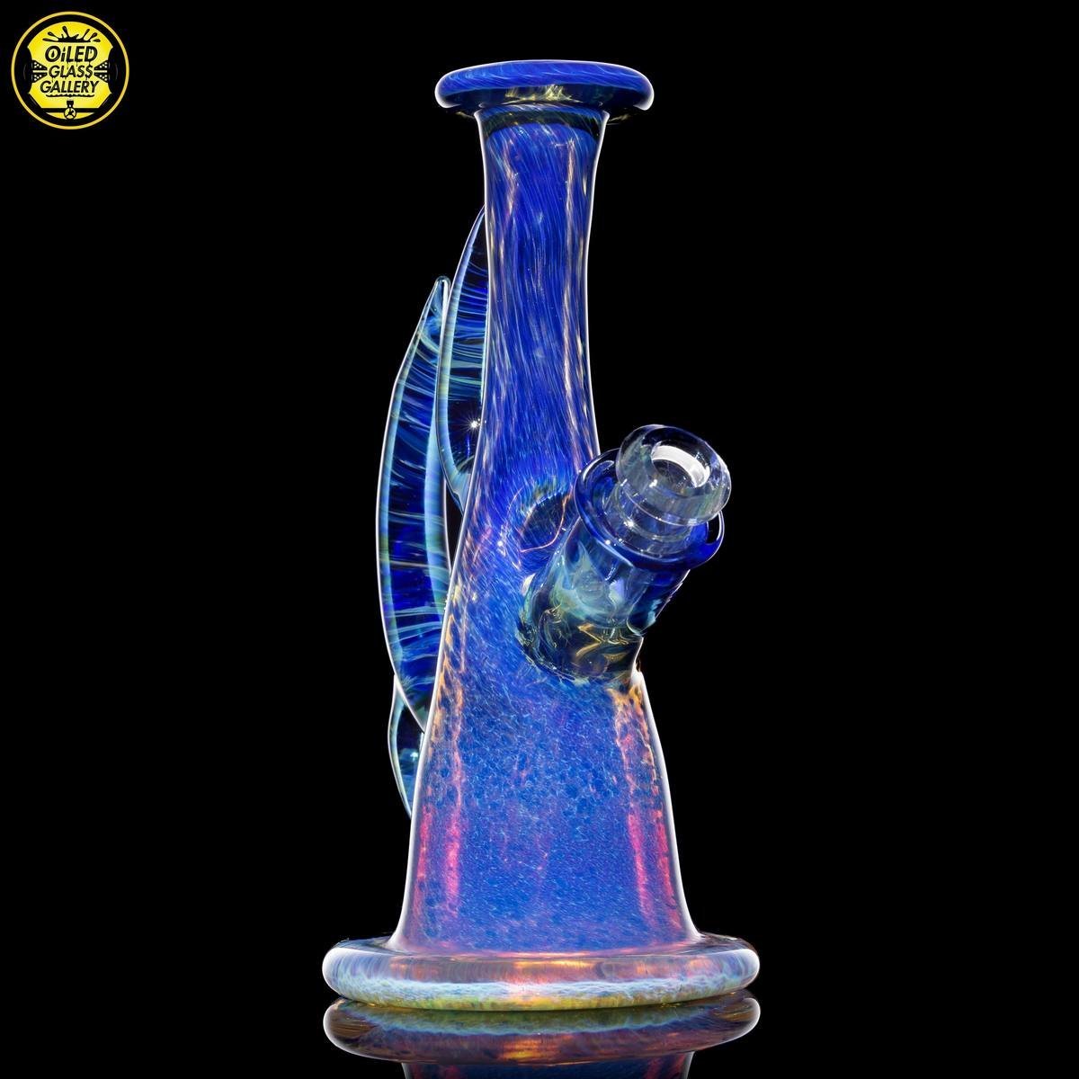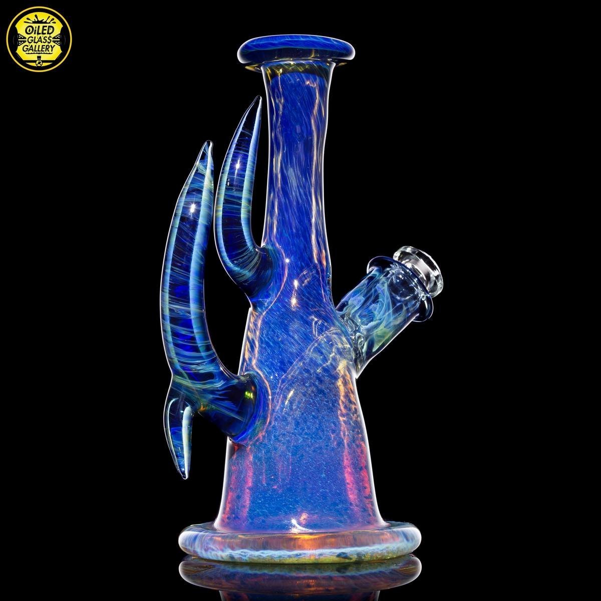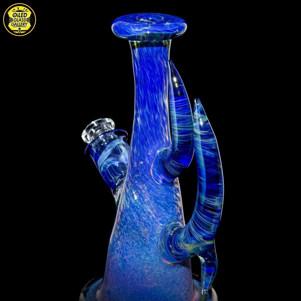2021 10mm 6.5in Frit Spear Beaker Tube made of Northstar Glass Amber Purple frit mixed with Northstar Glass Alaskan Thunder with Glass Alchemy Blue Dream & Northstar Glass Yellow mix horns featuring a matching 2-hole removable downstem.