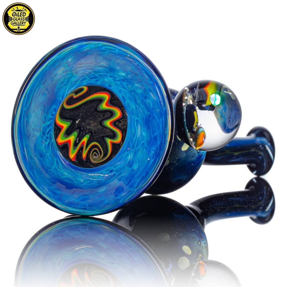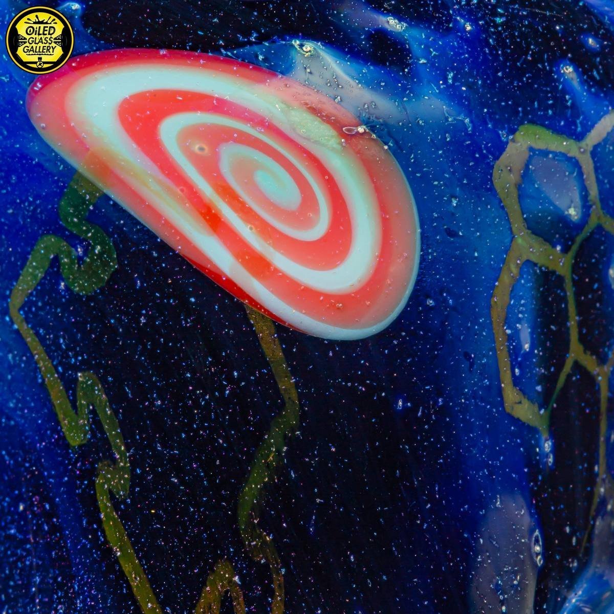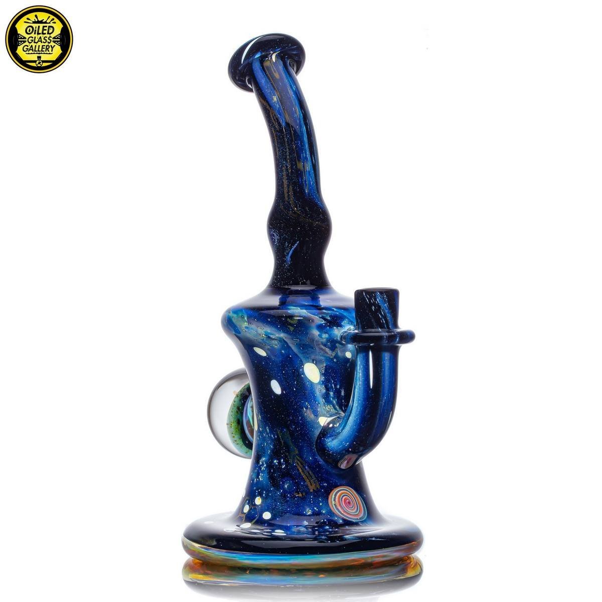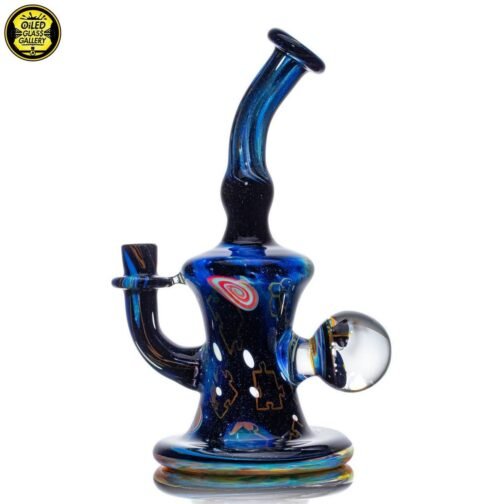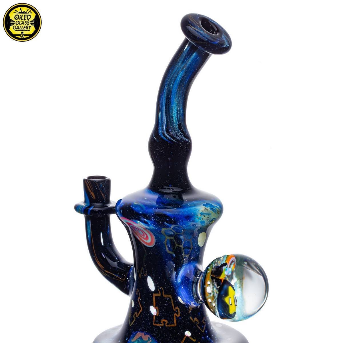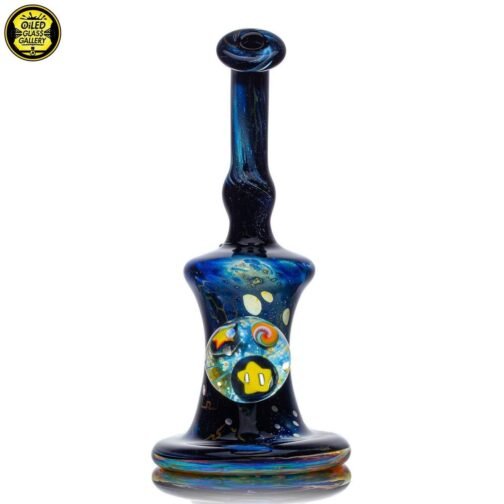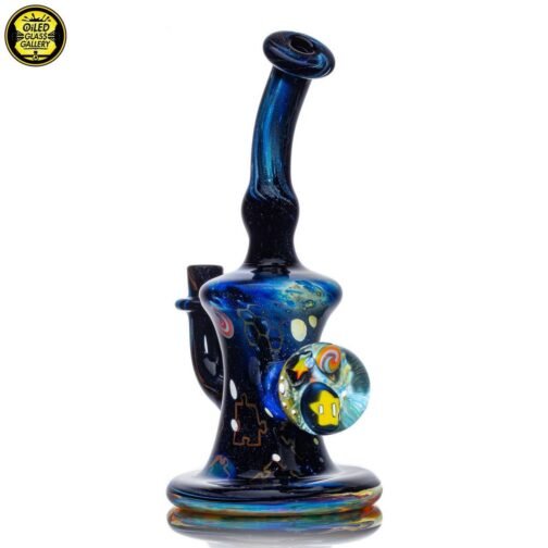 2021 10mm 7in Fumed Puzzle Space Tech Banger Hanger Tube set. Features a beautiful mib on the back with an opal and two encased star milles. Comes with a matching 25mm Star mille marble and 2.25″ Puzzle Space Pill pendant.