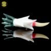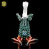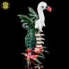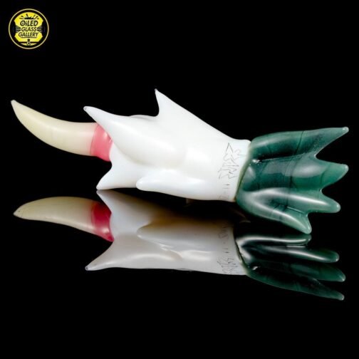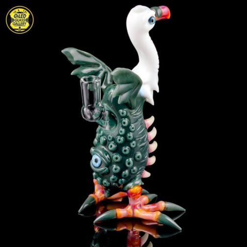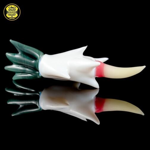2019 10mm 6.5in Gun Mount Toothed Dodo Bird Rig made with Molten Aura Lotus White and Gun Mount Elusive Black with 12 beautiful teeth. Features millefiori eyes, a warpgil perk, and a beautiful star millefiori eye mounted on the back. Gun Mount glass comes from CRT televisions and they were used for insulation but have been out of production for a while. To find any large source, especially enough to make a piece of this size is extremely rare. This set comes with a matching millefiori eye bubblecap, a matching tooth dabber, and comes shipped in a Pelican case.
