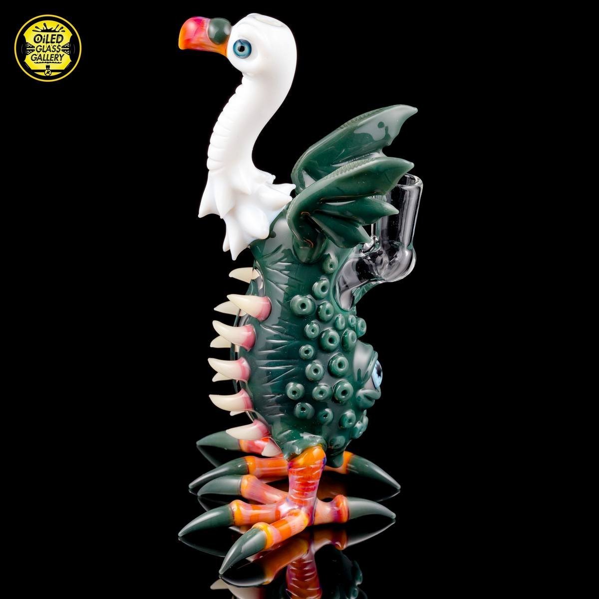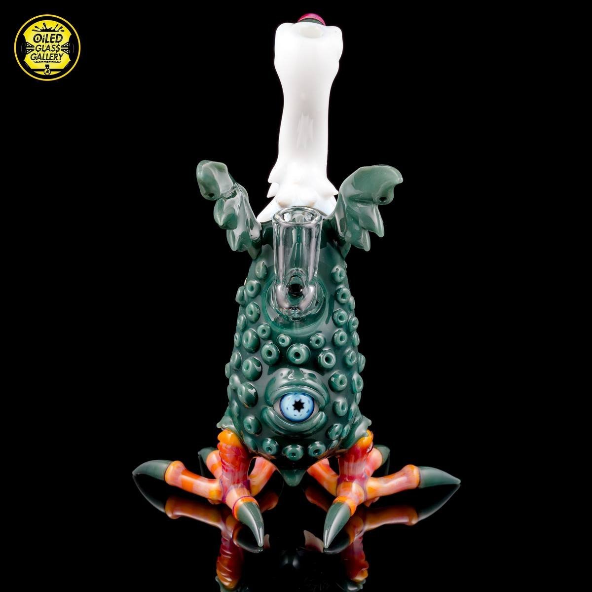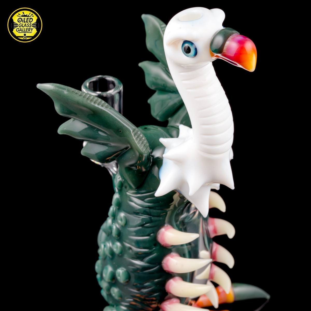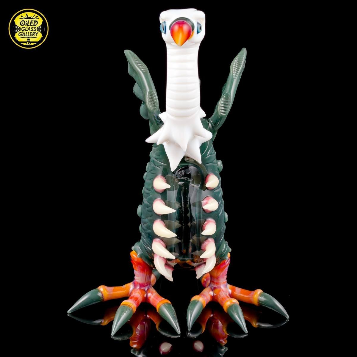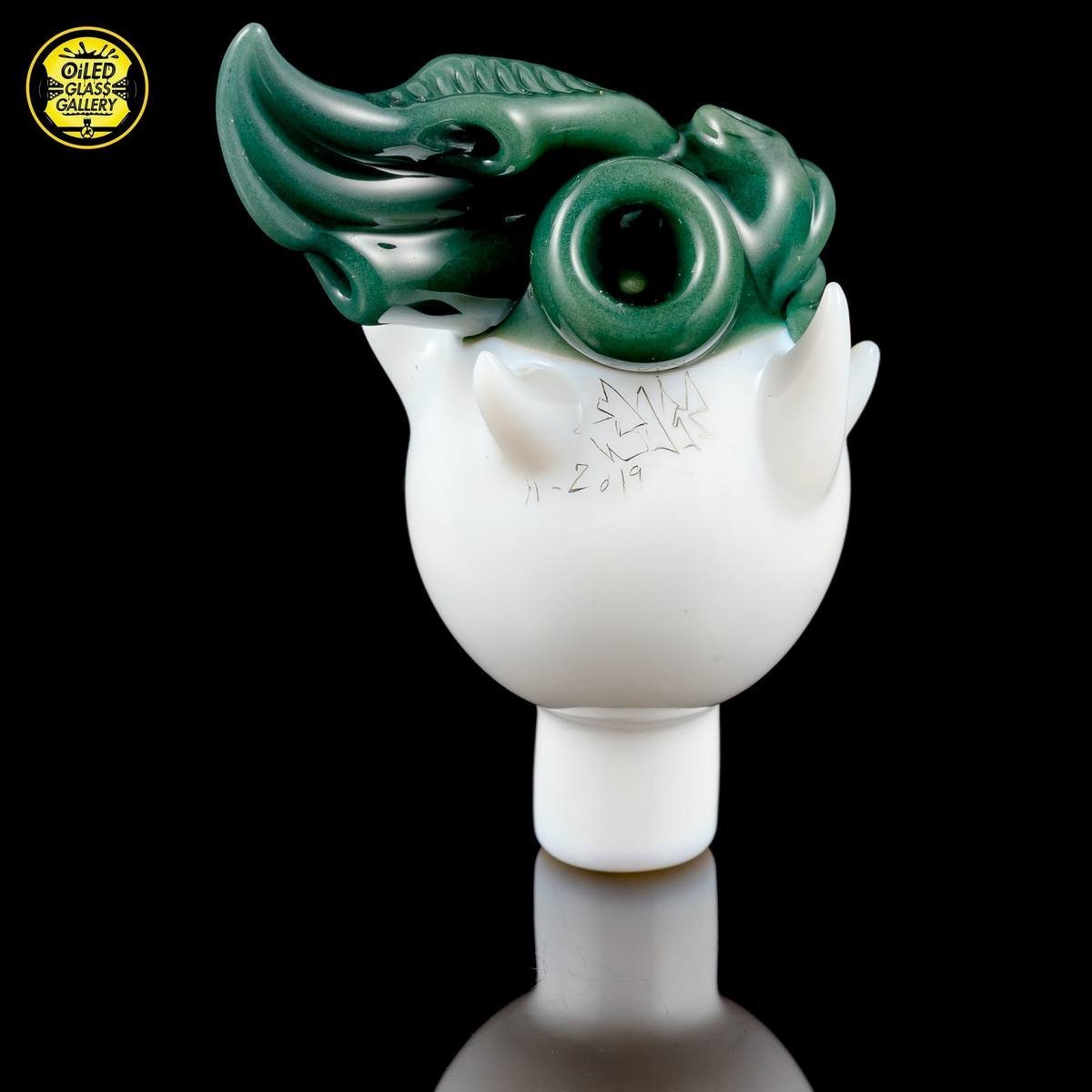 2019 10mm 6.5in Gun Mount Toothed Dodo Bird Rig made with Molten Aura Lotus White and Gun Mount Elusive Black with 12 beautiful teeth. Features millefiori eyes, a warpgil perk, and a beautiful star millefiori eye mounted on the back. Gun Mount glass comes from CRT televisions and they were used for insulation but have been out of production for a while. To find any large source, especially enough to make a piece of this size is extremely rare. This set comes with a matching millefiori eye bubblecap, a matching tooth dabber, and comes shipped in a Pelican case.