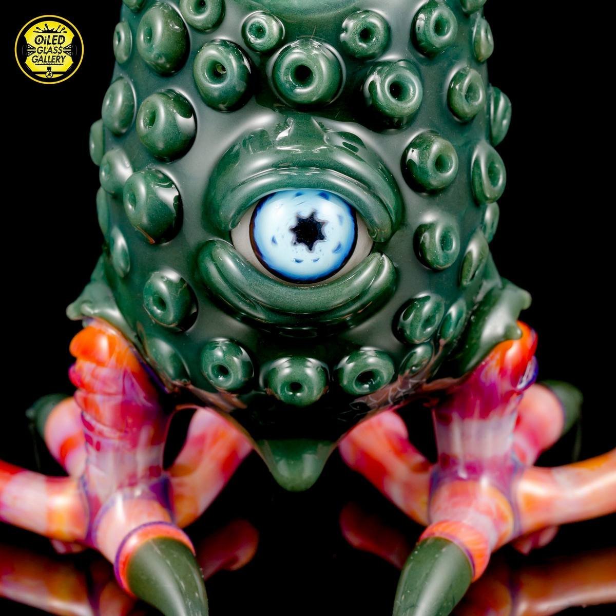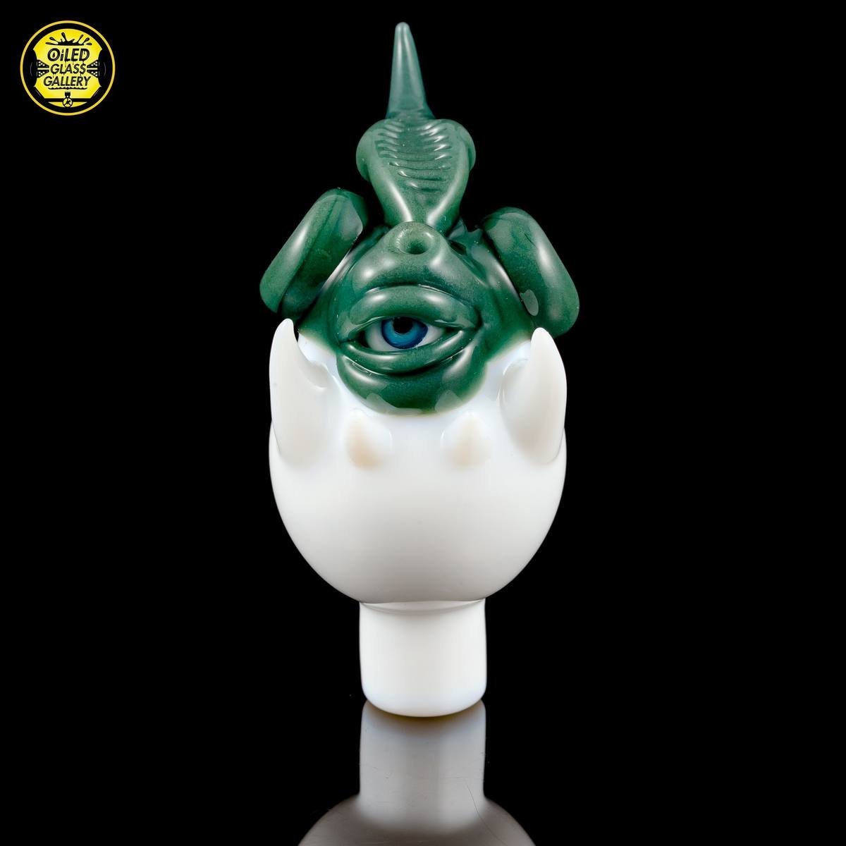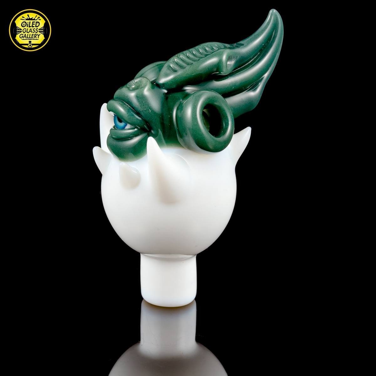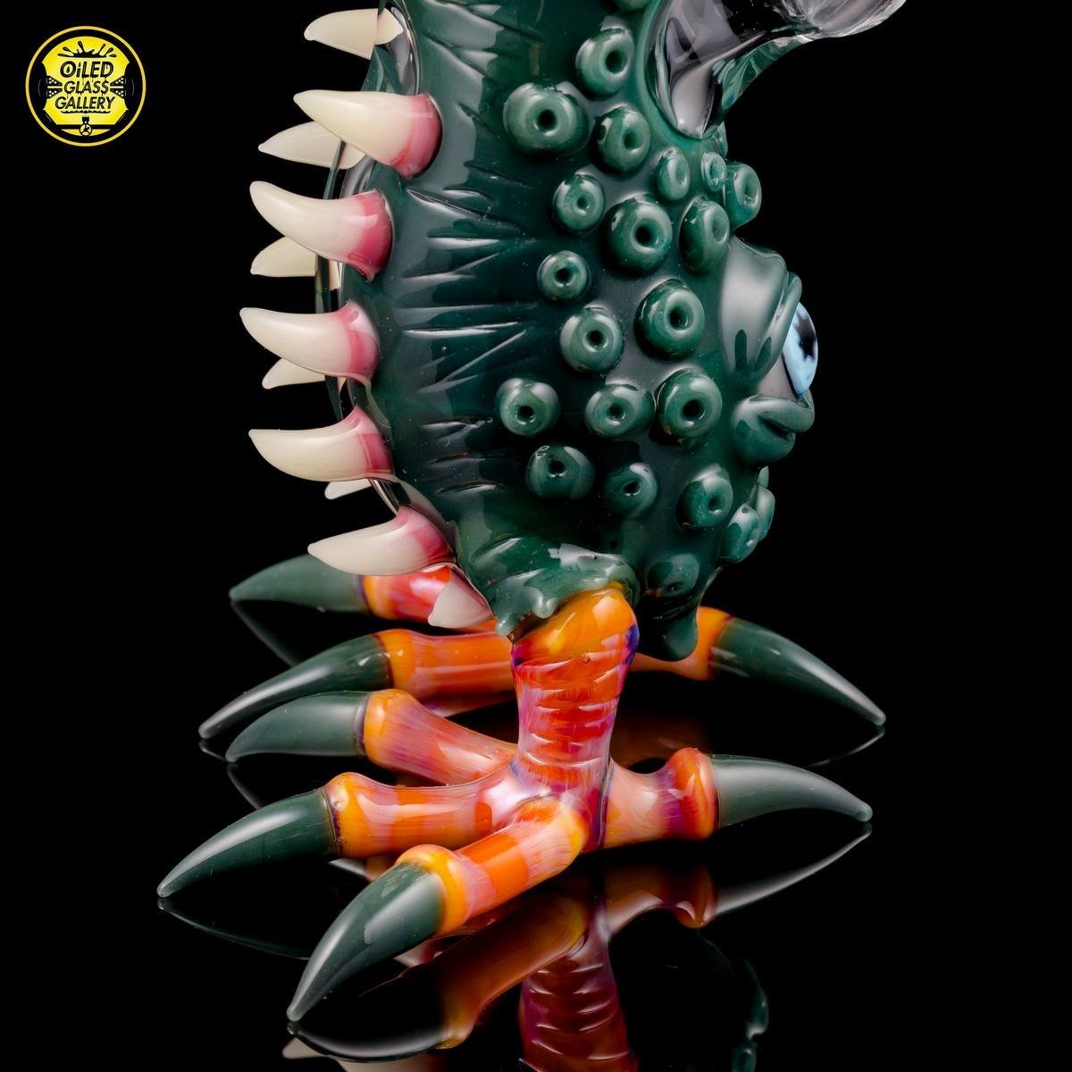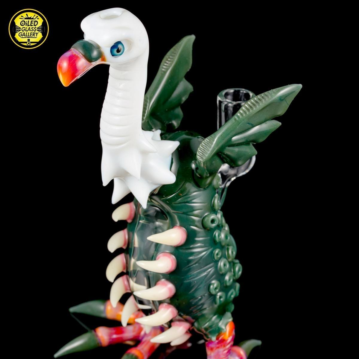 2019 10mm 6.5in Gun Mount Toothed Dodo Bird Rig made with Molten Aura Lotus White and Gun Mount Elusive Black with 12 beautiful teeth. Features millefiori eyes, a warpgil perk, and a beautiful star millefiori eye mounted on the back. Gun Mount glass comes from CRT televisions and they were used for insulation but have been out of production for a while. To find any large source, especially enough to make a piece of this size is extremely rare. This set comes with a matching millefiori eye bubblecap, a matching tooth dabber, and comes shipped in a Pelican case.