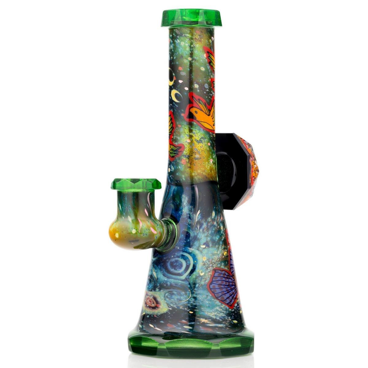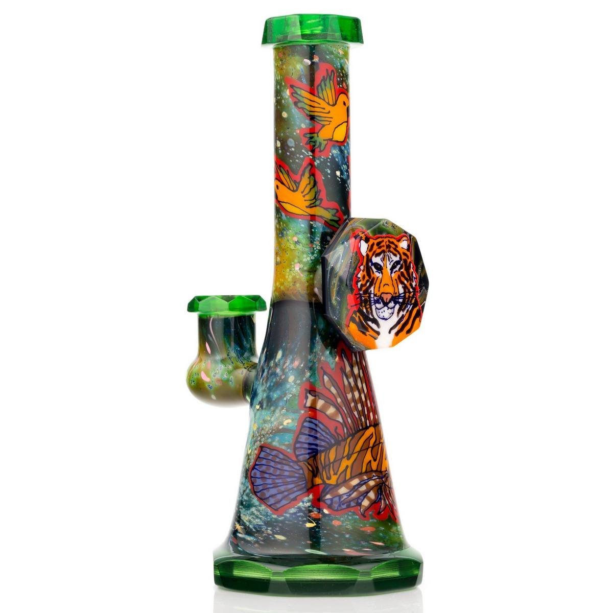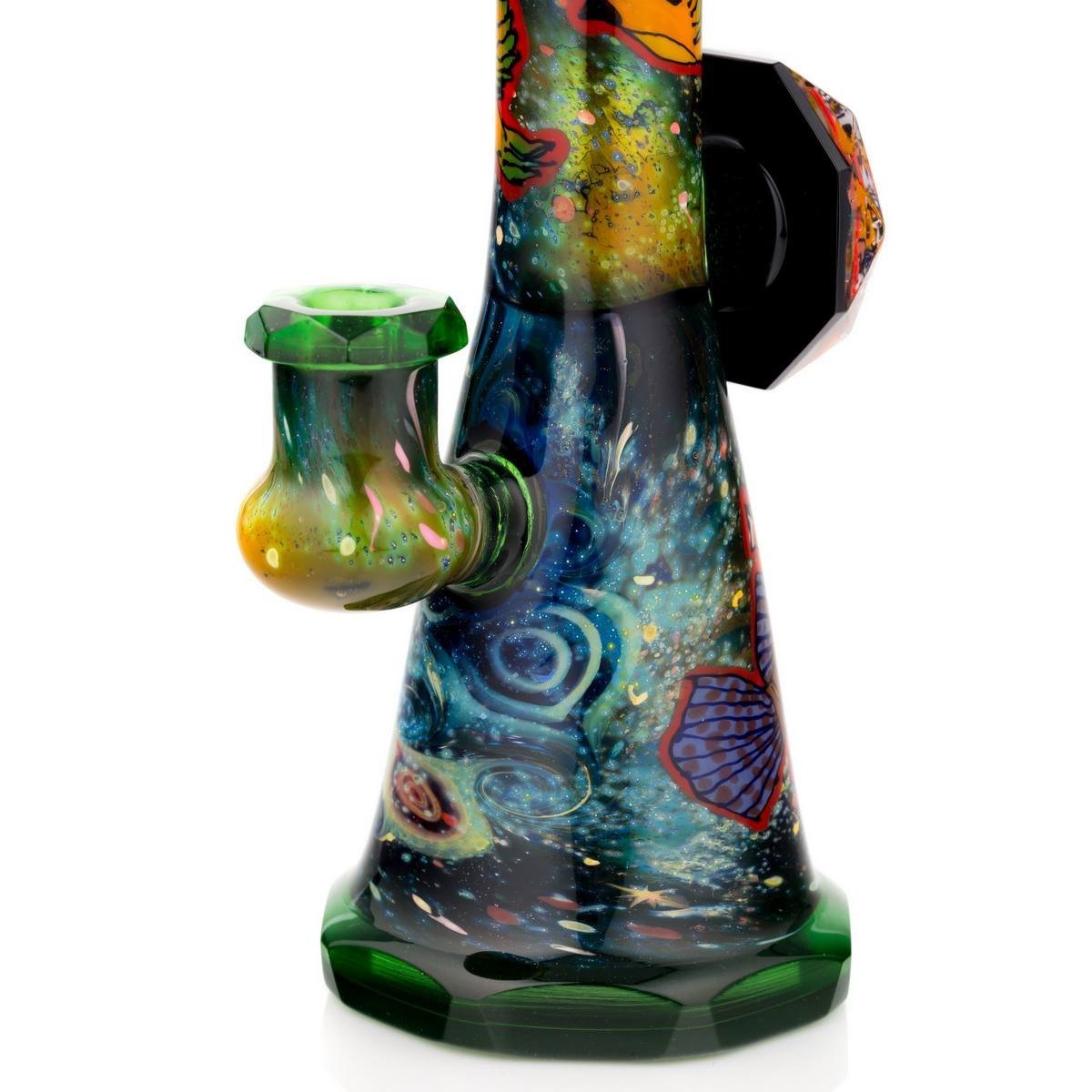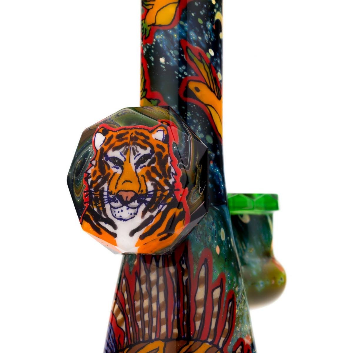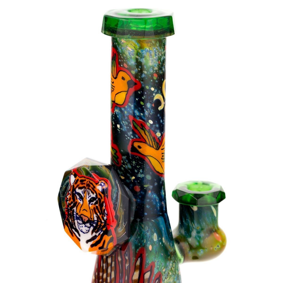 2017 10mm 8in Jungle Nights a.k.a. “El Tigre” Fumed Flip Tube. This collaboration is packed with flips and facets within Glass Alchemy Crippy Green. This piece was built with the elements in mind, Earth, Wind, Fire, Water. It comes shipped in a Beyond Grasp painted Pelican case & Blazer Big Shot GT 8000 Torch from N8’s “roygBiv” series. This piece is from a private collection.
