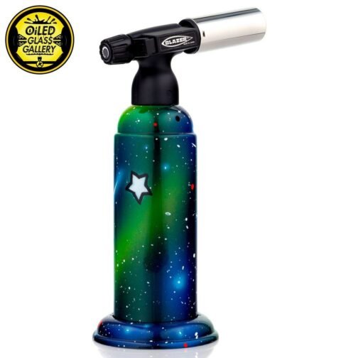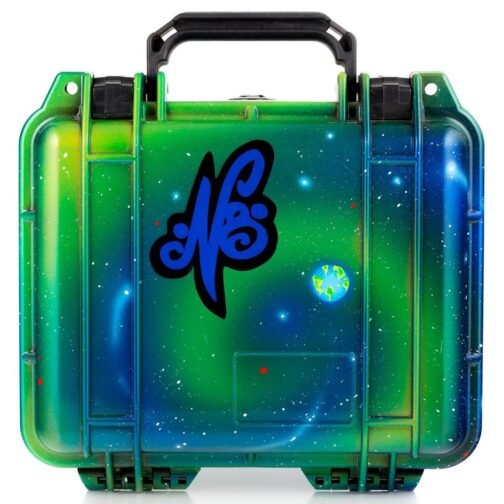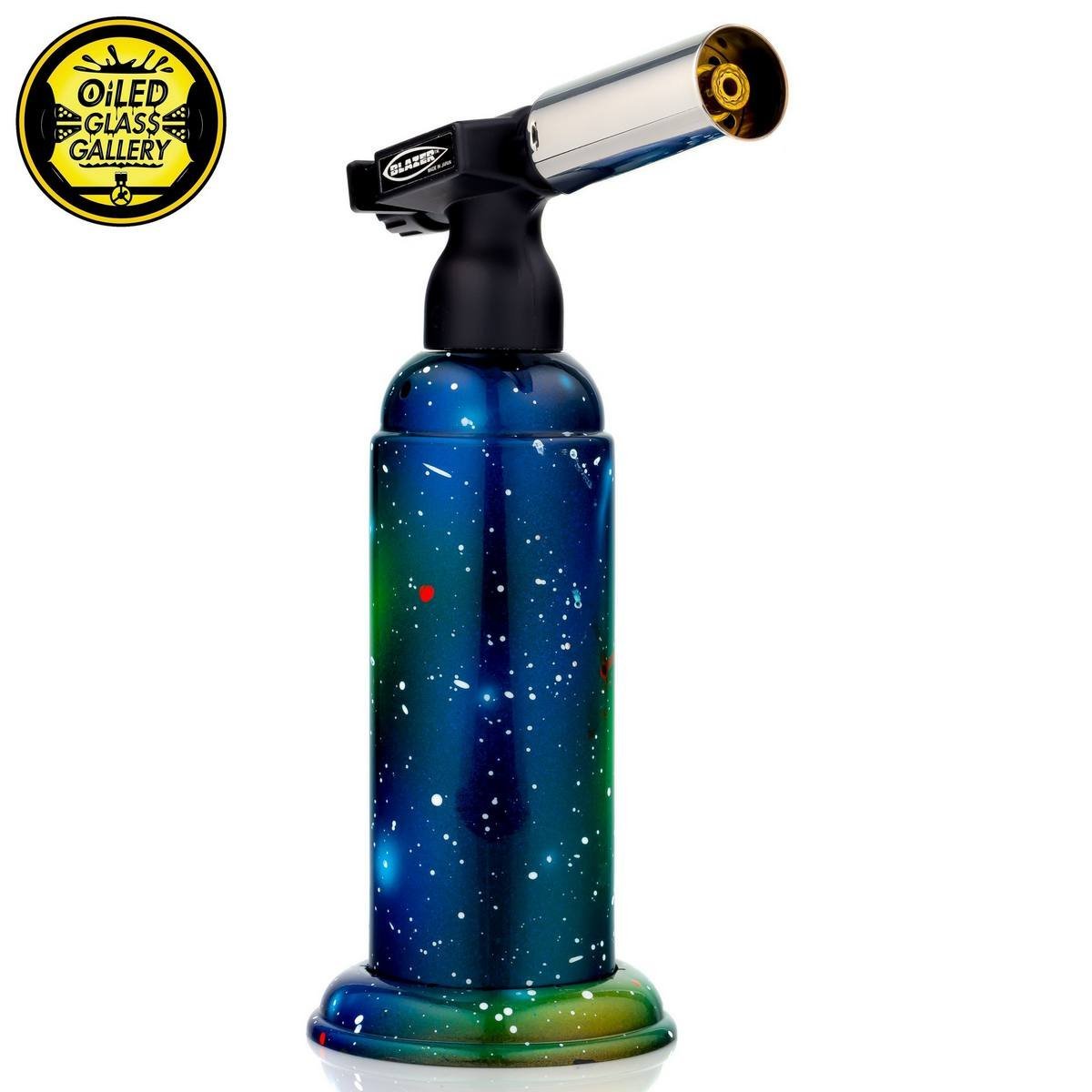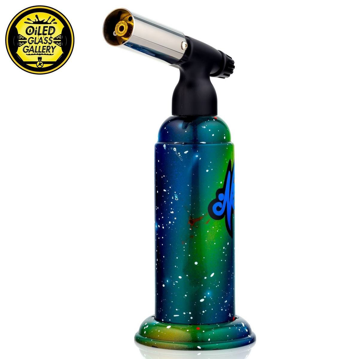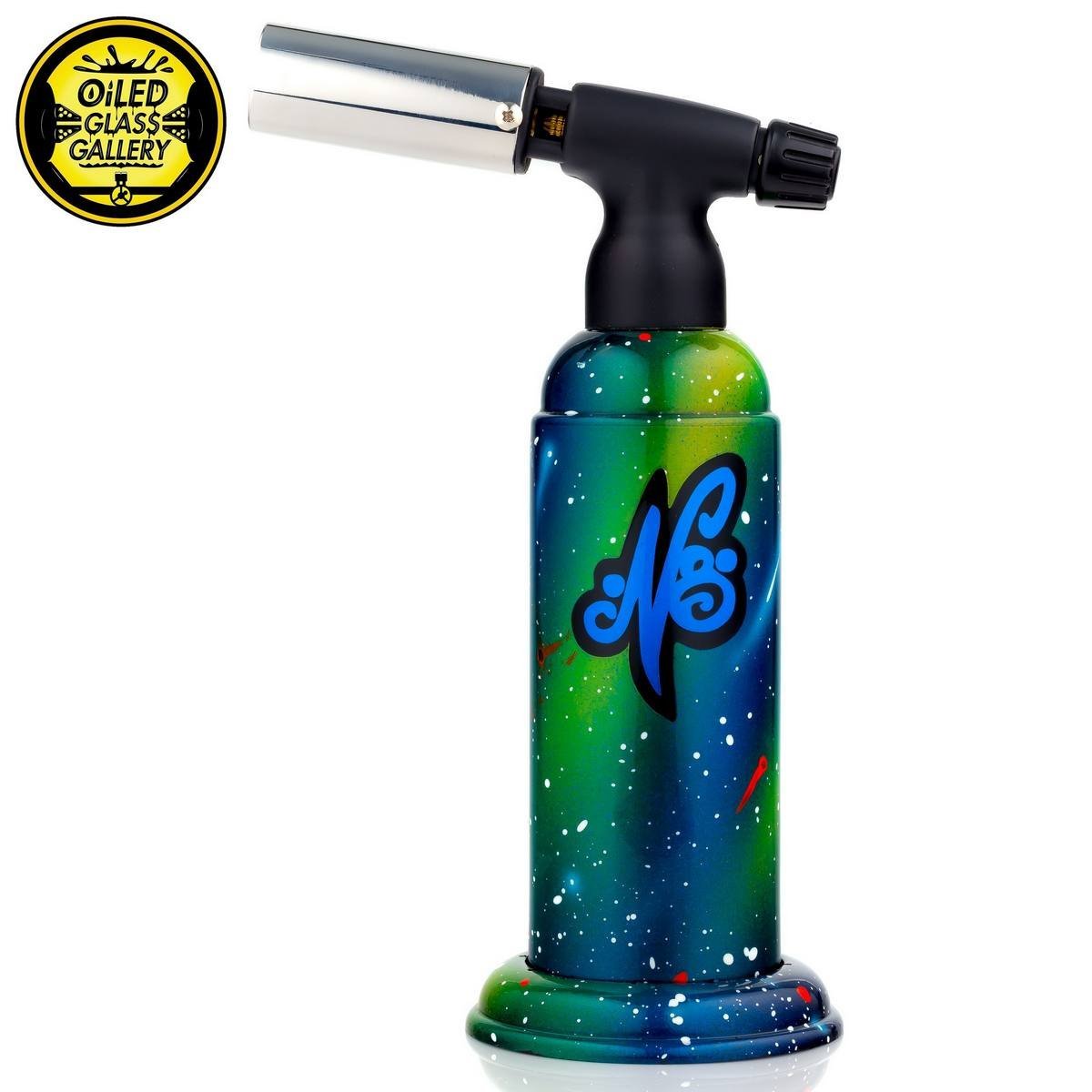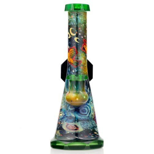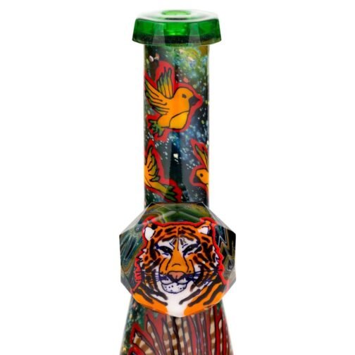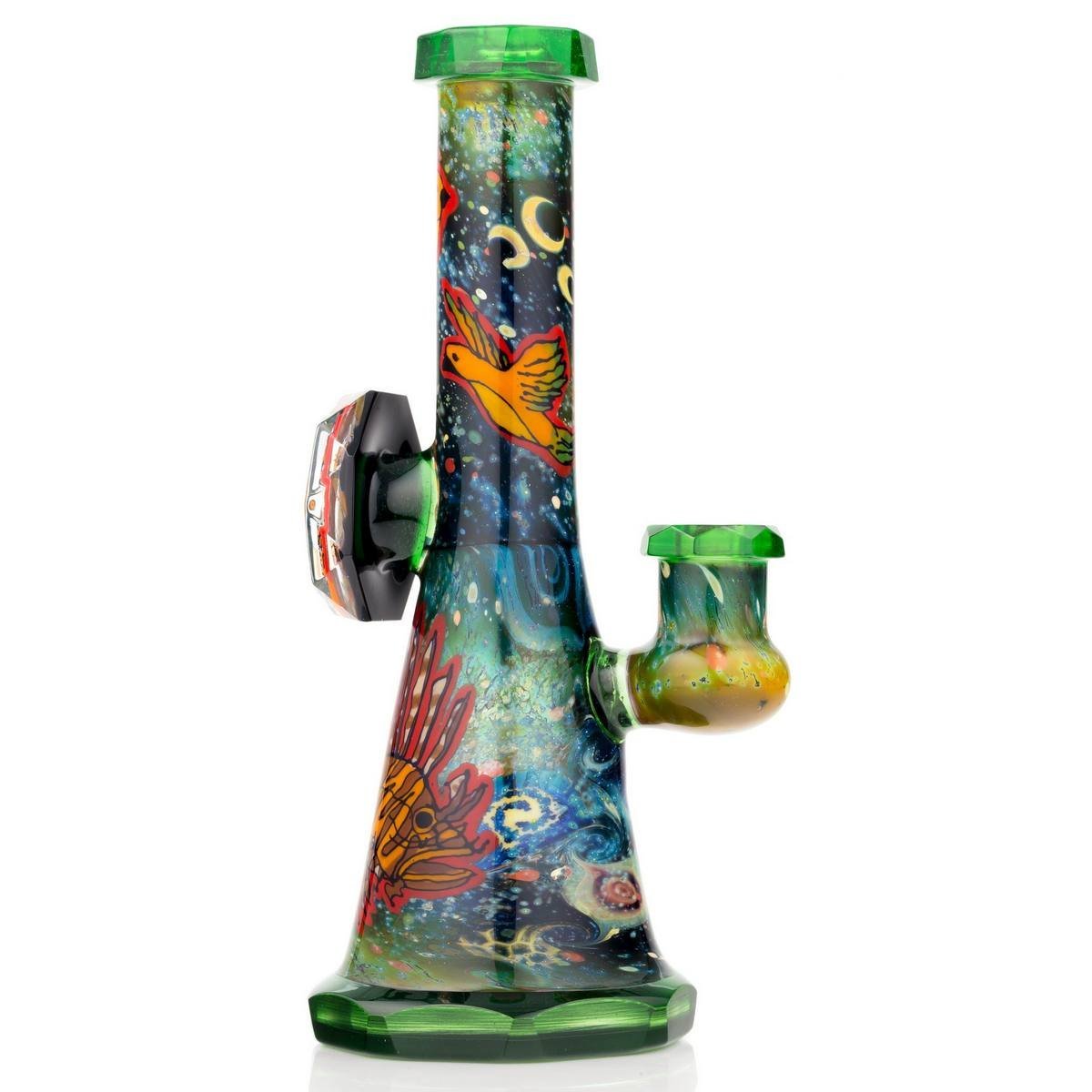 2017 10mm 8in Jungle Nights a.k.a. “El Tigre” Fumed Flip Tube. This collaboration is packed with flips and facets within Glass Alchemy Crippy Green. This piece was built with the elements in mind, Earth, Wind, Fire, Water. It comes shipped in a Beyond Grasp painted Pelican case & Blazer Big Shot GT 8000 Torch from N8’s “roygBiv” series. This piece is from a private collection.