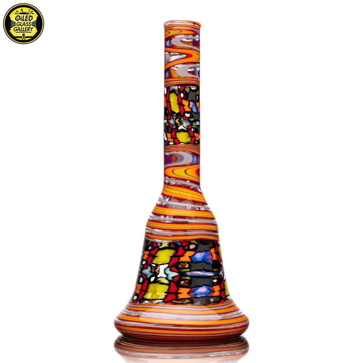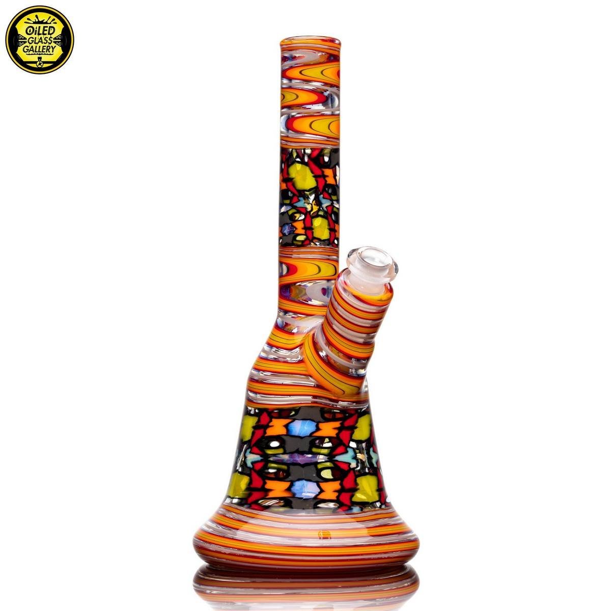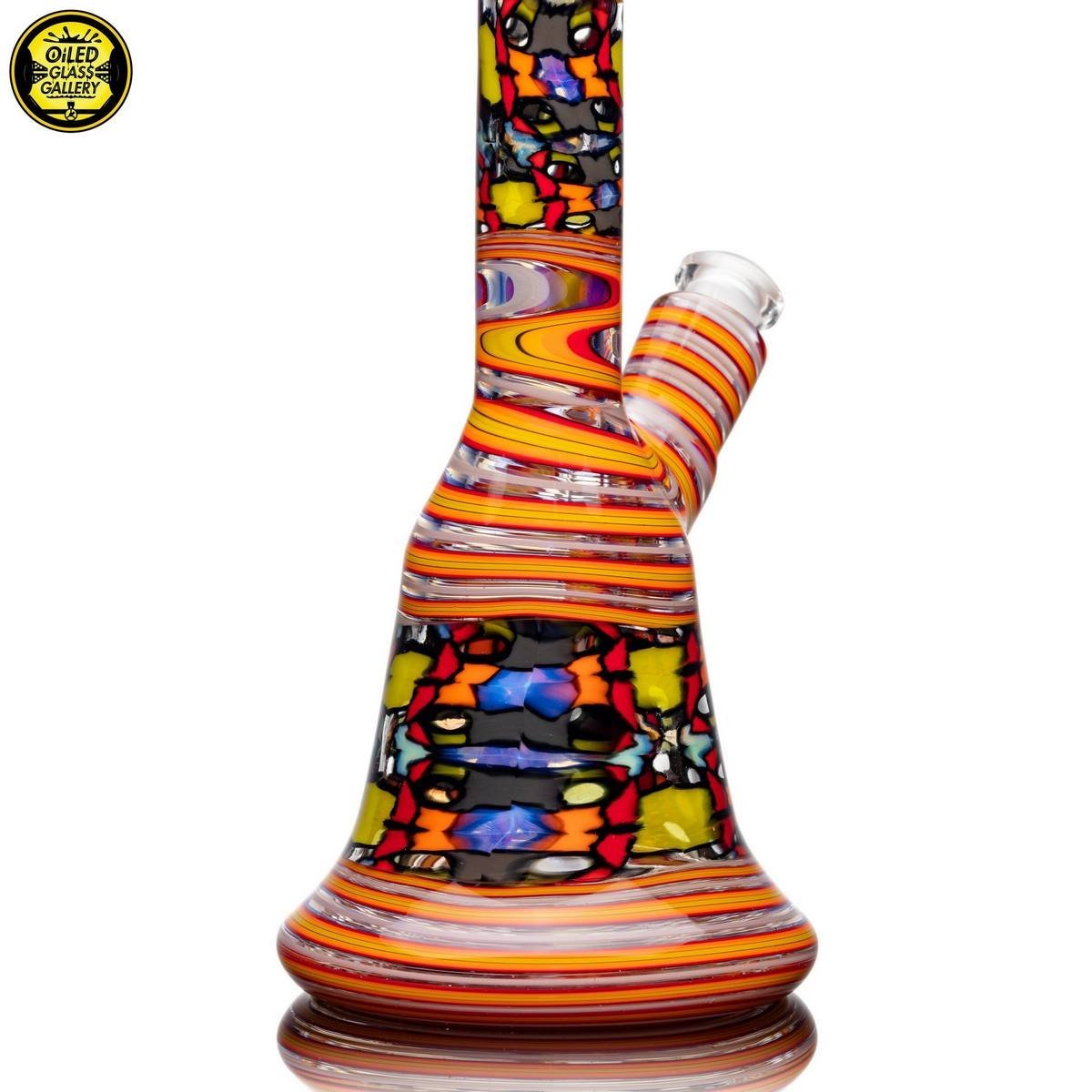 2021 10mm 7.75in Millefiori Chipstack and Fire Linework Beaker Tube set featuring a matching 2-hole removable downstem and bubble cap.