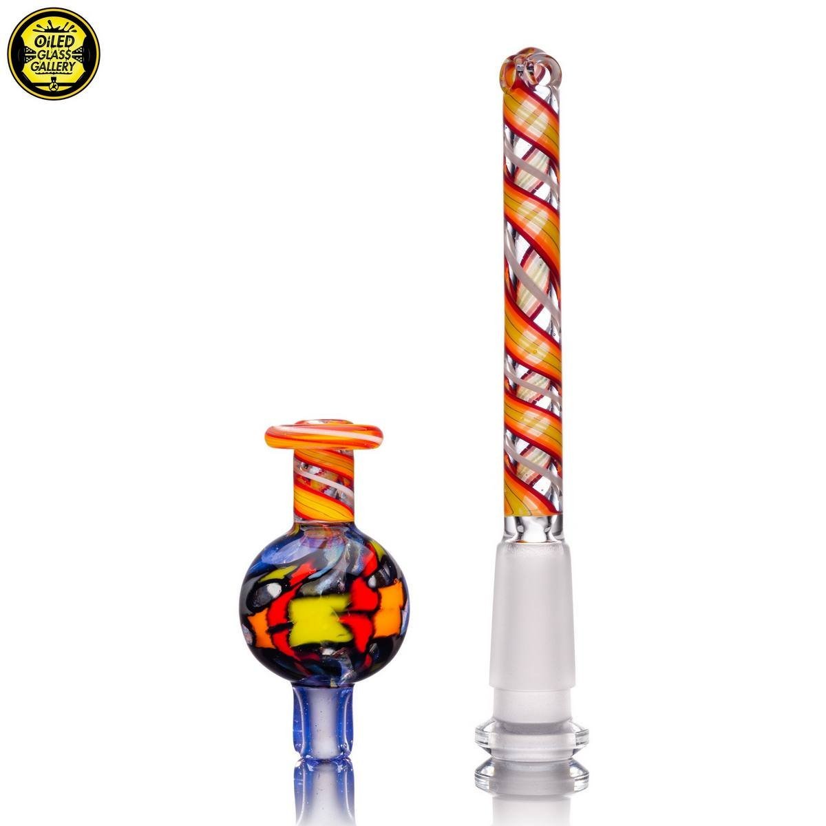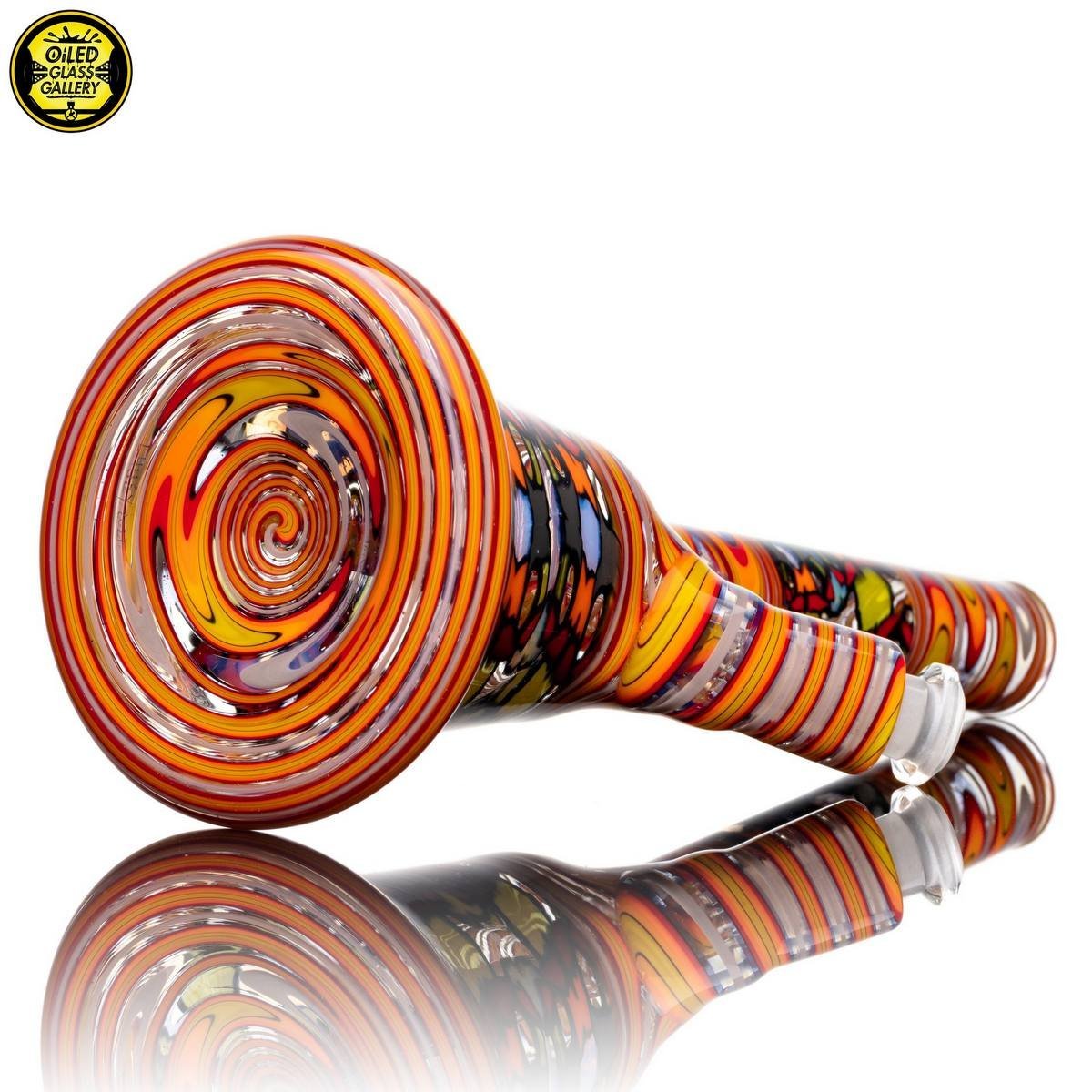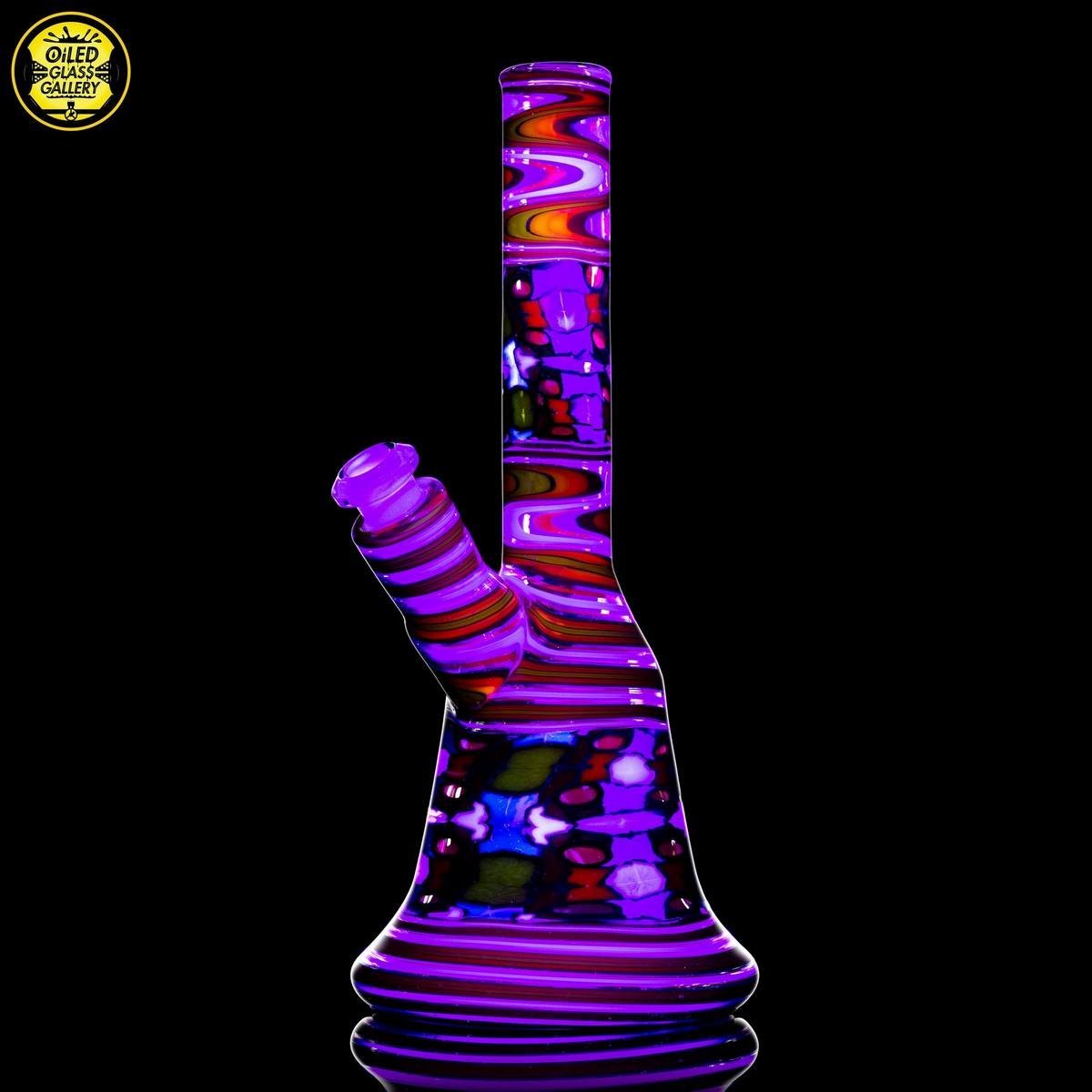 2021 10mm 7.75in Millefiori Chipstack and Fire Linework Beaker Tube set featuring a matching 2-hole removable downstem and bubble cap.