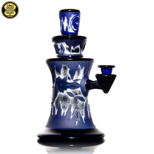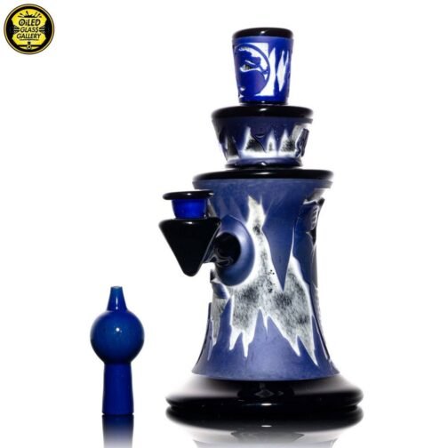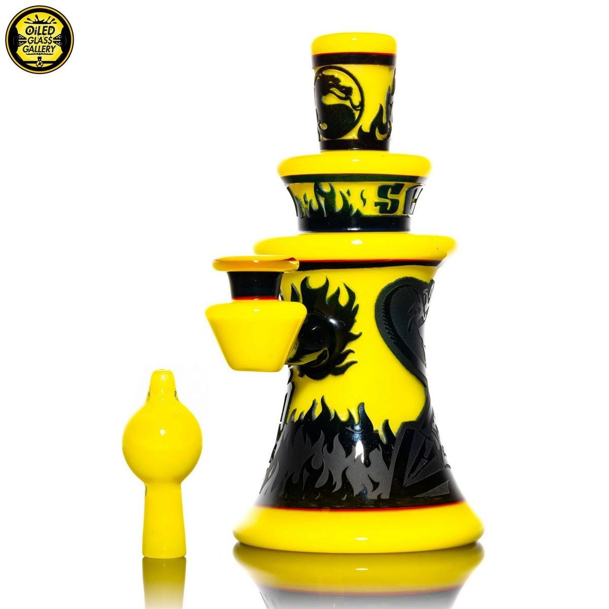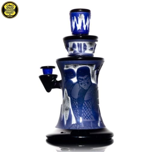 2023 10mm 7.25in “Mortal Kombat” Sub-Zero Carved Jammer tube made of a Northstar Glass Cobalt, Northstar Glass Star White and Northstar Glass Jet Black. Features multiple layers of deep carvings into the glass along the can and the Mortal Kombat logo on the neck. Comes with a matching 25mm bubble cap, has a 4-hole inverted showerhead perc and comes shipped in a Pelican case.