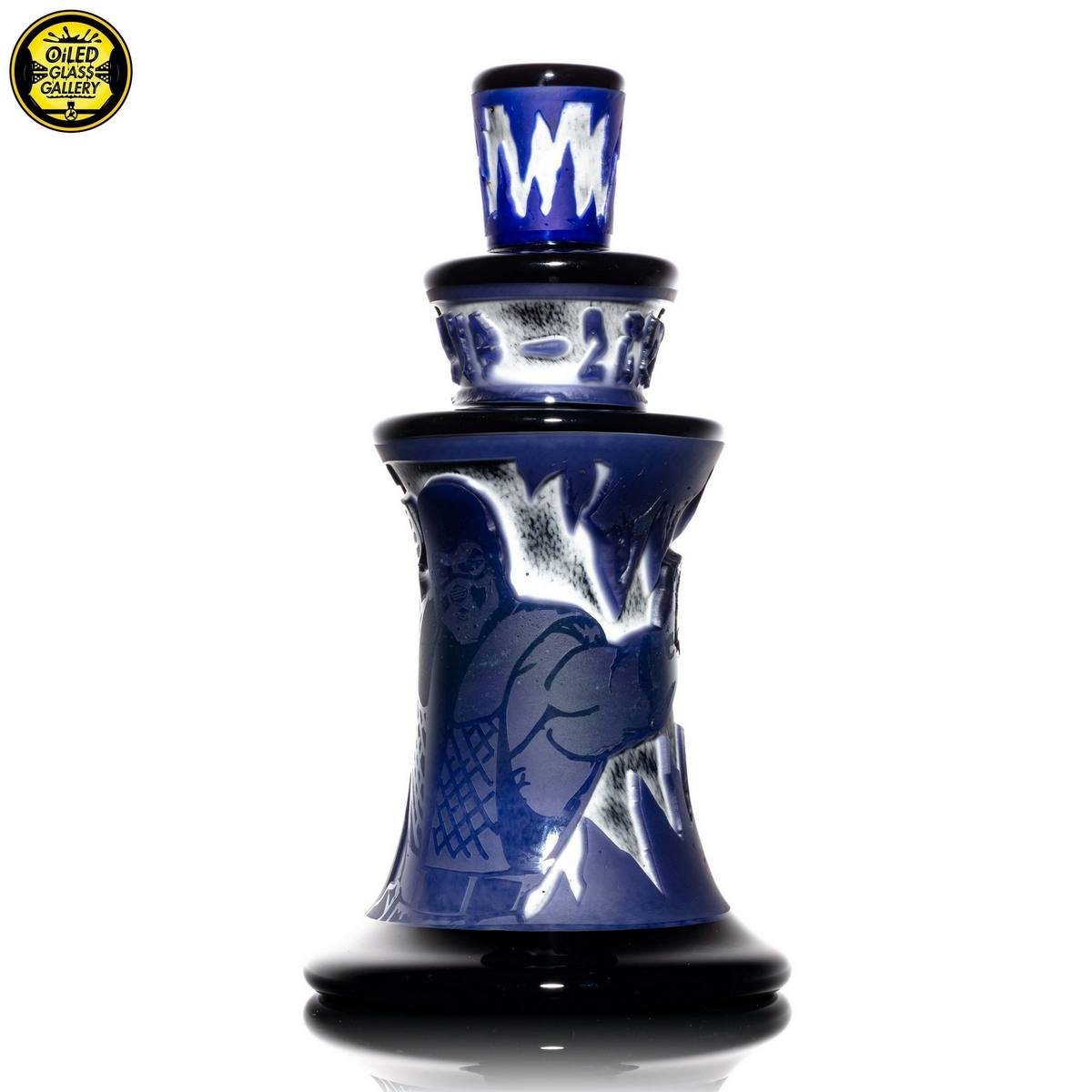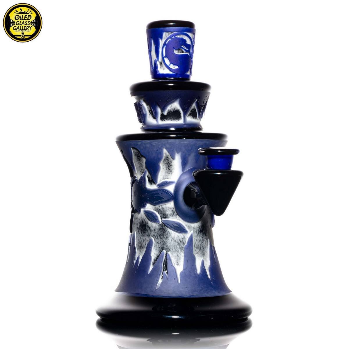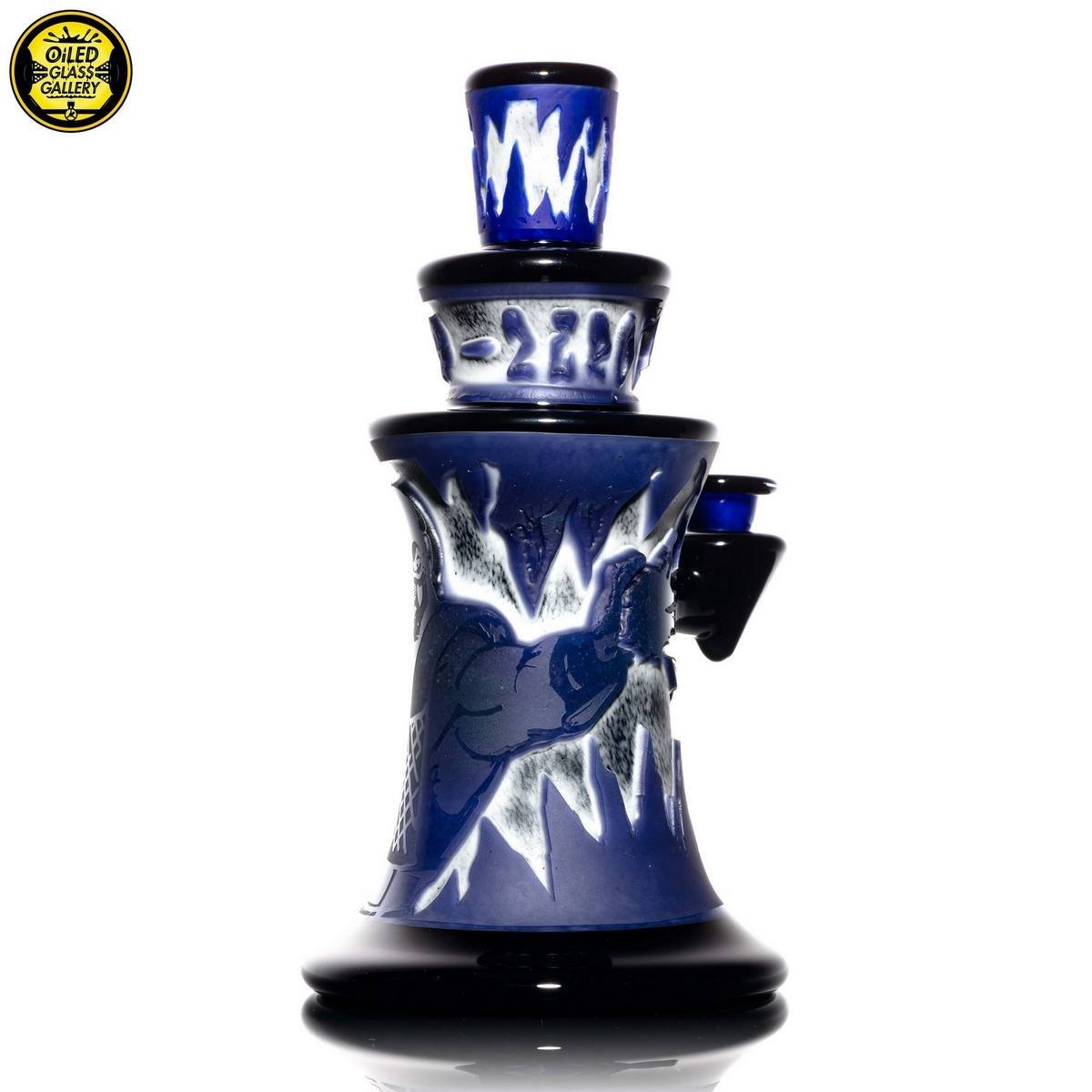 2023 10mm 7.25in “Mortal Kombat” Sub-Zero Carved Jammer tube made of a Northstar Glass Cobalt, Northstar Glass Star White and Northstar Glass Jet Black. Features multiple layers of deep carvings into the glass along the can and the Mortal Kombat logo on the neck. Comes with a matching 25mm bubble cap, has a 4-hole inverted showerhead perc and comes shipped in a Pelican case.