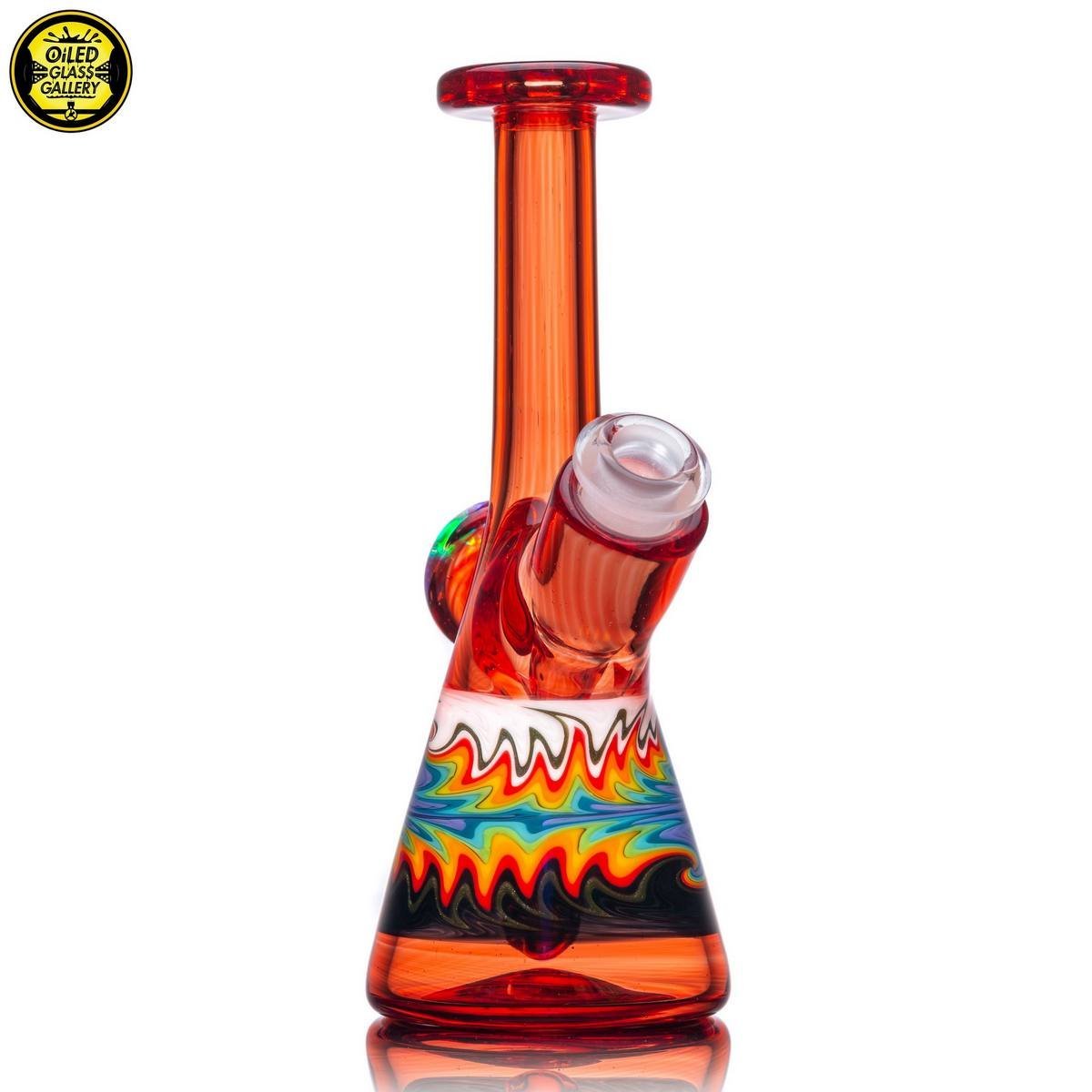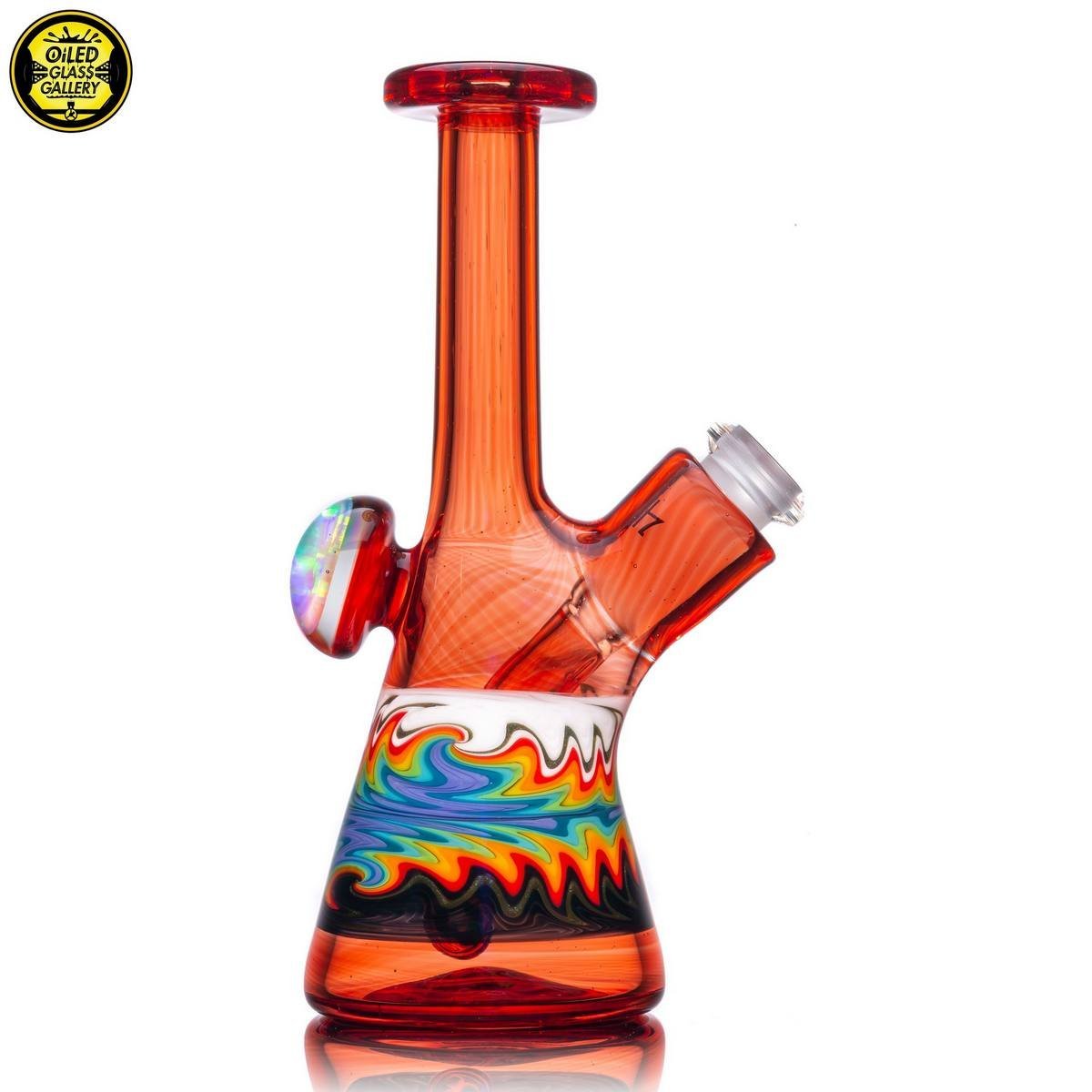 2021 10mm 5.5in Rainbow Wig Wag Mini Tube made of Northstar Glass Pomegranate and Colorado Color Company rainbow tubing with a huge encased opal coin mib on the back. Comes with a matching removable 2-hole signature downstem.