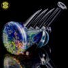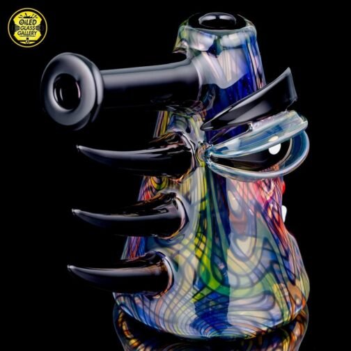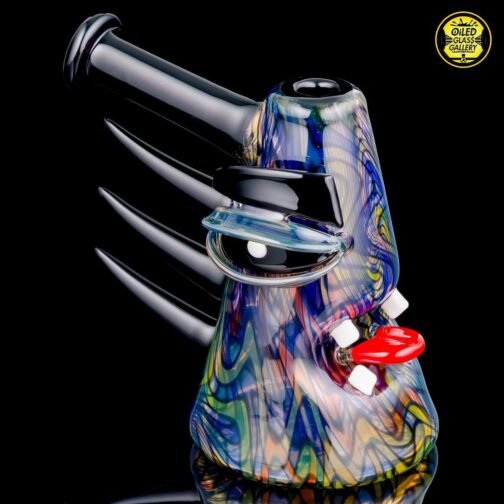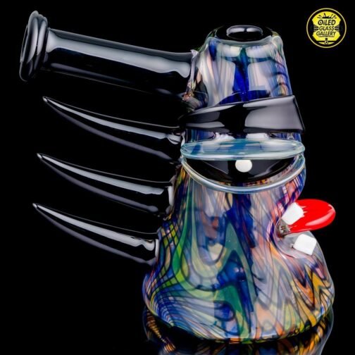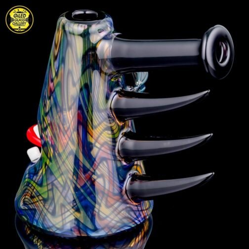 2018 10mm 4.5in Shredder with Pomegranate, Terps, Lemondrop, Crippy, Blue Dream, Purple Rain and Serum plus fume with jet black stringers bubbler and a pomegranate over crayon red tongue with jet black and star white eye. This piece comes shipped in a Black Pelican 1200 case.