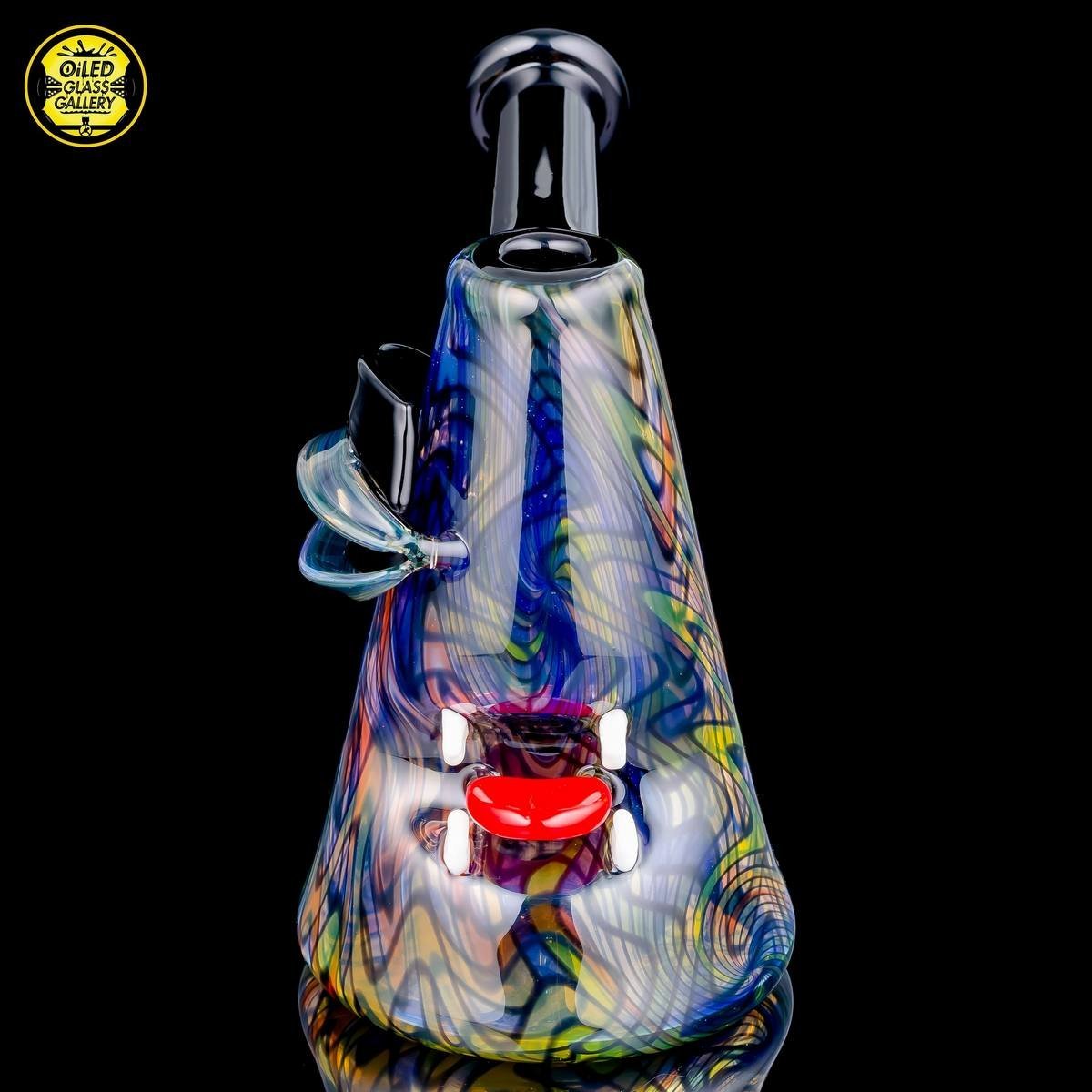 2018 10mm 4.5in Shredder with Pomegranate, Terps, Lemondrop, Crippy, Blue Dream, Purple Rain and Serum plus fume with jet black stringers bubbler and a pomegranate over crayon red tongue with jet black and star white eye. This piece comes shipped in a Black Pelican 1200 case.