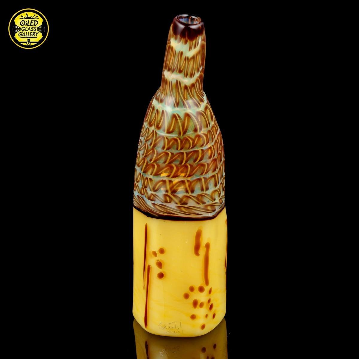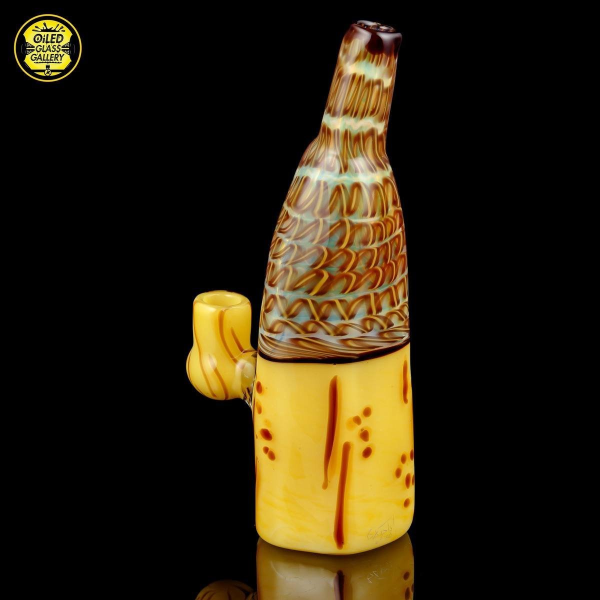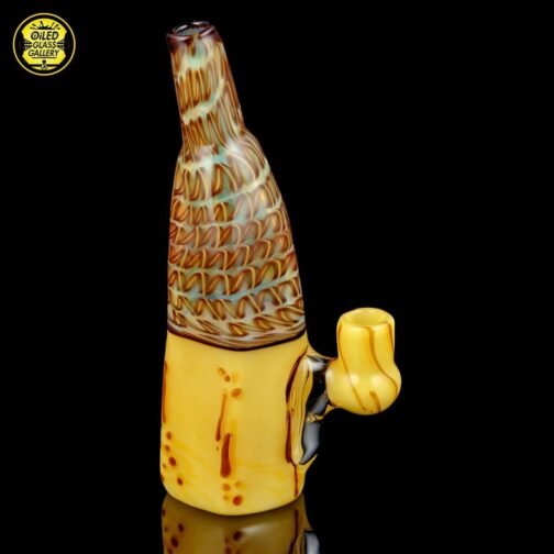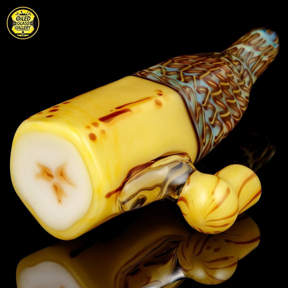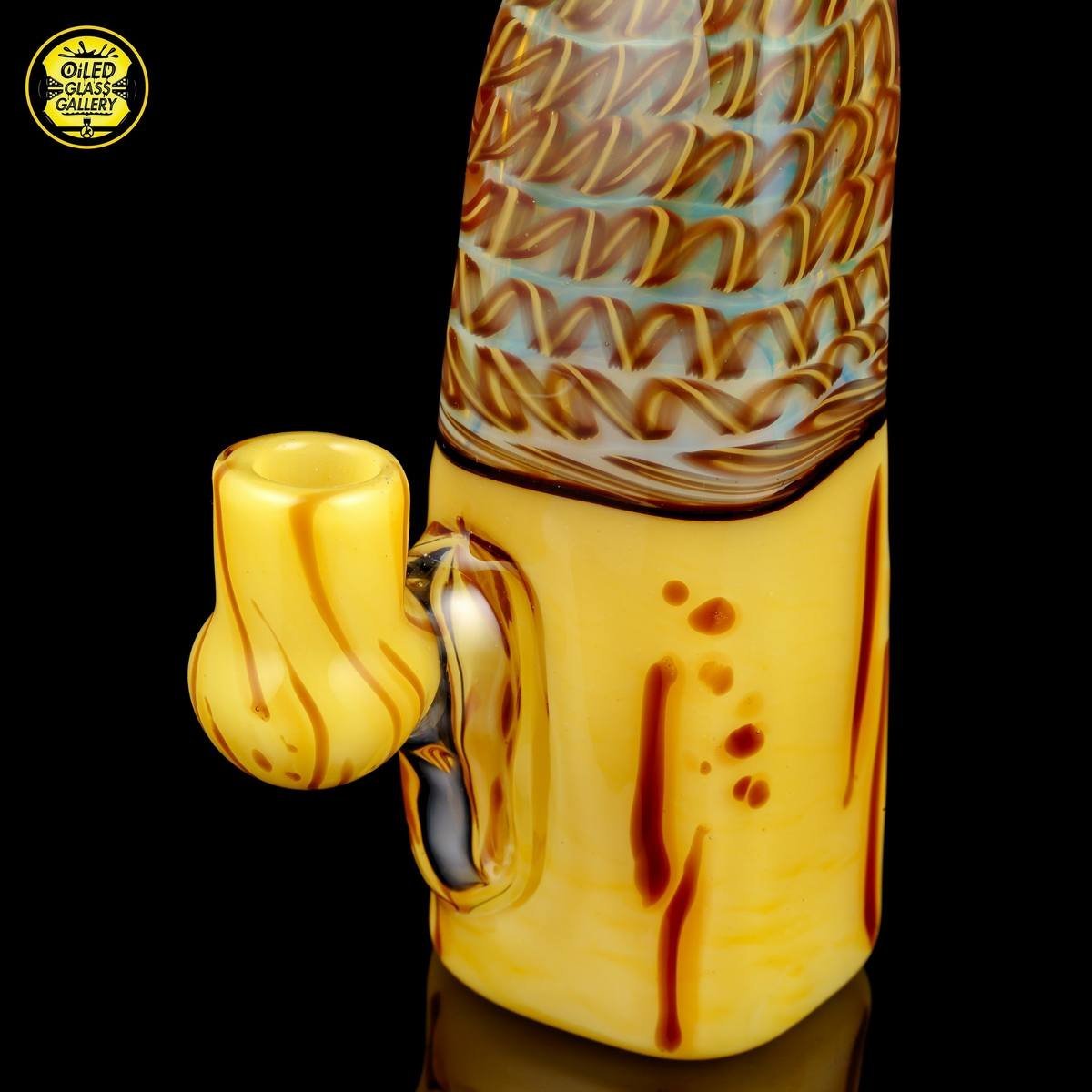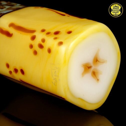 2020 10mm 6in Silver Fumed Latticino Banana Banger Hanger Tube. Joint and base are made using Momka’s Glass Lemon Yellow and Glass Alchemy Walnut and Trautman Art Glass Honey Badger and Ivory Tusk. Comes shipped in a Black Apache 1800 case.