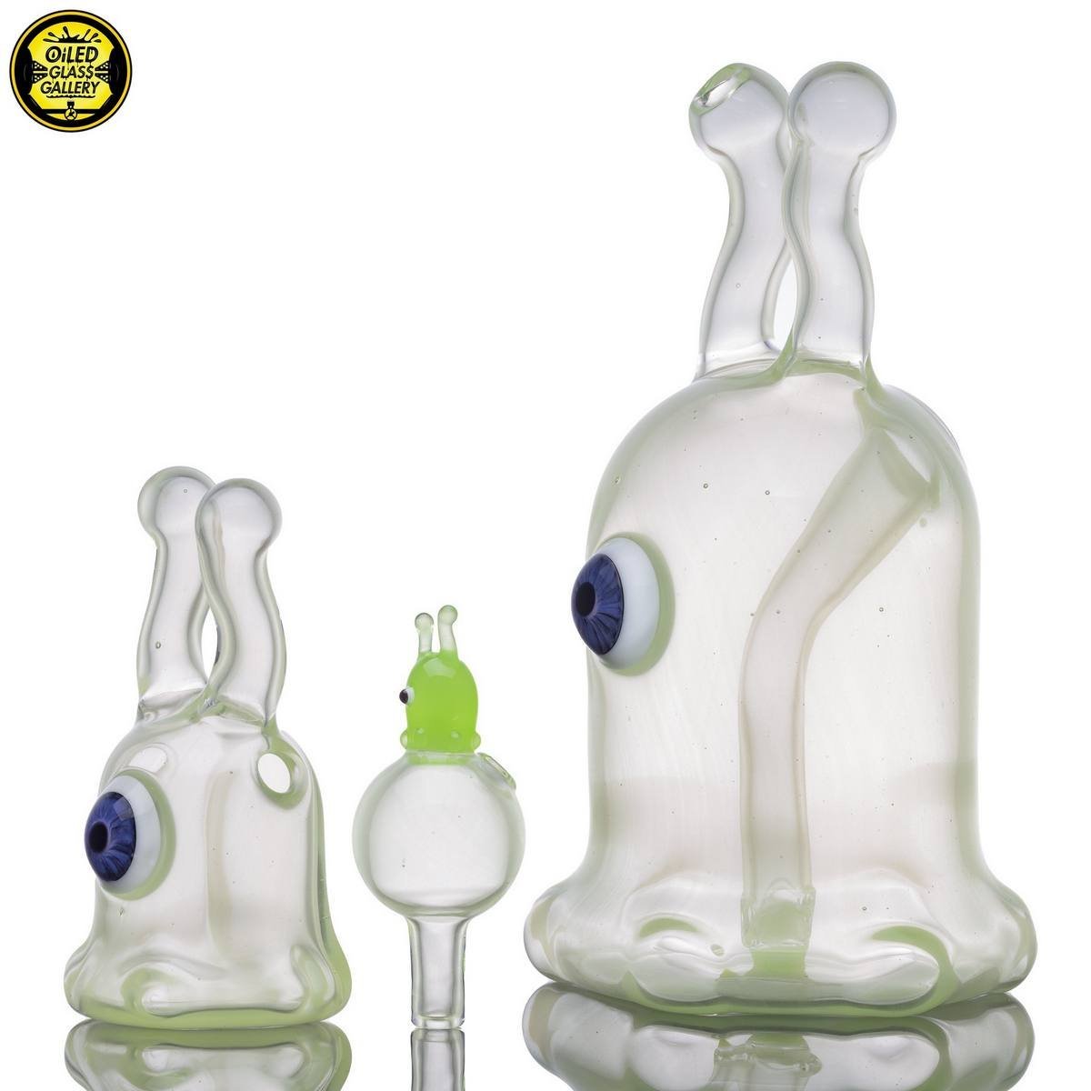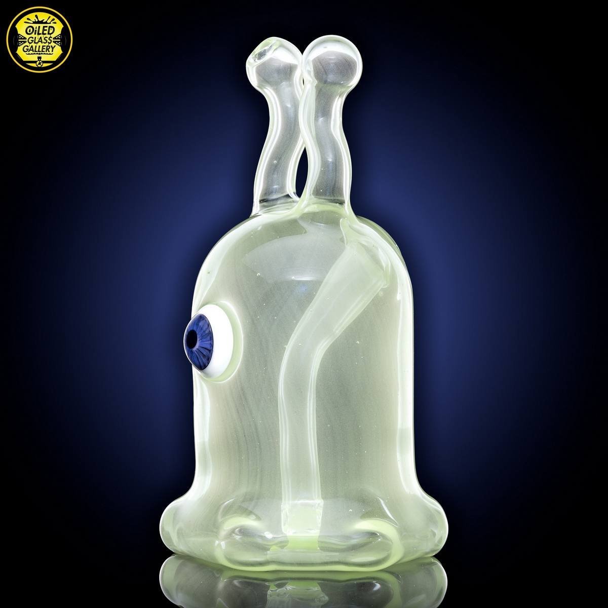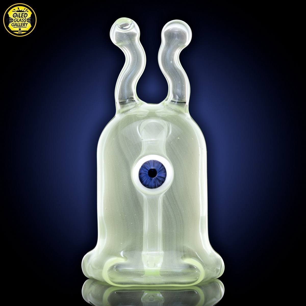 2020 10mm 5.5in Sluggo made with PDX Tubing Company Ghost Antidote featuring new style eyes made of Northstar Glass Purple Urple, a matching bubble cap topped with a Glass Alchemy Double Dose Sluggo, and a large matching Sluggo pendant.
