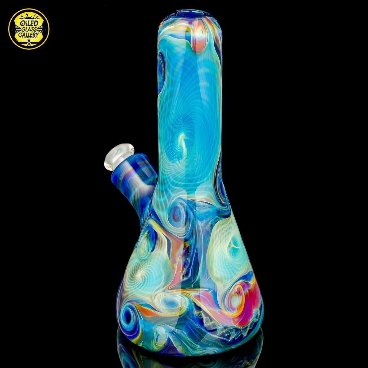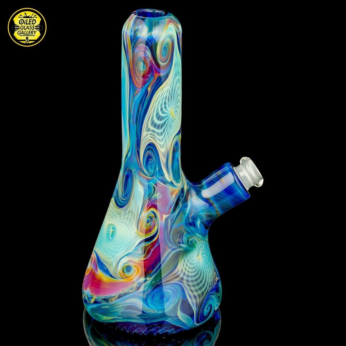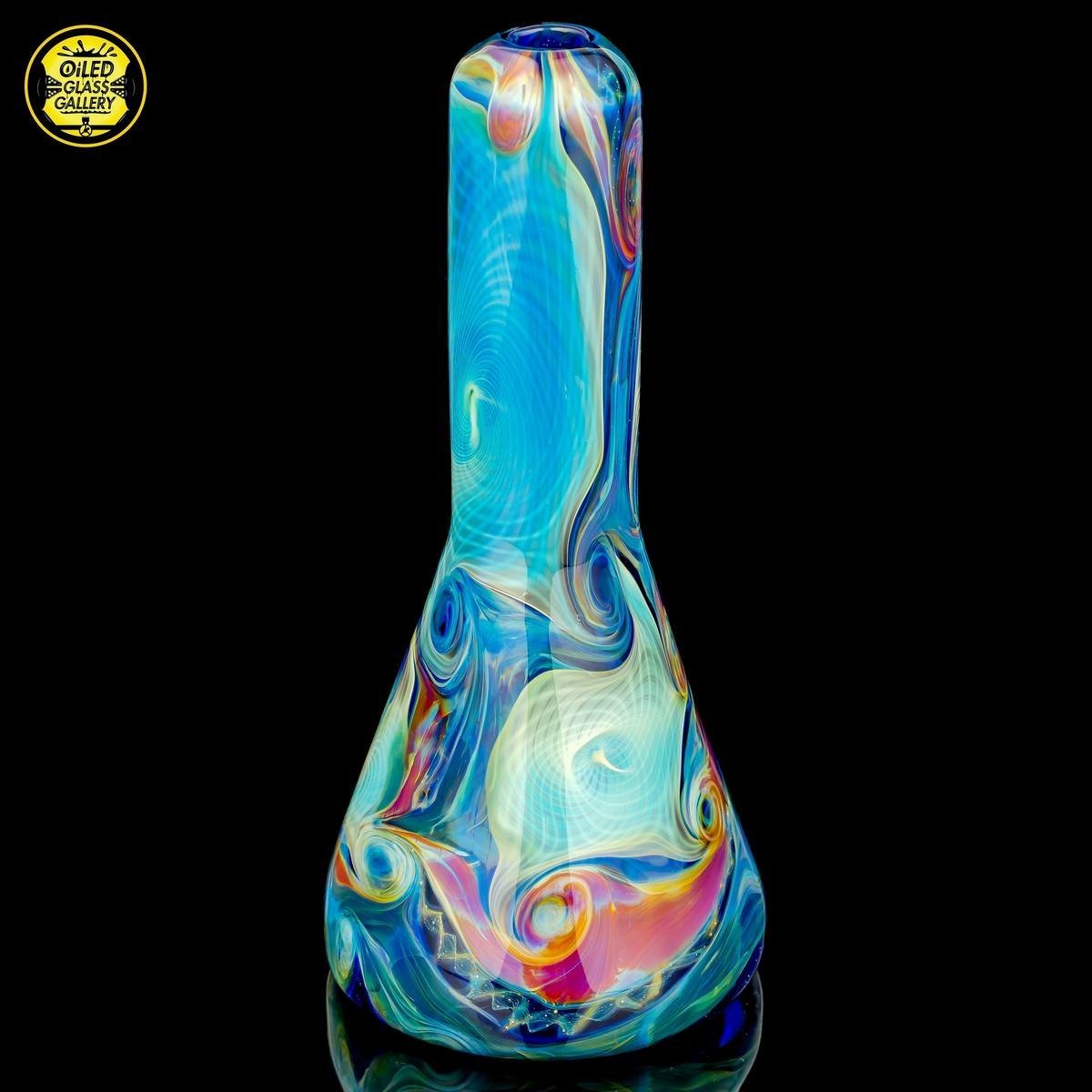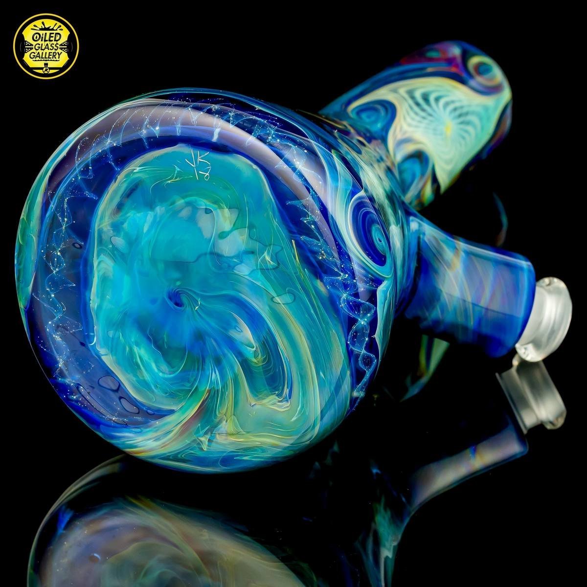 2018 10mm 6.5in Starry Night Irid and Amber Purple Fumed Retticello Tube. This piece has some incredible silver fumed retticello embedded within and comes with a 14mm-10mm removable 2-hole downstem, all shipped in a Pelican.