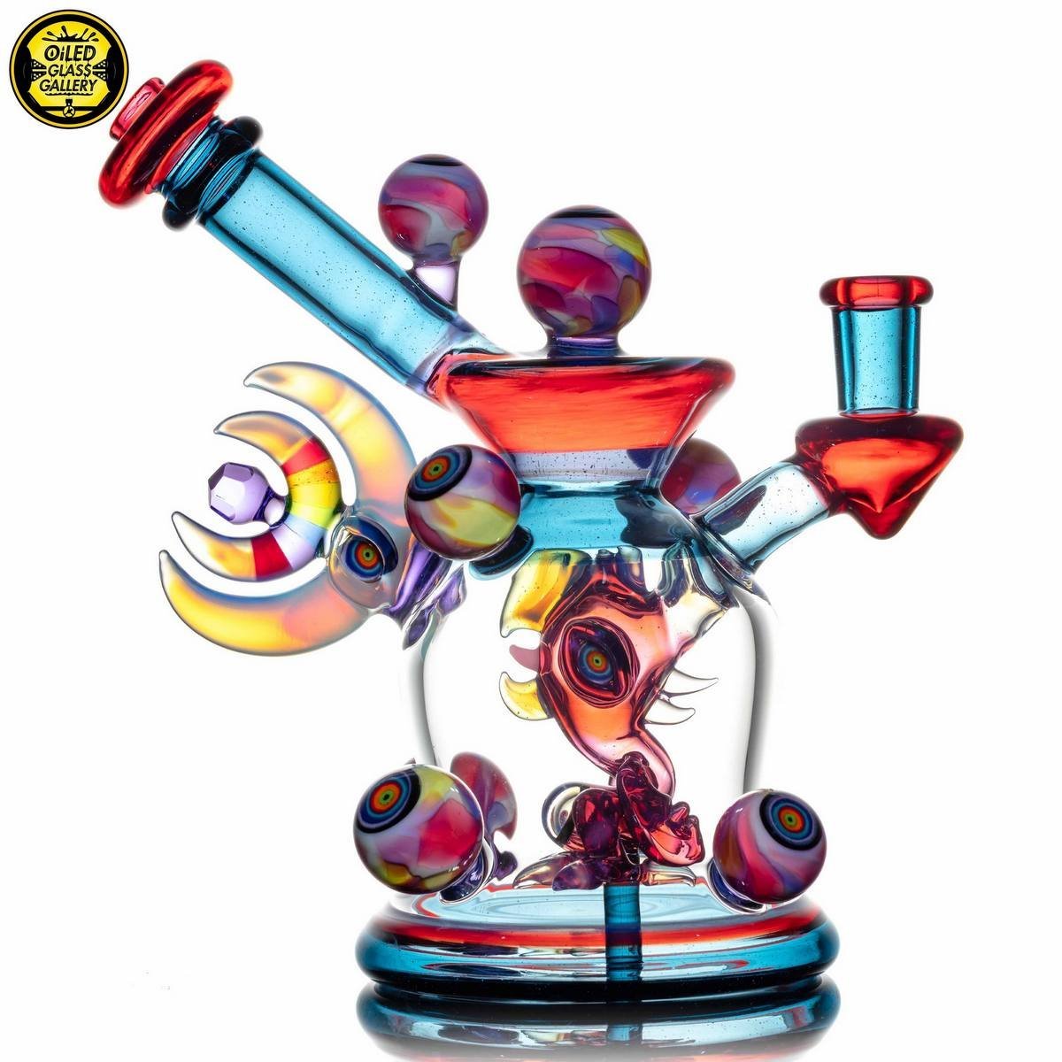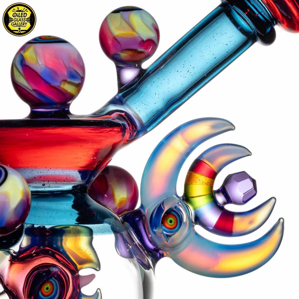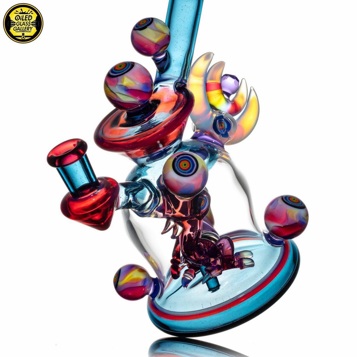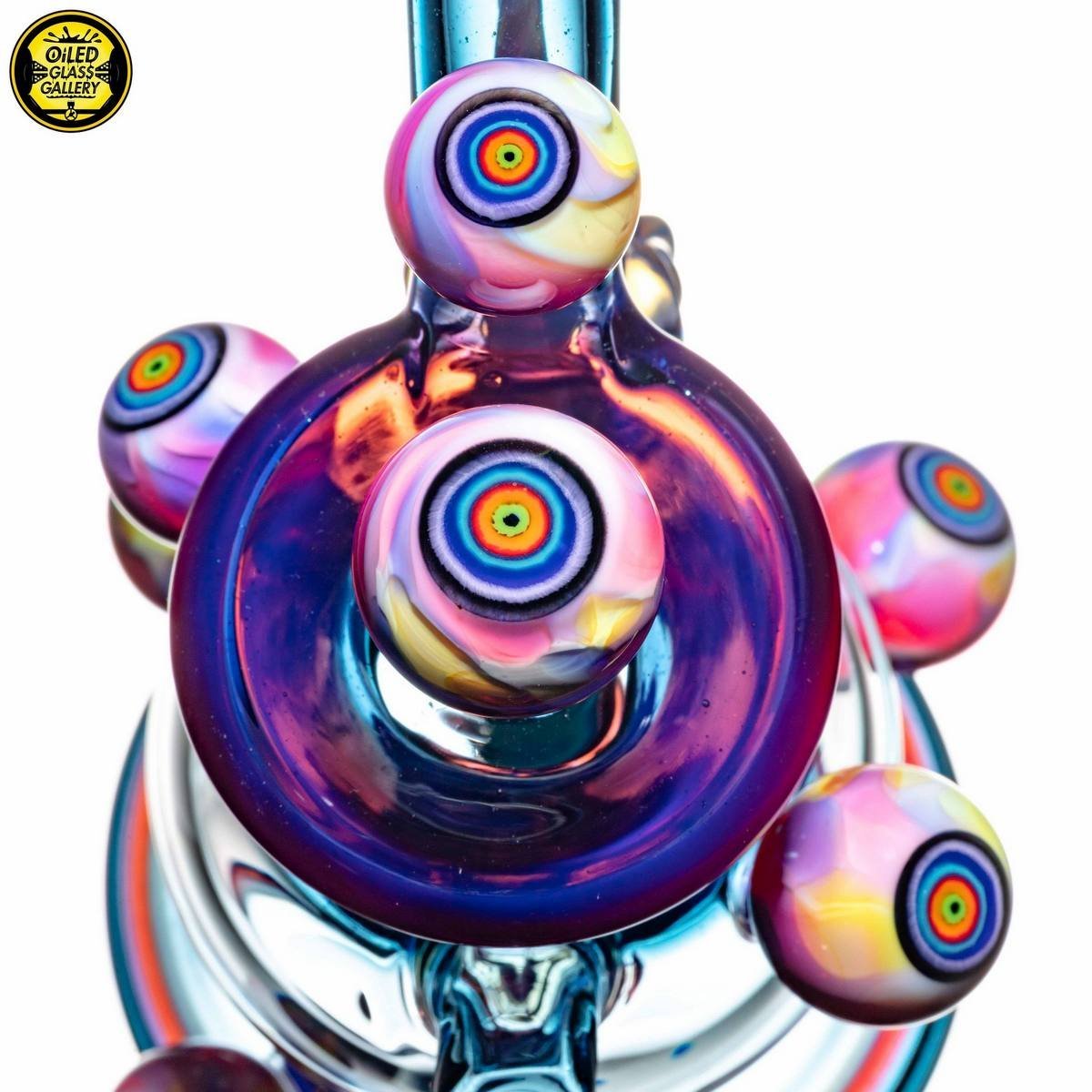 2023 10mm 7in Toucan Shredder tube made using Northstar Glass Atomic Blue Stardust and Molten Aura Telemagenta. Features a sculpted Toucan perk, mounted sculpted millefiori eye moons with faceted mib on the back, and seven mounted millefiori eyeball mibs. This piece comes shipped in a Blue Pelican 1300 case.