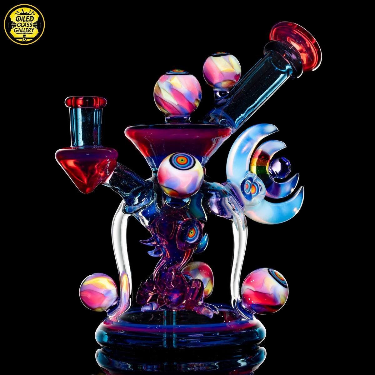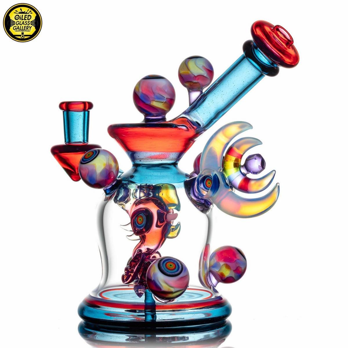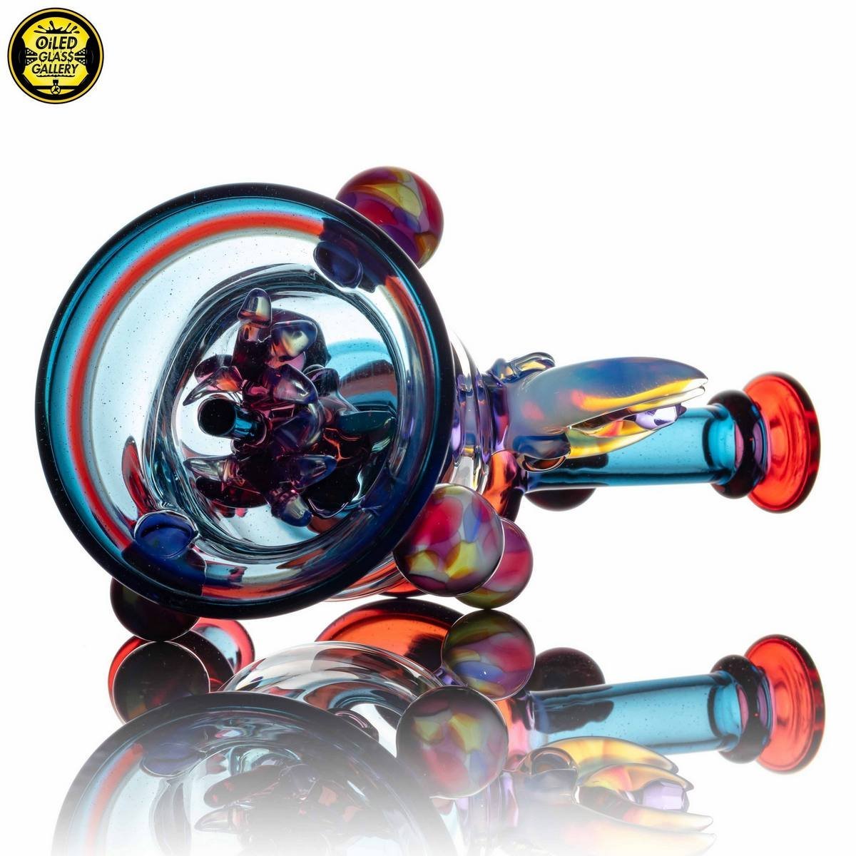 2023 10mm 7in Toucan Shredder tube made using Northstar Glass Atomic Blue Stardust and Molten Aura Telemagenta. Features a sculpted Toucan perk, mounted sculpted millefiori eye moons with faceted mib on the back, and seven mounted millefiori eyeball mibs. This piece comes shipped in a Blue Pelican 1300 case.