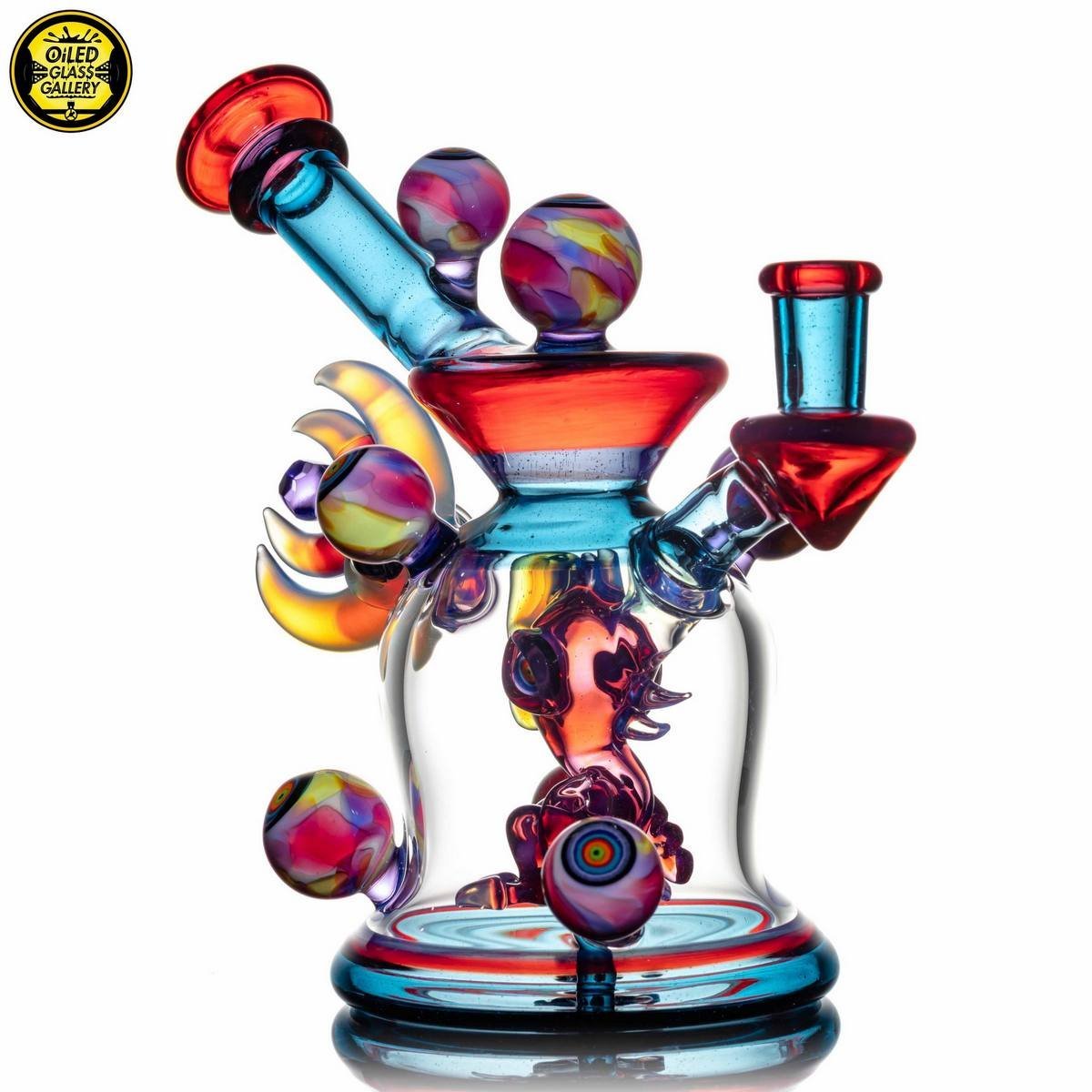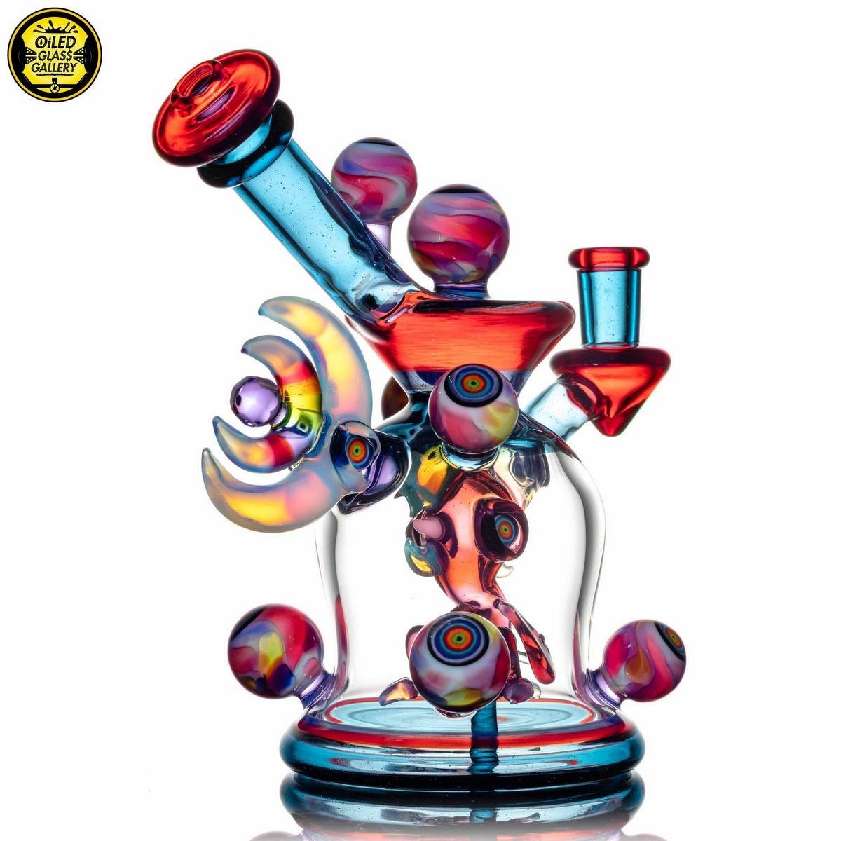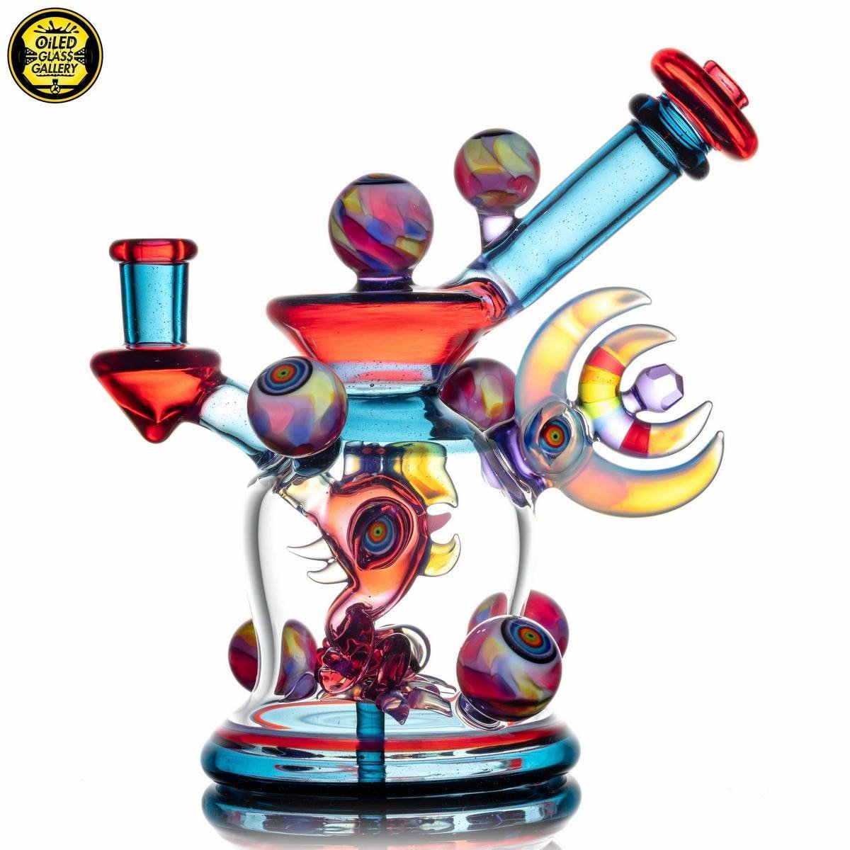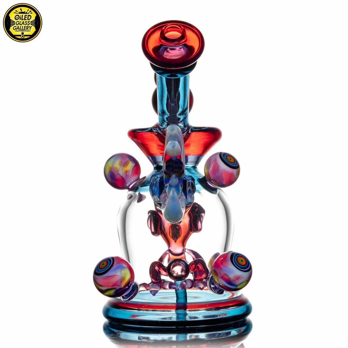 2023 10mm 7in Toucan Shredder tube made using Northstar Glass Atomic Blue Stardust and Molten Aura Telemagenta. Features a sculpted Toucan perk, mounted sculpted millefiori eye moons with faceted mib on the back, and seven mounted millefiori eyeball mibs. This piece comes shipped in a Blue Pelican 1300 case.