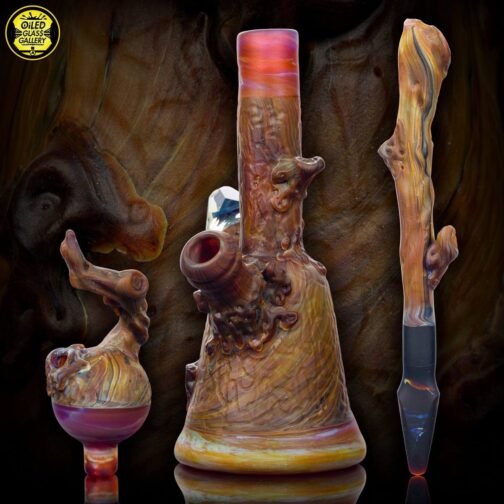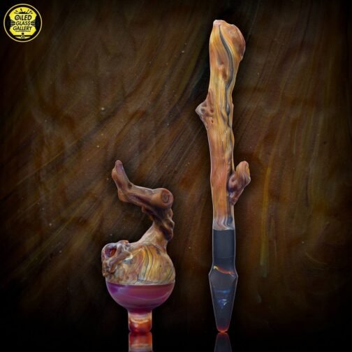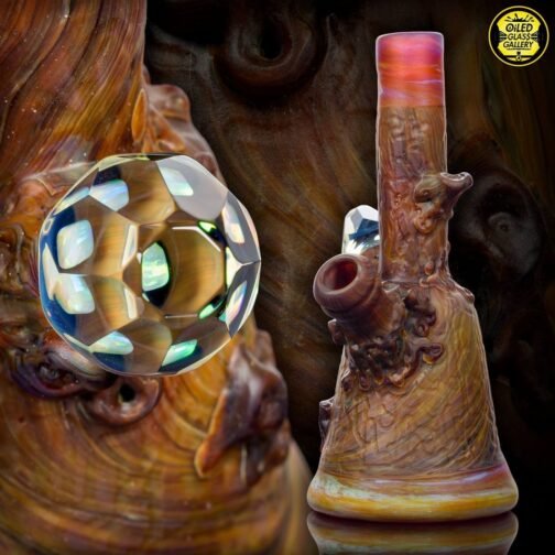 2020 10mm 5.25in Tree Tech Tube set made with sandblasted Glass Alchemy Double Passion featuring a faceted opal encased mib, a matching dabber and a bubble cap, all shipped in a Yellow Pelican 1200 case.