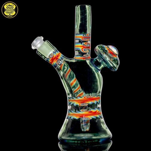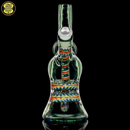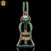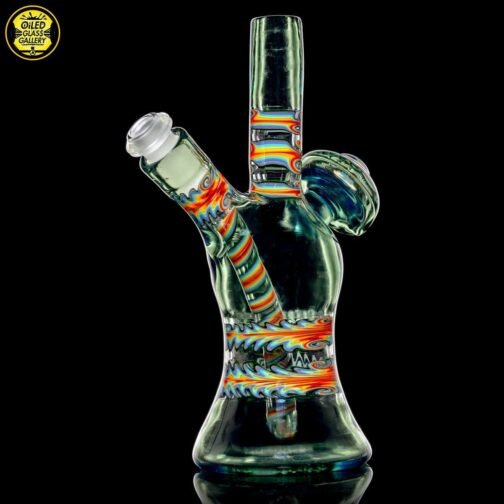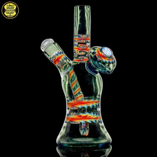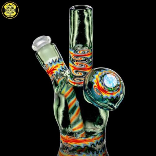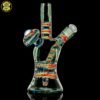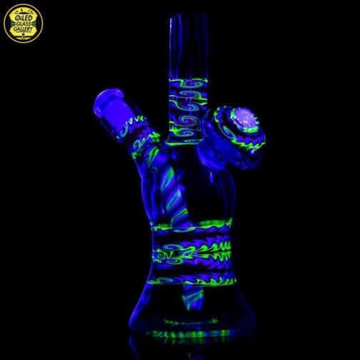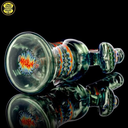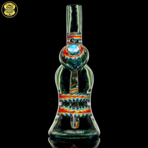 2020 10mm 6.5in UV Bipolar Wig Wag Tube made with Glass Alchemy Sea Breeze with Molten Aura Citrine. Has a beautiful UV hollow disc wig wag cab mounted on the back featuring a magnifying 15mm Green opal coin encasement and comes with a matching 3-hole removable downstem.