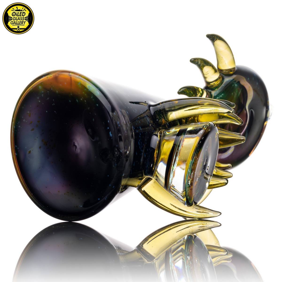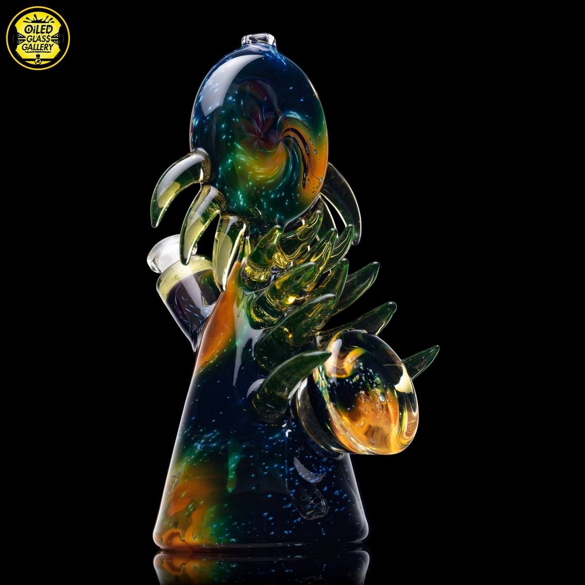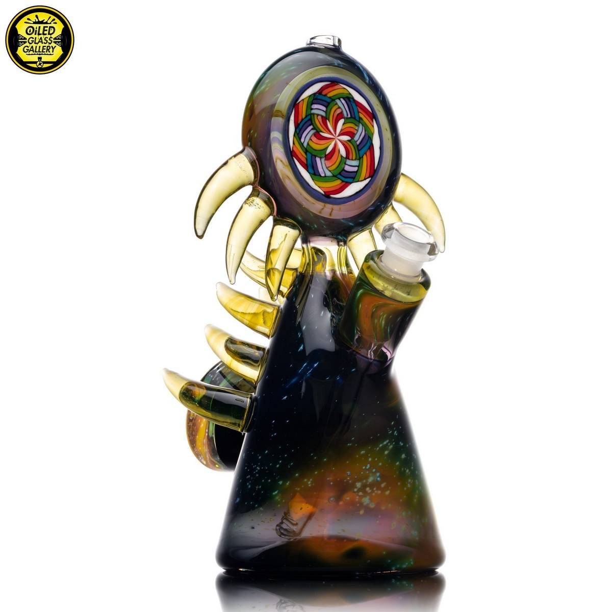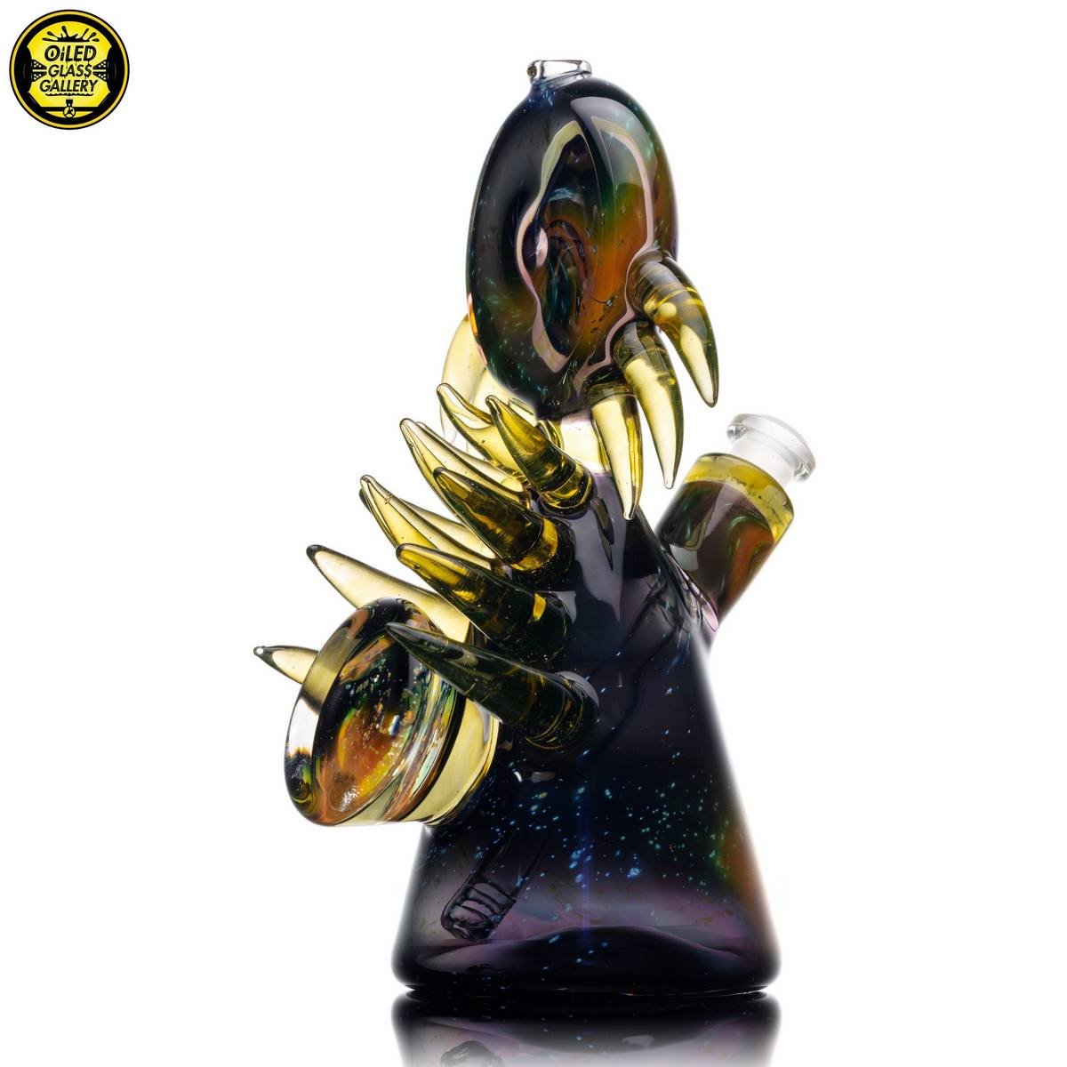 2021 10mm 7in UV Horned Space Fumed Beaker tube made with Gold & Silver fumed Space Tech tubing. Features a stunning fillacello mouthpiece section, UV Molten Aura Citrine horns, a huge fumed cab on the back and comes with a 2-slit 1-hole removable downstem.