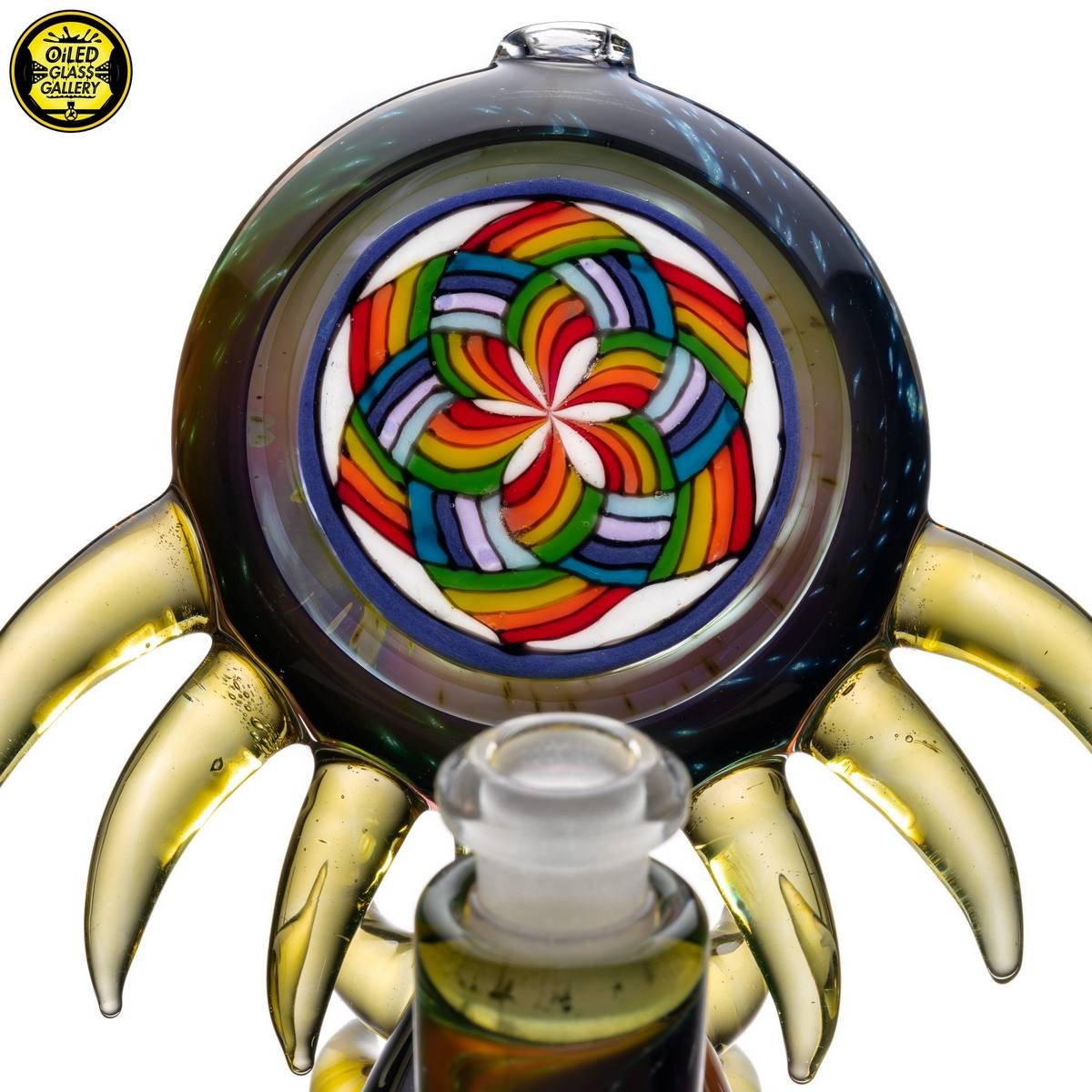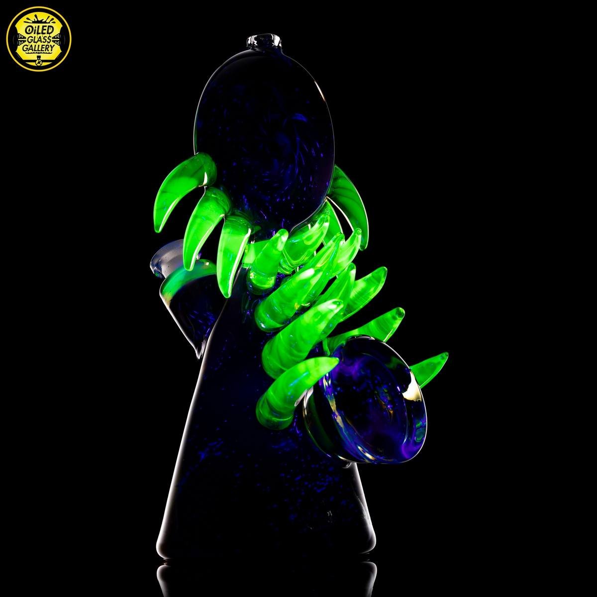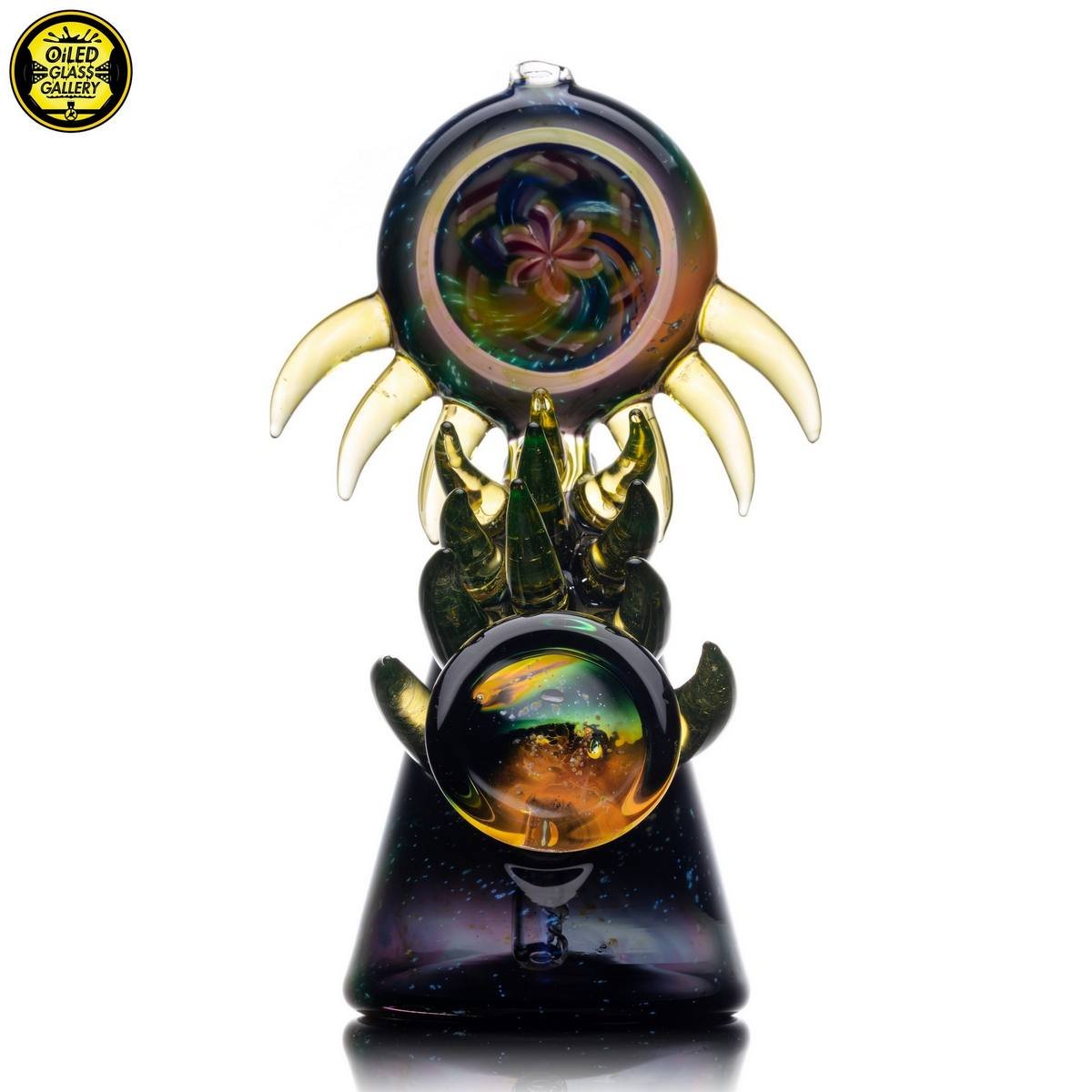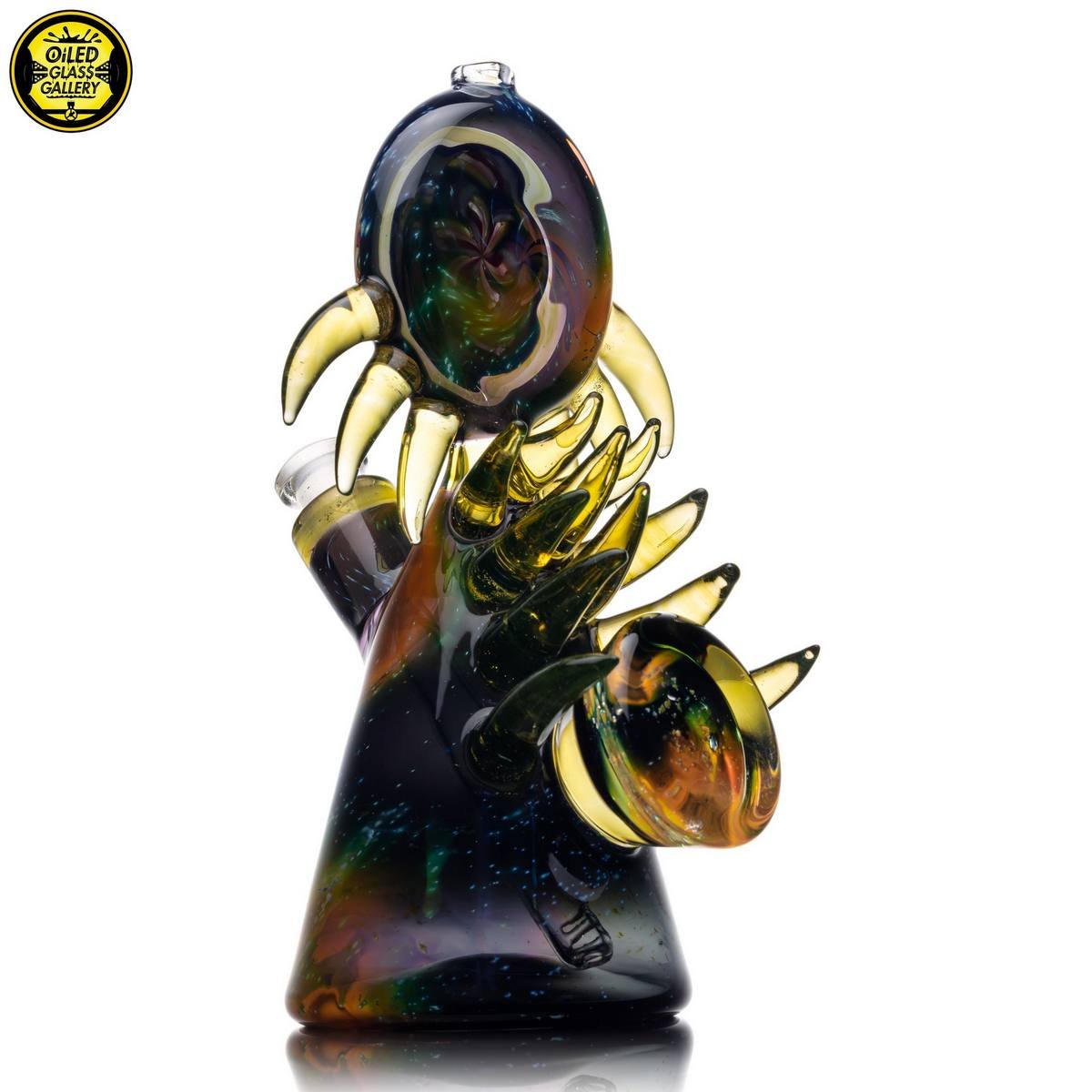 2021 10mm 7in UV Horned Space Fumed Beaker tube made with Gold & Silver fumed Space Tech tubing. Features a stunning fillacello mouthpiece section, UV Molten Aura Citrine horns, a huge fumed cab on the back and comes with a 2-slit 1-hole removable downstem.