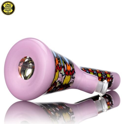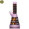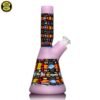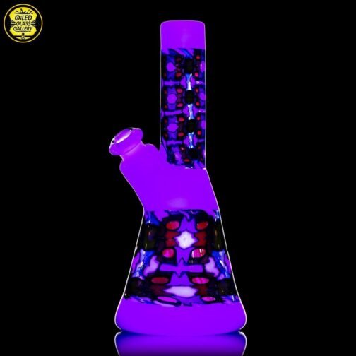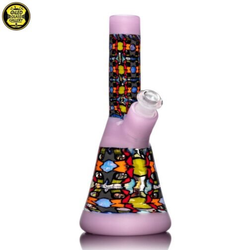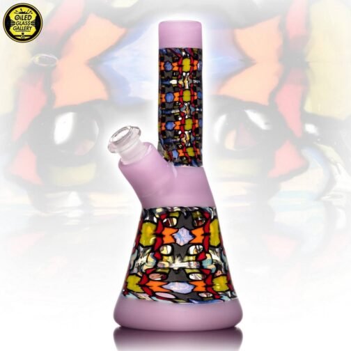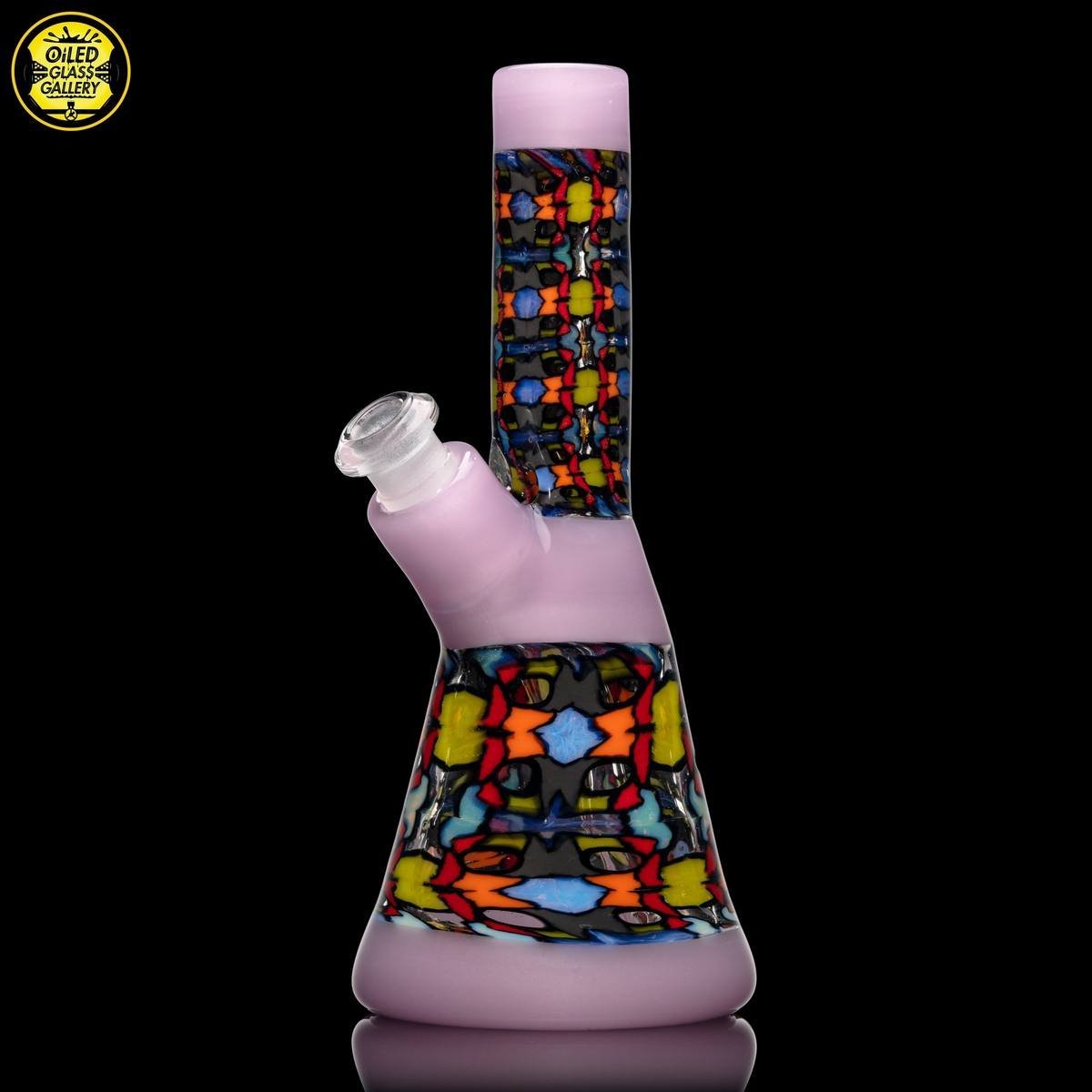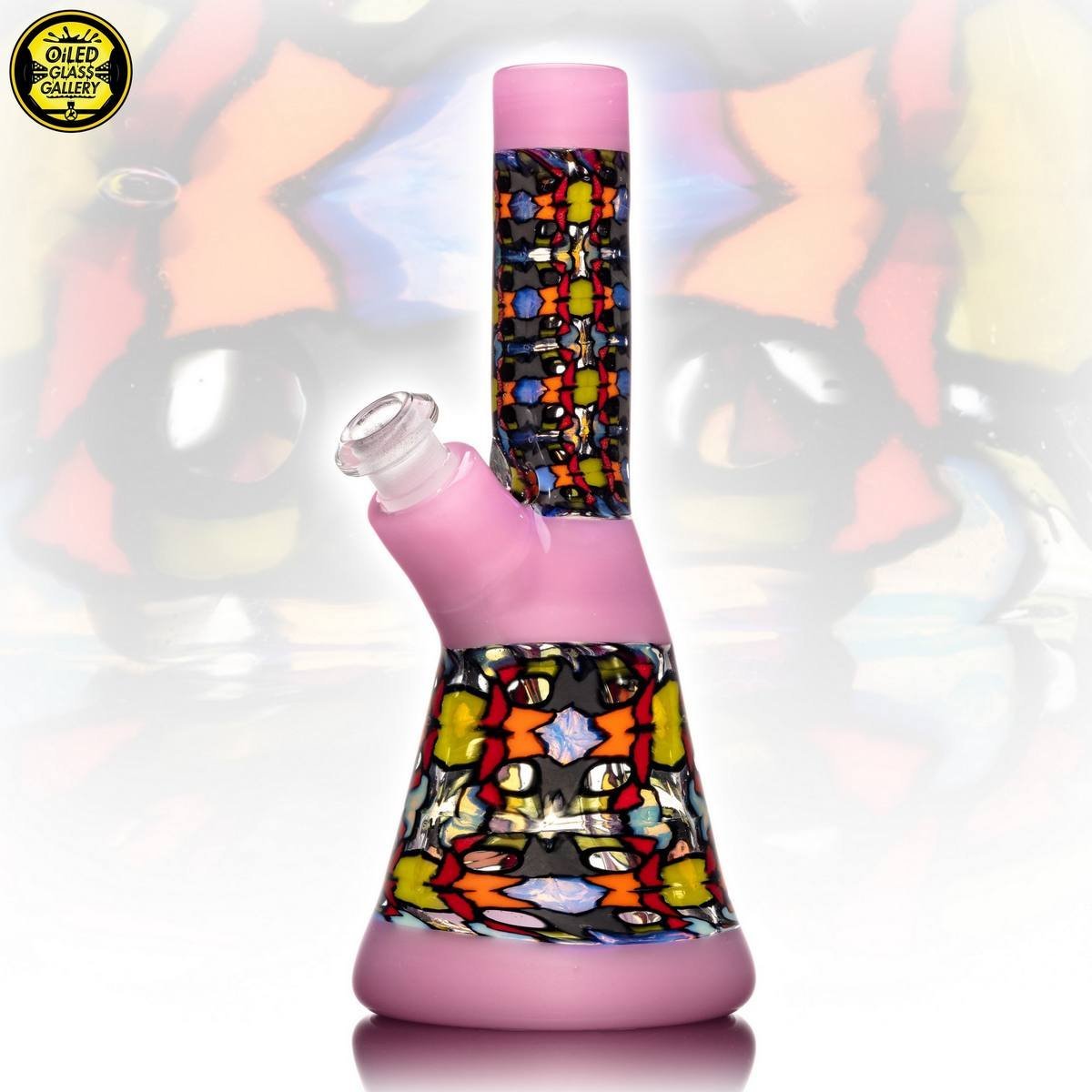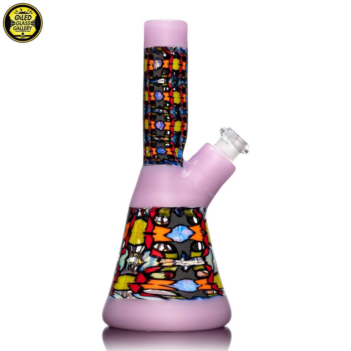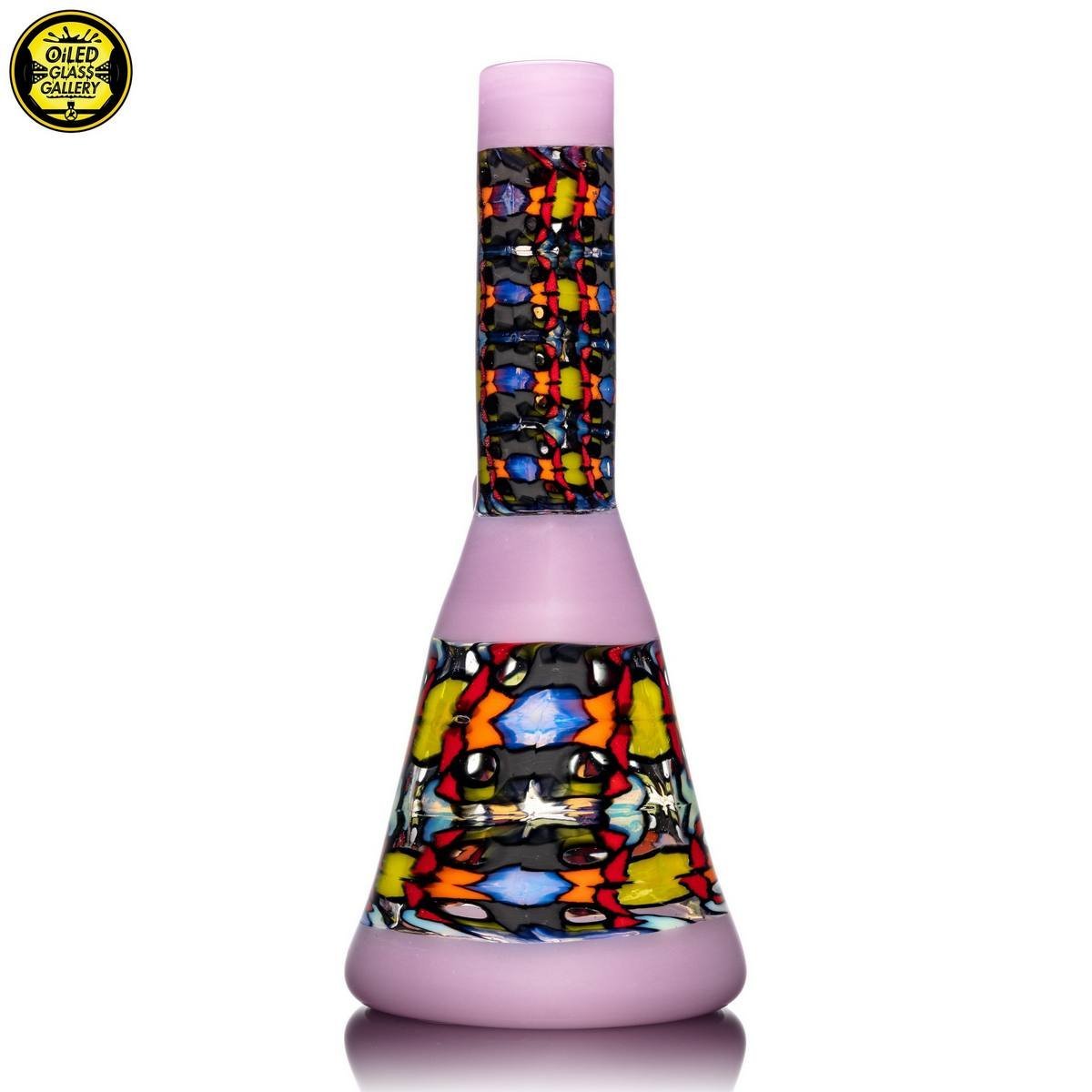 2021 10mm 6.5in UV Millefiori Chipstack Beaker Tube Set with Greasy Glass UV Purple Satin featuring a matching 2-hole removable downstem and bubble cap.
