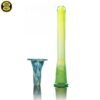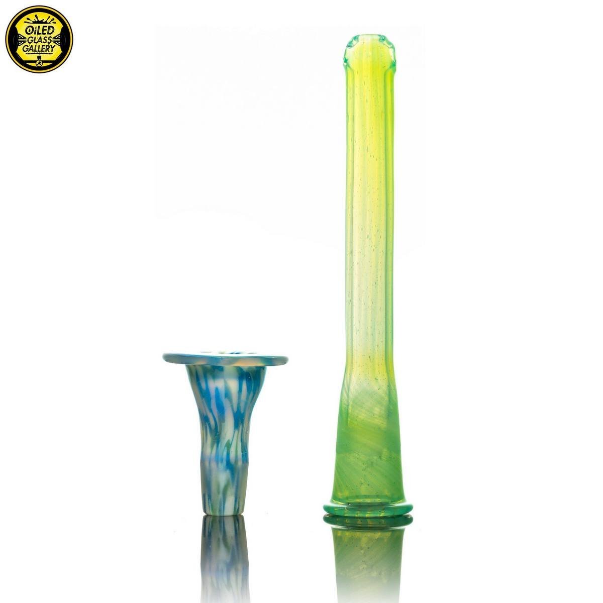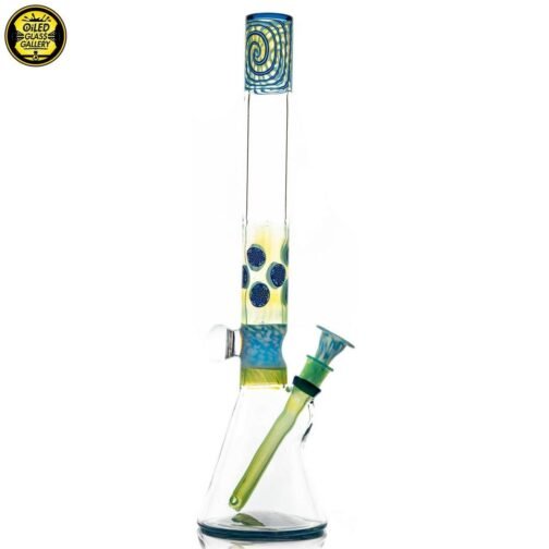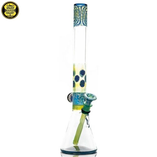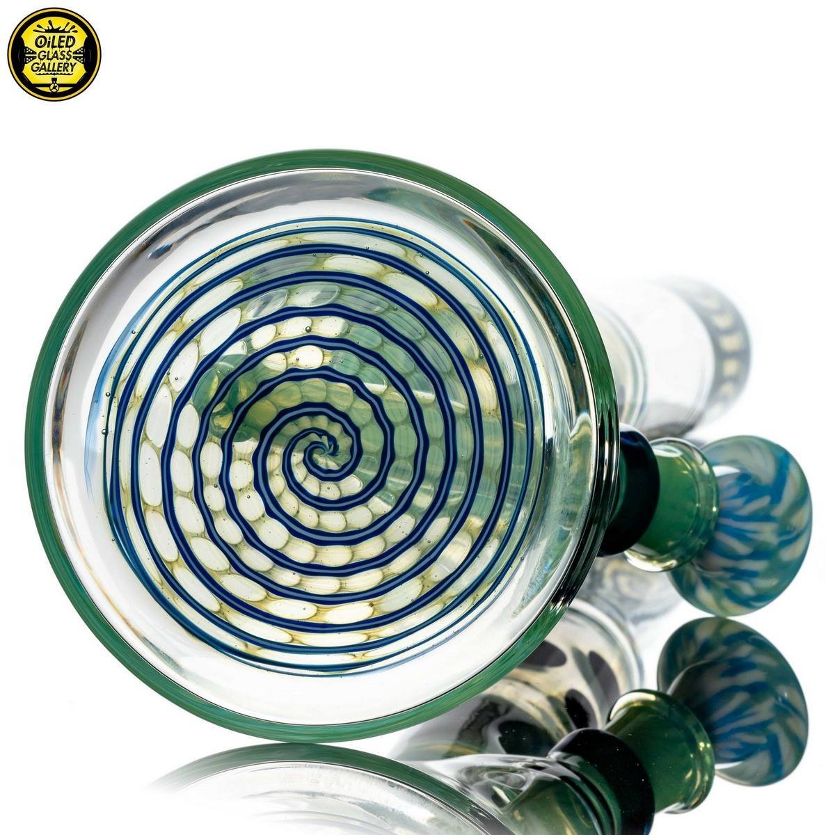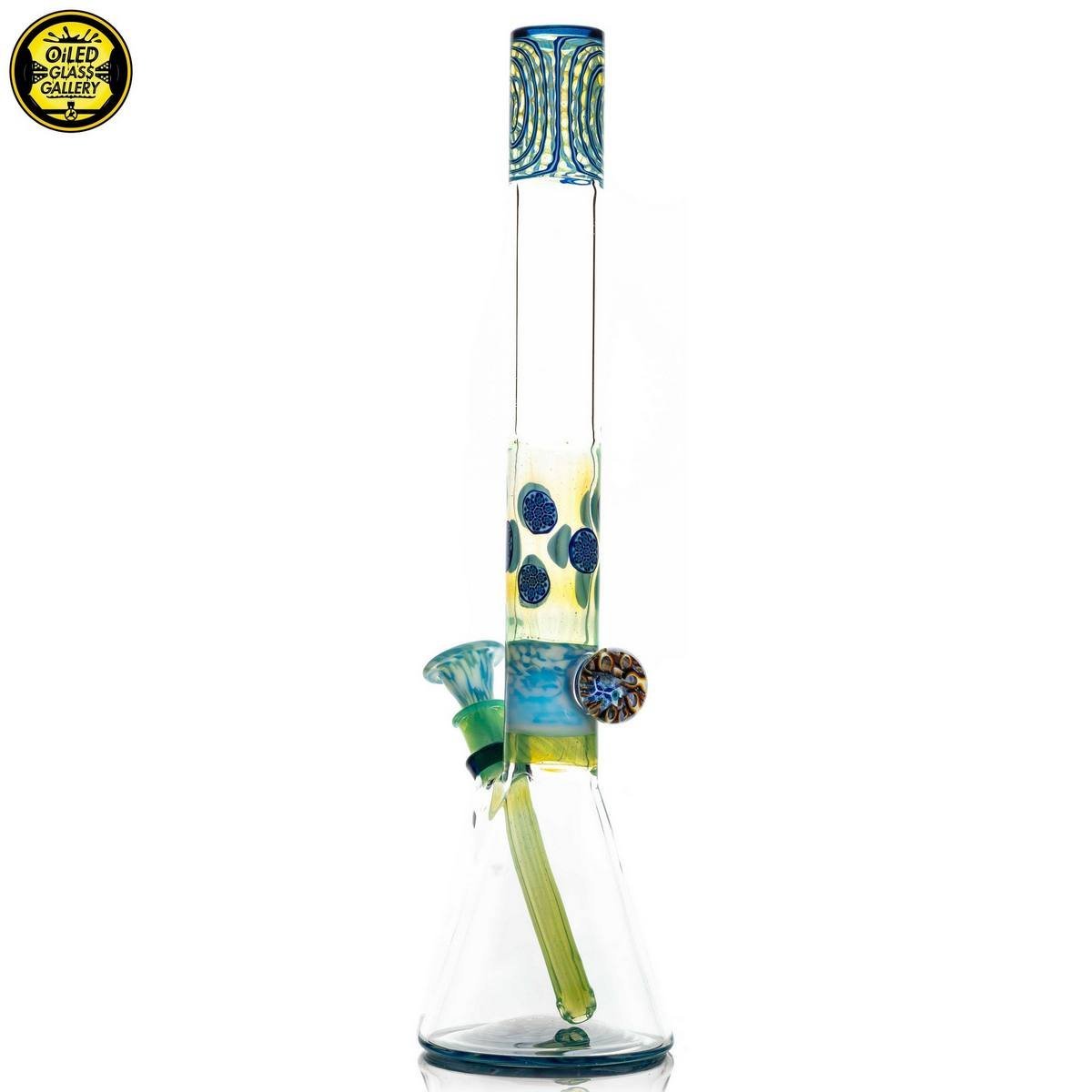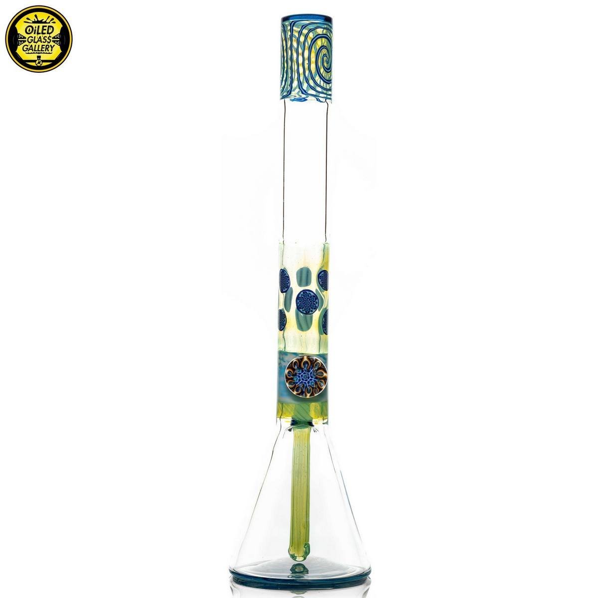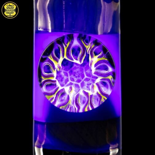 2023 10mm 16.25in UV Millefiori Spiral Linework Beaker Tube made of custom mixed colors featuring a beautiful UV fire murrine cab mounted on the back. This piece comes with a 3-hole downstem and matching slide.