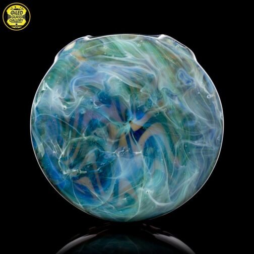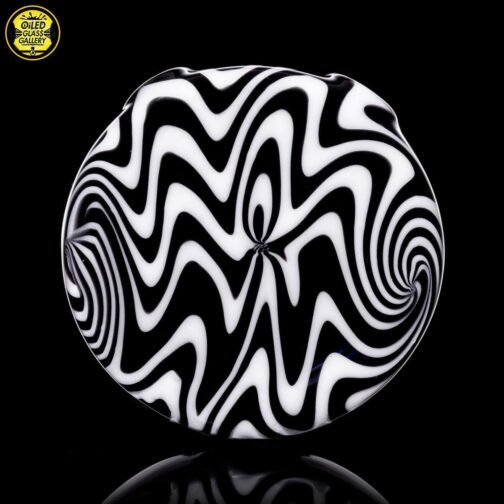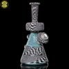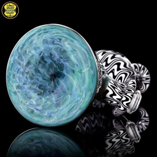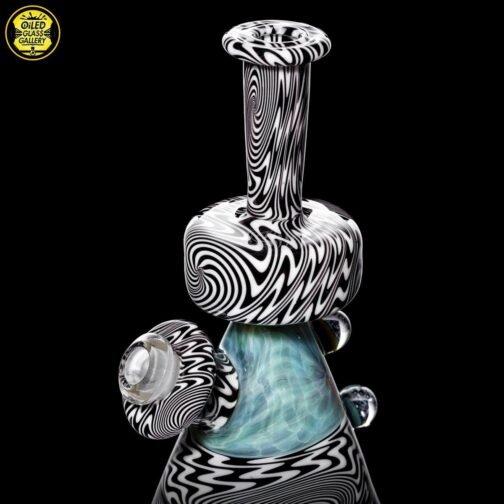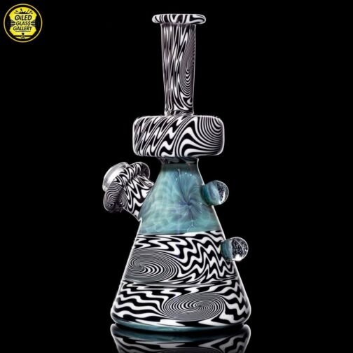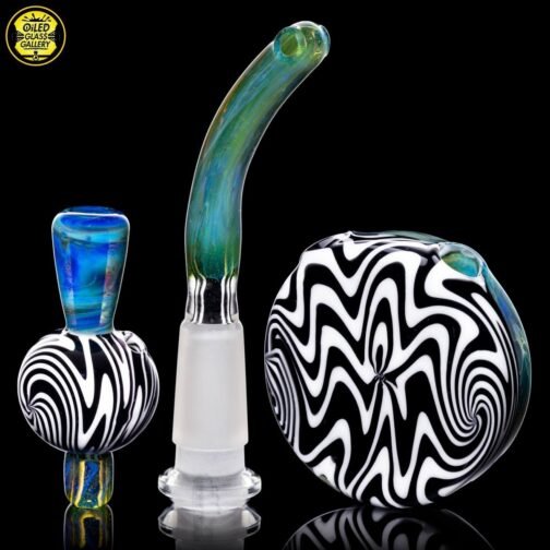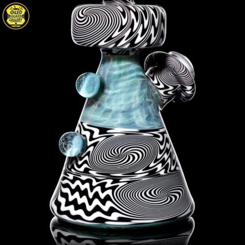 2021 10mm 6.25in Wig Wag Beaker Tube Set made out of Boro Batch Blue Honey with Black and White wig wag sections featuring two Chris Taylor dichroic mibs on the back. This set comes with, a removable downstem, a matching bubble cap and pendant, shipped in an Apache 1800 hardcase.