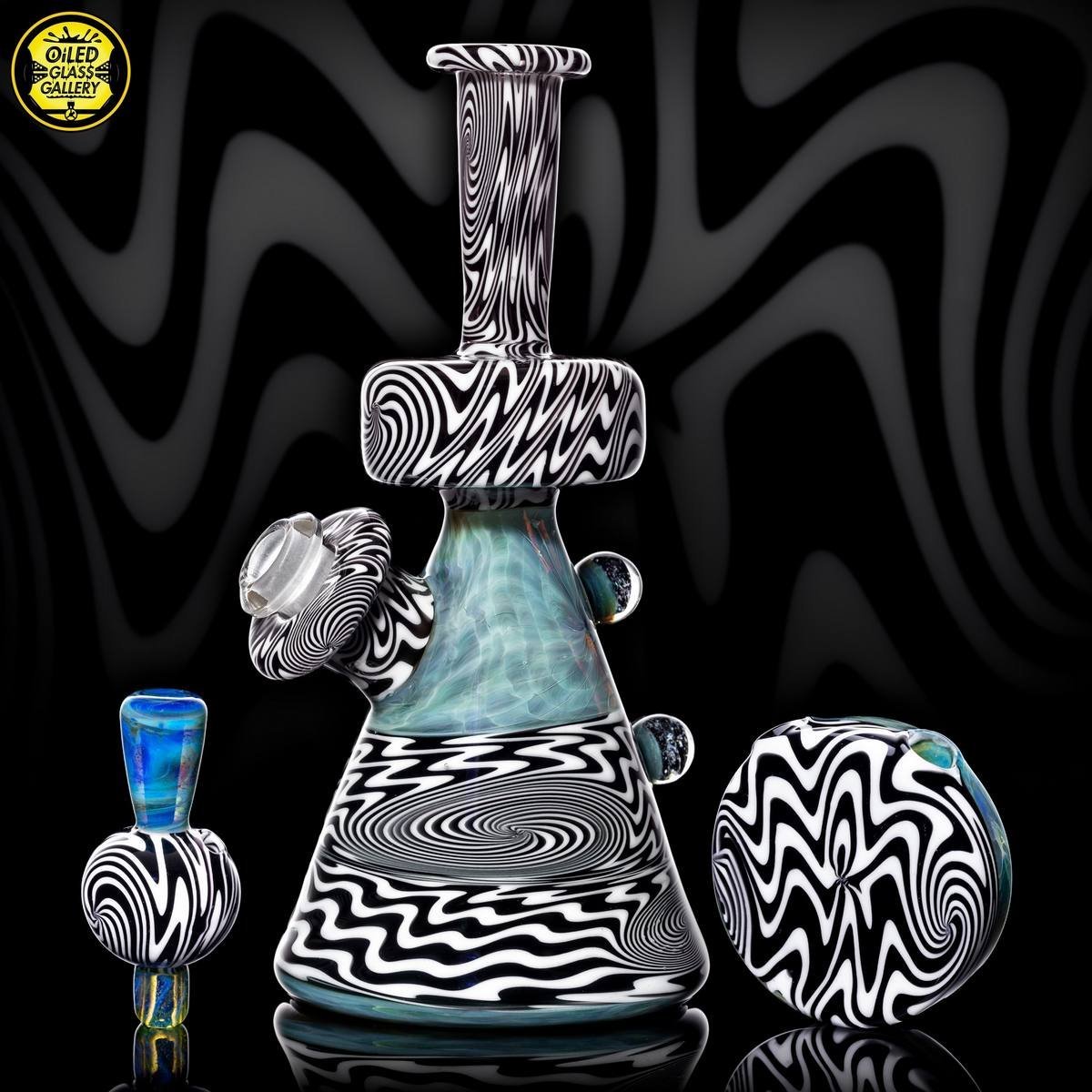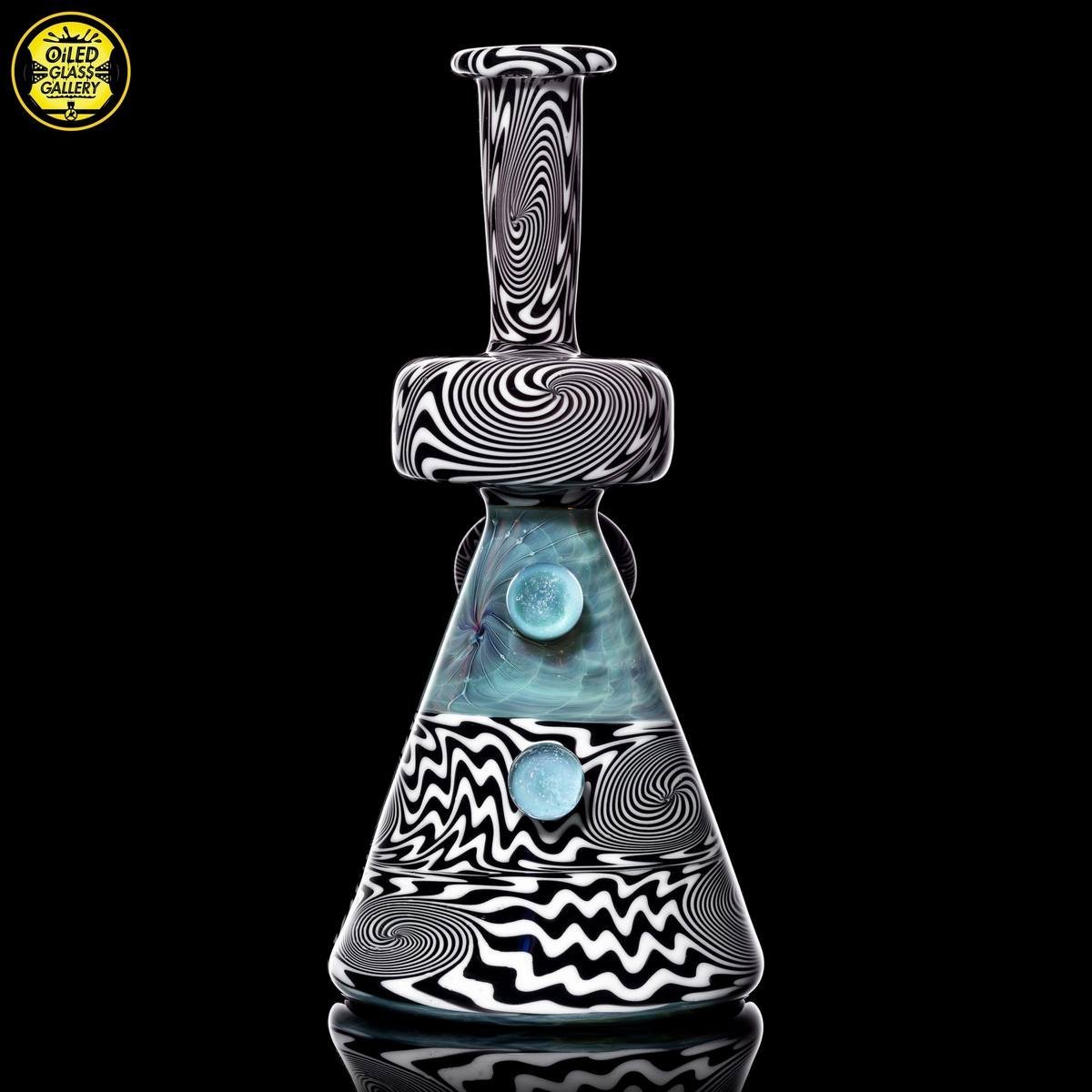 2021 10mm 6.25in Wig Wag Beaker Tube Set made out of Boro Batch Blue Honey with Black and White wig wag sections featuring two Chris Taylor dichroic mibs on the back. This set comes with, a removable downstem, a matching bubble cap and pendant, shipped in an Apache 1800 hardcase.