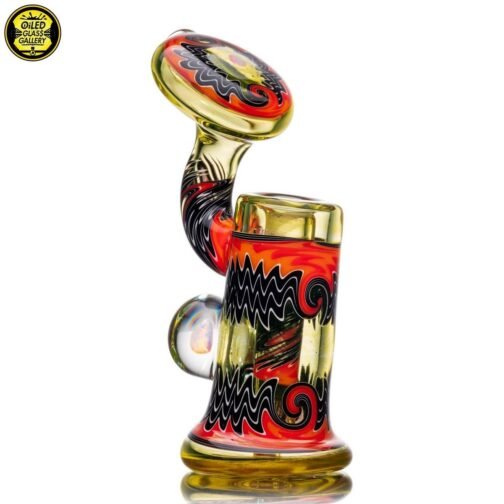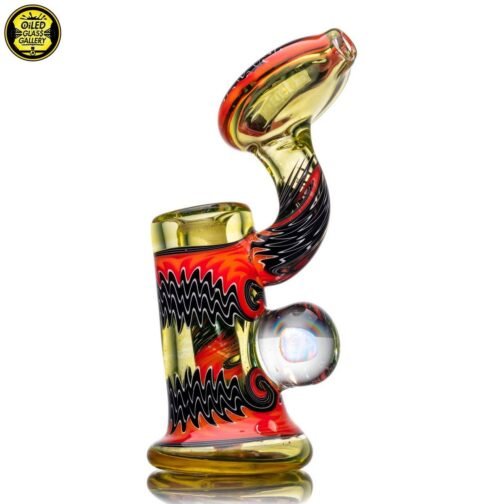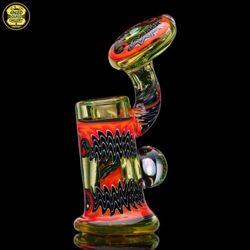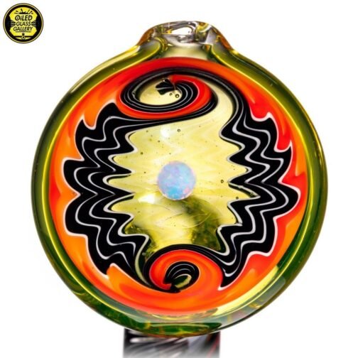 2021 10mm 5.5in Bubbler made of Molten Aura UV Citrine and wig wag sections featuring an encased tumbled opal mib mounted on the back and an encased opal on the mouthpiece. Comes shipped in a Black Apache 1800 case.