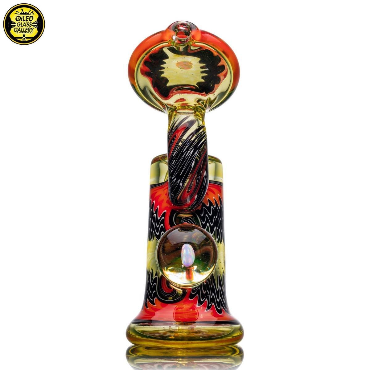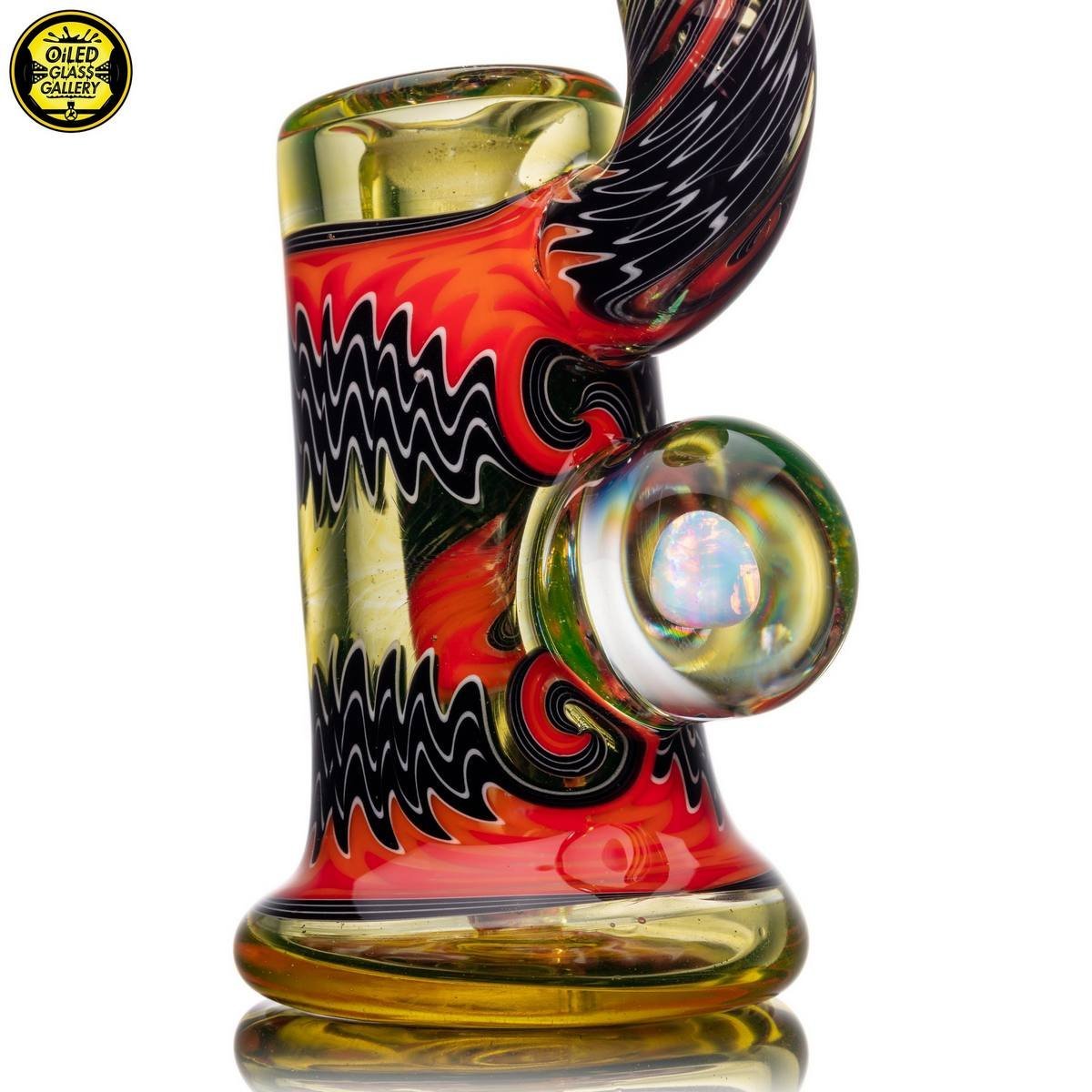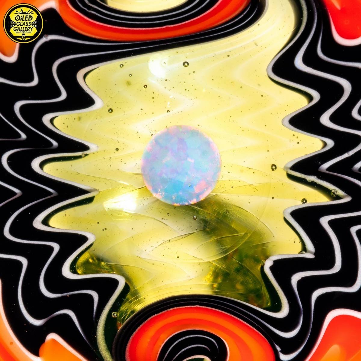 2021 10mm 5.5in Bubbler made of Molten Aura UV Citrine and wig wag sections featuring an encased tumbled opal mib mounted on the back and an encased opal on the mouthpiece. Comes shipped in a Black Apache 1800 case.