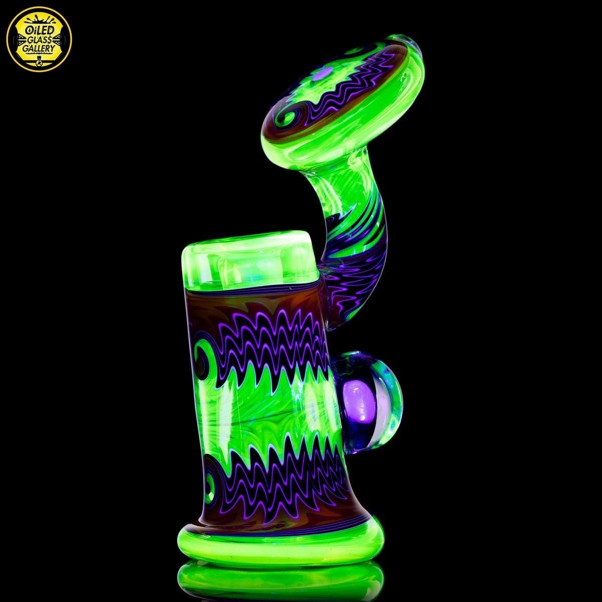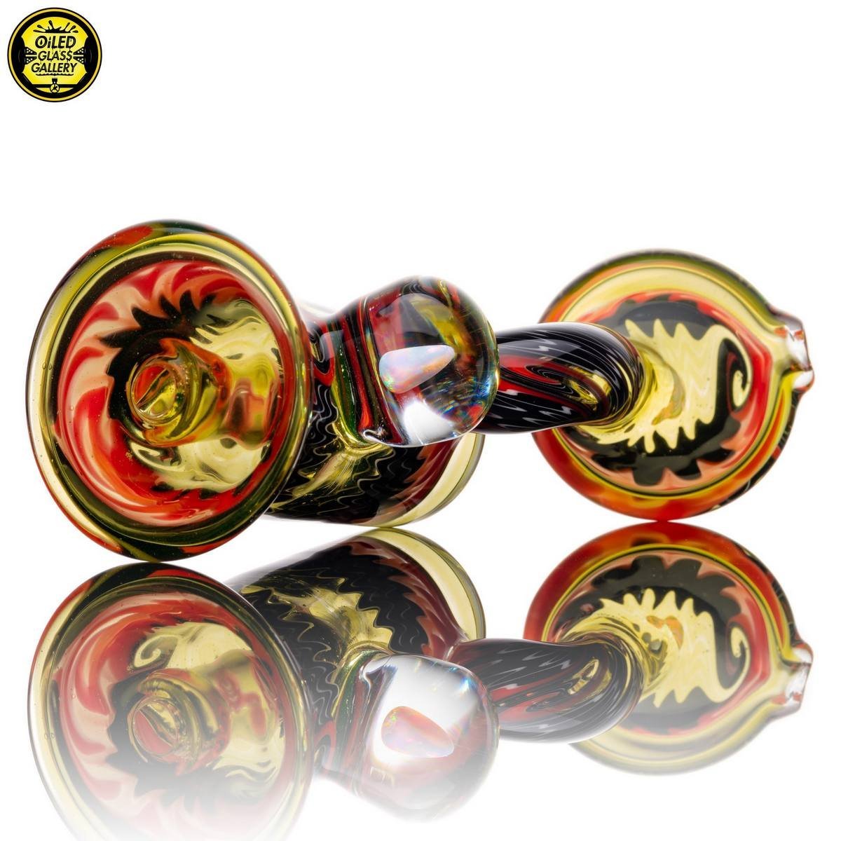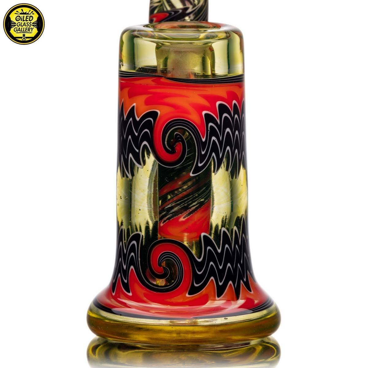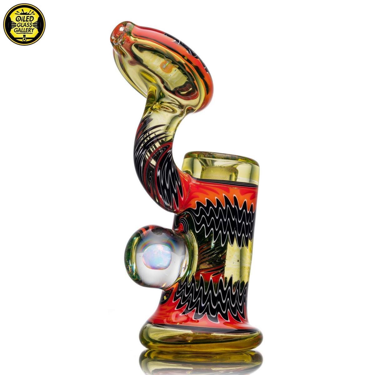 2021 10mm 5.5in Bubbler made of Molten Aura UV Citrine and wig wag sections featuring an encased tumbled opal mib mounted on the back and an encased opal on the mouthpiece. Comes shipped in a Black Apache 1800 case.