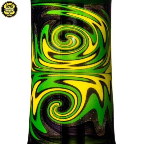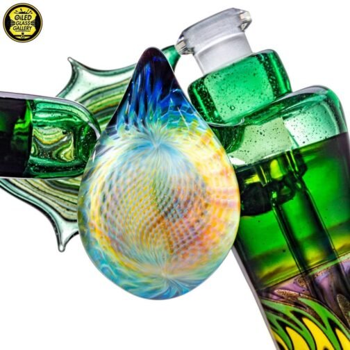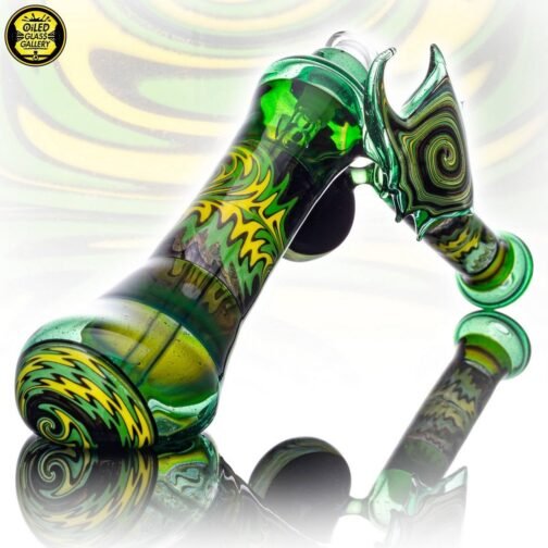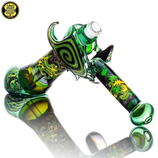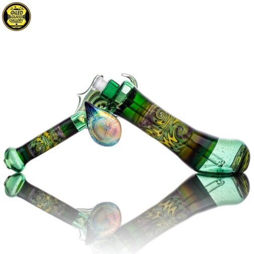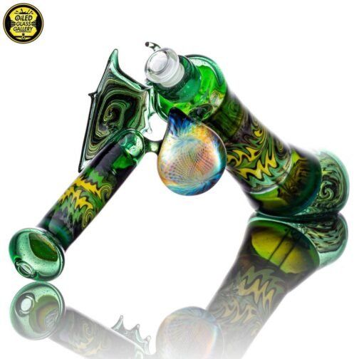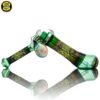 2021 10mm 10.25in Wig Wag Hammer Bubbler set made with Trautman Art Glass Green Stardust and Green X sections. Features a fumicello mib and comes with a 3-hole removable downstem.