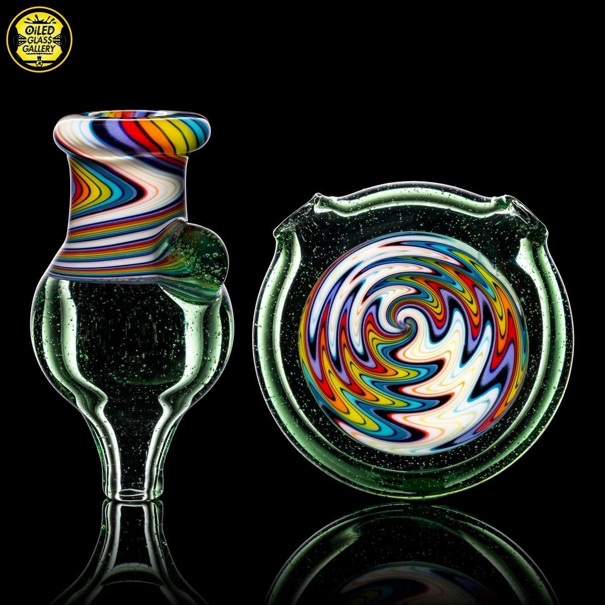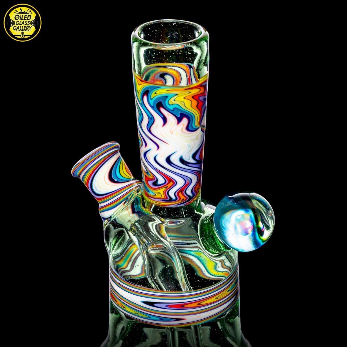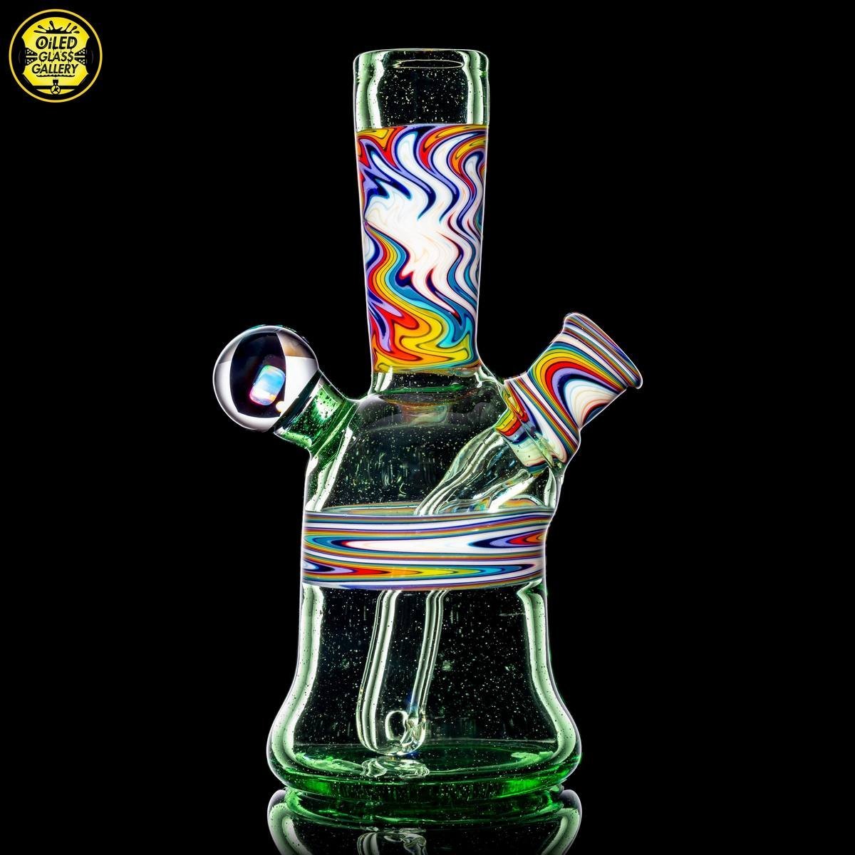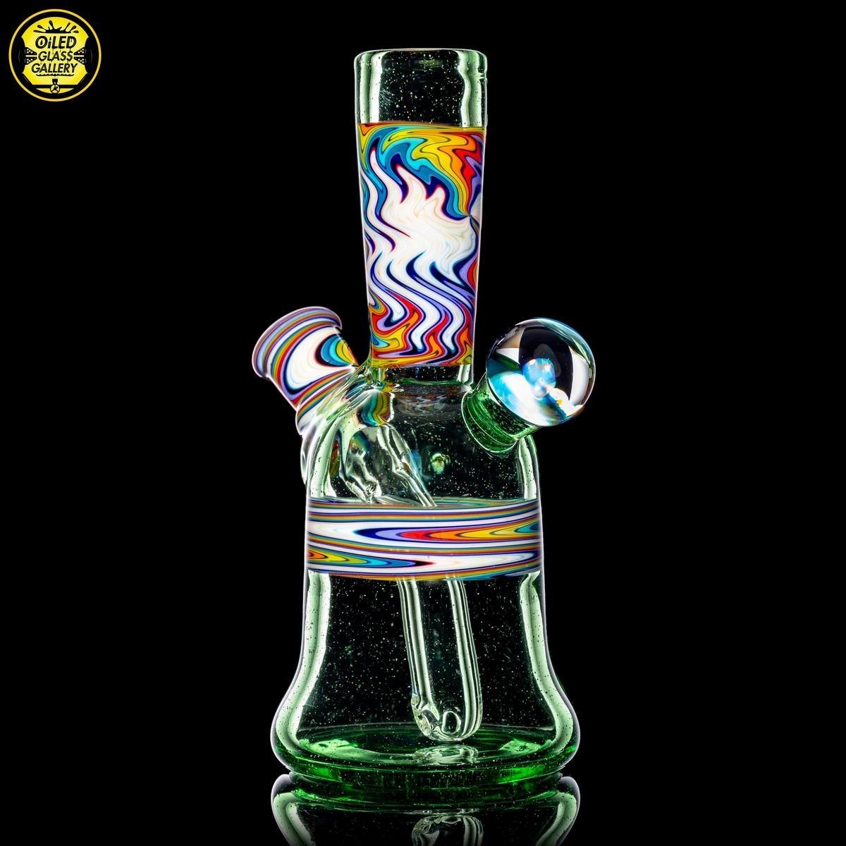 2020 10mm 5.25in Wig Wag Tube set made of Glass Alchemy Hateraid and Rainbow with White linework sections. Features an encased Profound Glass opal mounted on the back, a matching bubble cap, and a pendant.